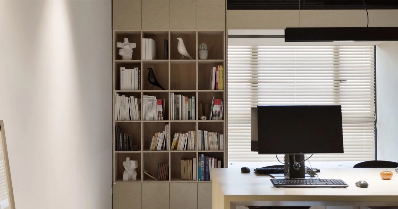 在都市的喧嚣中,设定一份别样的办公情境,满足现代人对情怀的个性化追求。南向墙面的整面墙体的书架一直贯穿到二楼,一楼窗户做成飘窗,二楼栏杆。黑匣子解决空间的垂直交通,楼梯以下的空间置入了储藏间,内向景观等,作为整个空间的大体量,除了楼梯入口的开孔,在几个侧面用分割和穿透的方式让黑匣子在不同角度呈现出一定的变化。