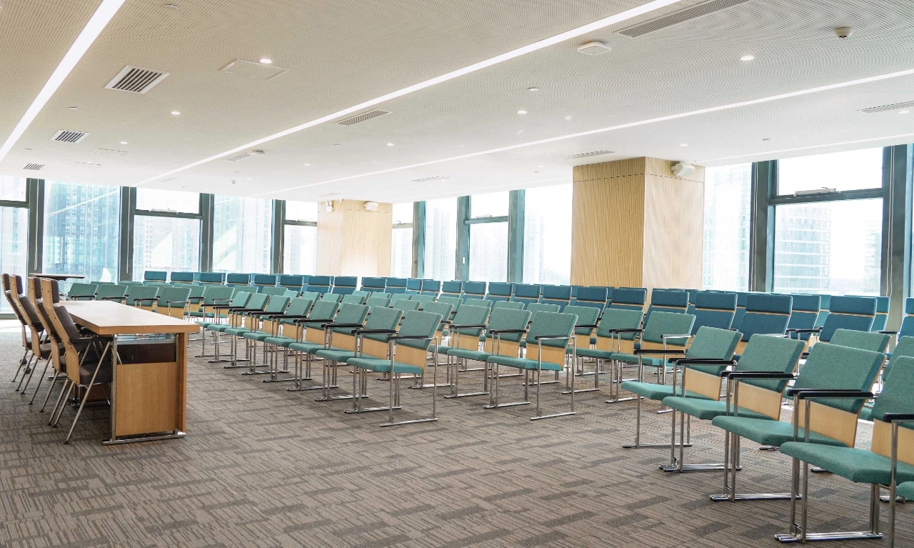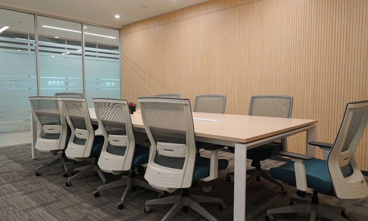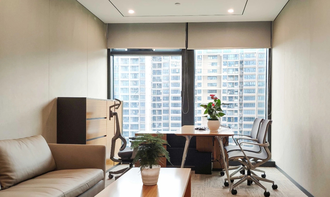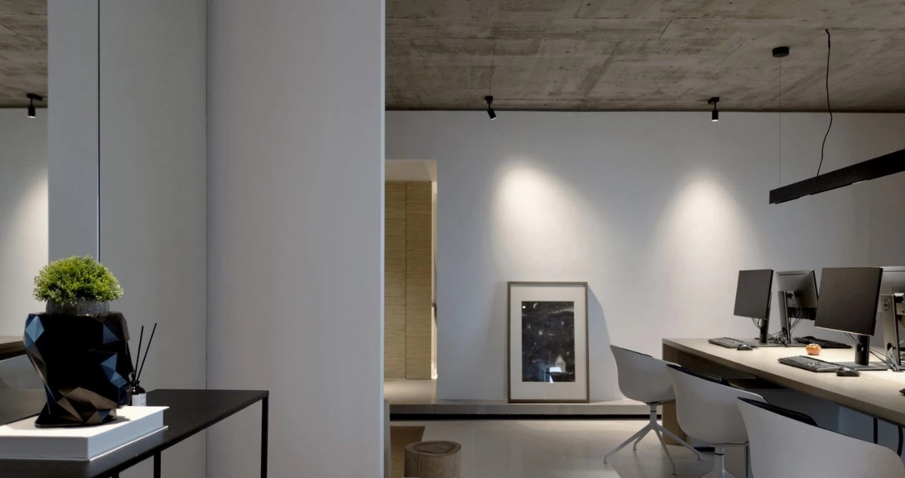 开放办公区的光照采用线性光源与落地窗的通透感相辅相成。这一设计有效避免了原本只有3.4米的层高带来的空间的压抑感,并保留了大空间延伸出的视野开阔性。沿着空间轮廓及内部流线,我们将绿植渗透至每个角落,绿景弥散平衡了其中的硬朗感,增添空间情韵同时营造出深入“室内园林”的景观效果。办公的核心设计,是要进行恰到好处的“留白”。在为数不多的色彩与装潢中,在打破局限、创建趣味与高效的同时,予人以“放空”。即使身处钢筋水泥的城堡,也可回归“灵性与人性”的和谐。