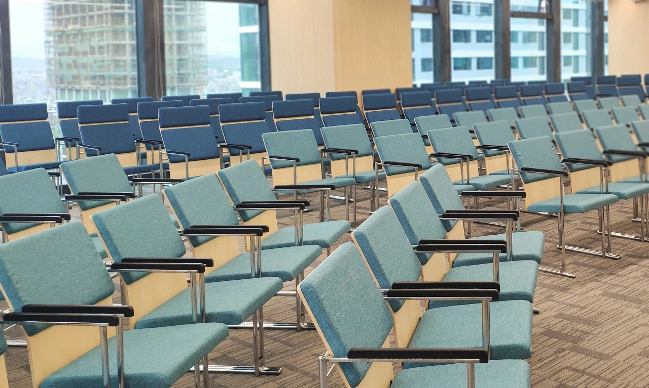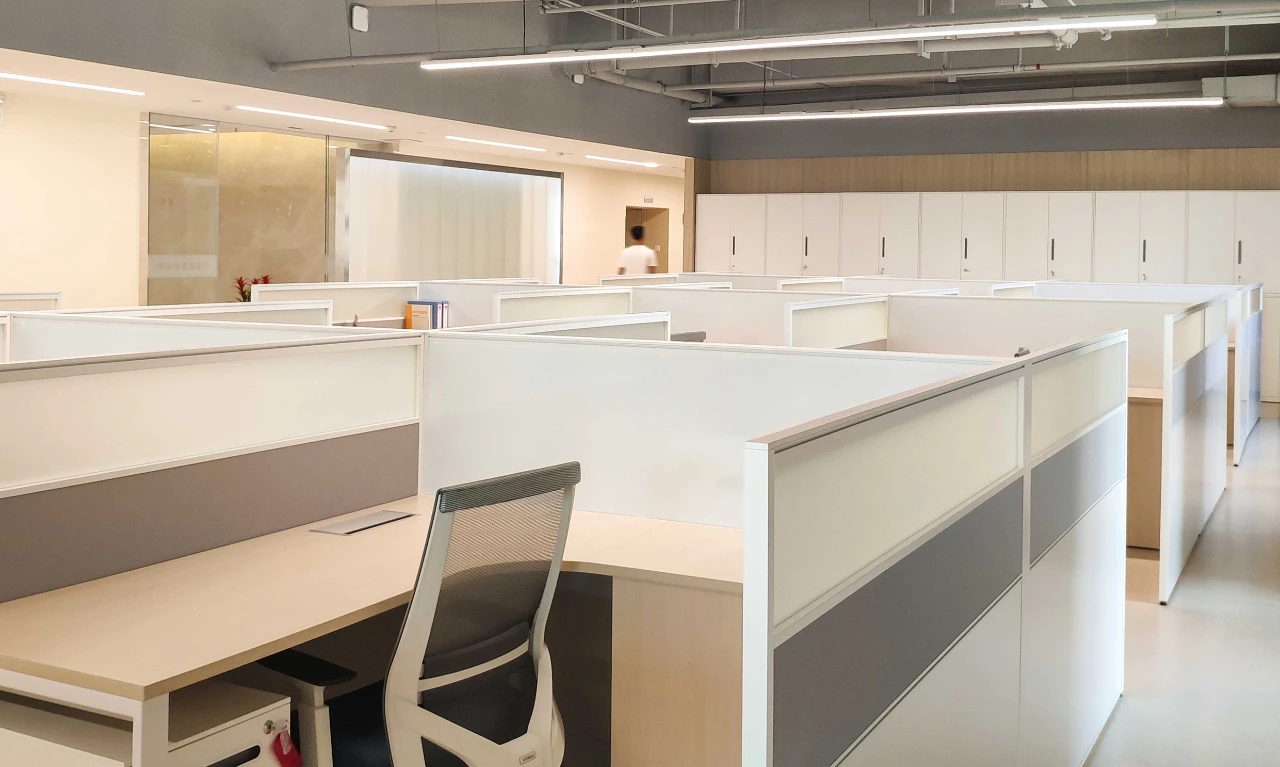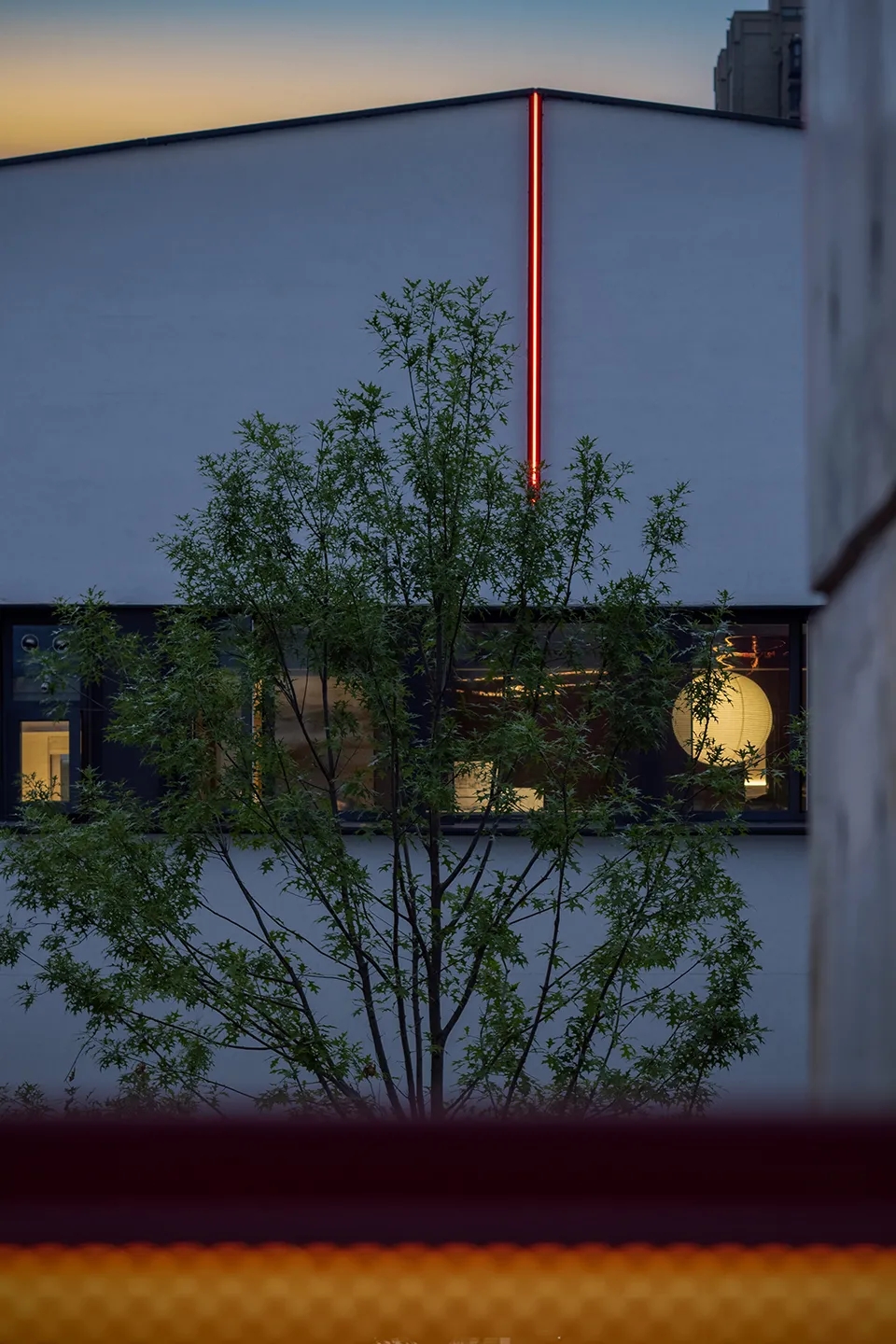 开放办公区的光照采用线性光源与落地窗的通透感相辅相成。这一设计有效避免了原本只有3.4米的层高带来的空间的压抑感,并保留了大空间延伸出的视野开阔性。沿着空间轮廓及内部流线,我们将绿植渗透至每个角落,绿景弥散平衡了其中的硬朗感,增添空间情韵同时营造出深入“室内园林”的景观效果。办公的核心设计,是要进行恰到好处的“留白”。在为数不多的色彩与装潢中,在打破局限、创建趣味与高效的同时,予人以“放空”。即使身处钢筋水泥的城堡,也可回归“灵性与人性”的和谐。
