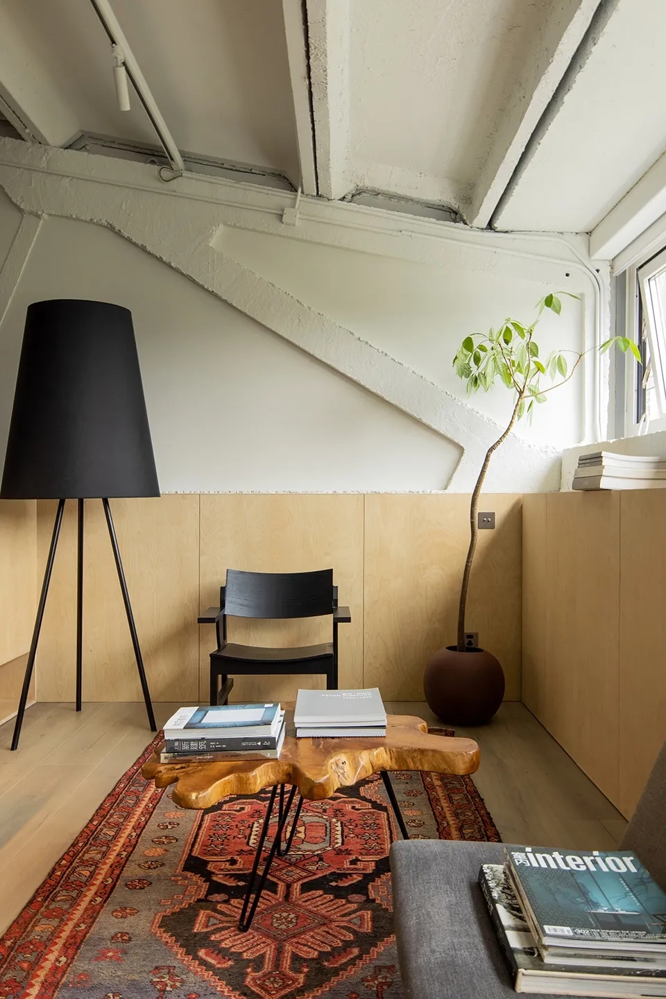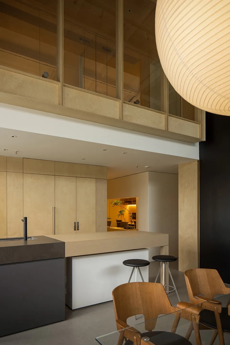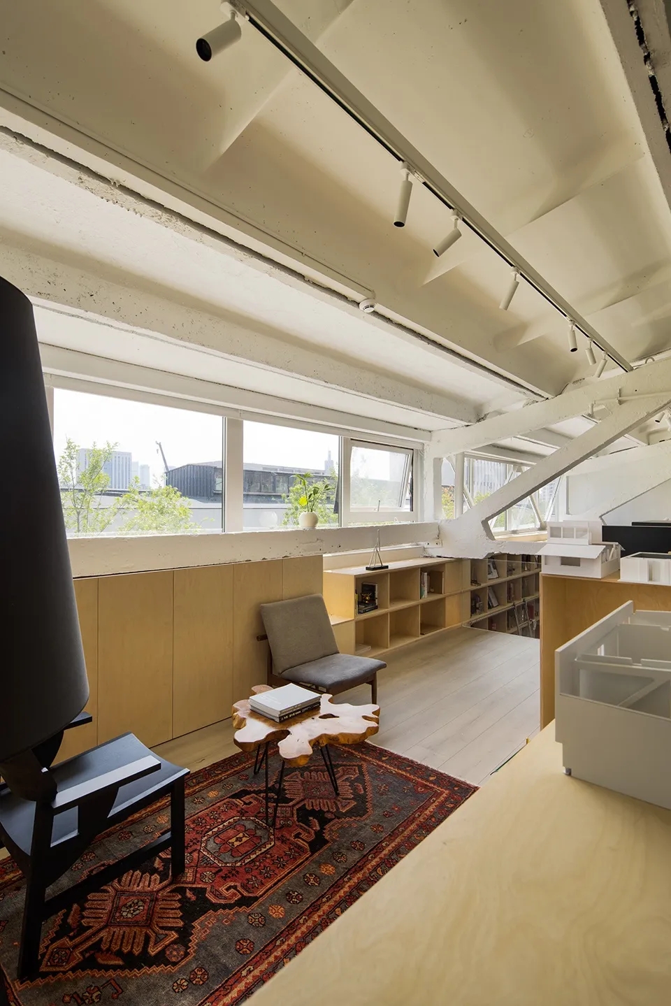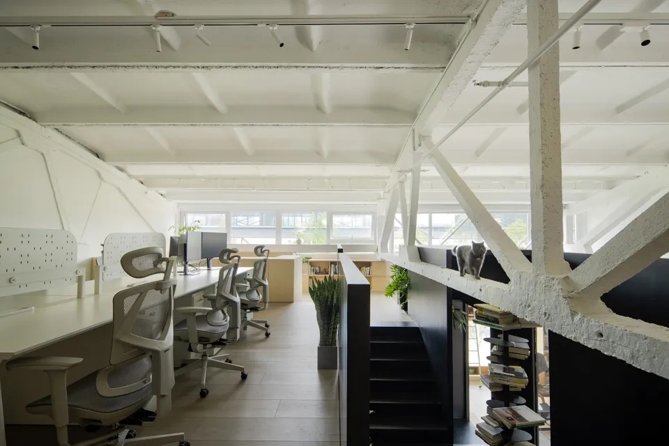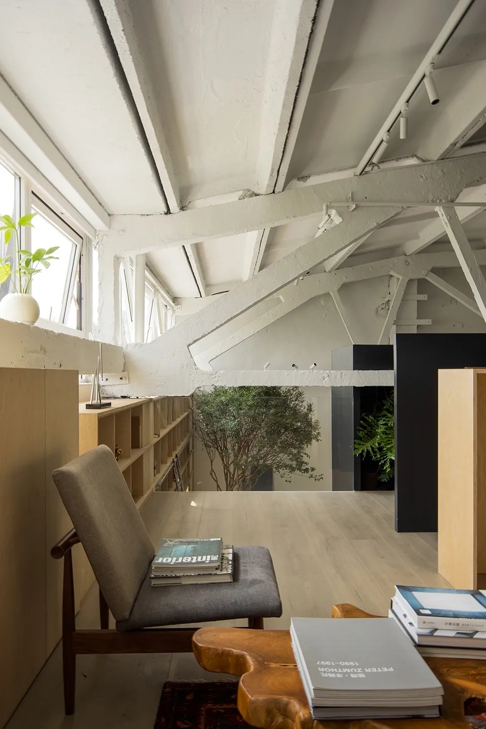 大面积使用桦木板,在墙板柜门上形成统一化的视觉语言,原始结构和顶面白色乳胶漆形成空间的留白。接待区是办公室中唯一挑高的区域,配合原始厂房的结构和肌理,营造轻松和随意的氛围。休息区的大树,打造植物和空间的共生体,一个舒适的有氧循环系统。