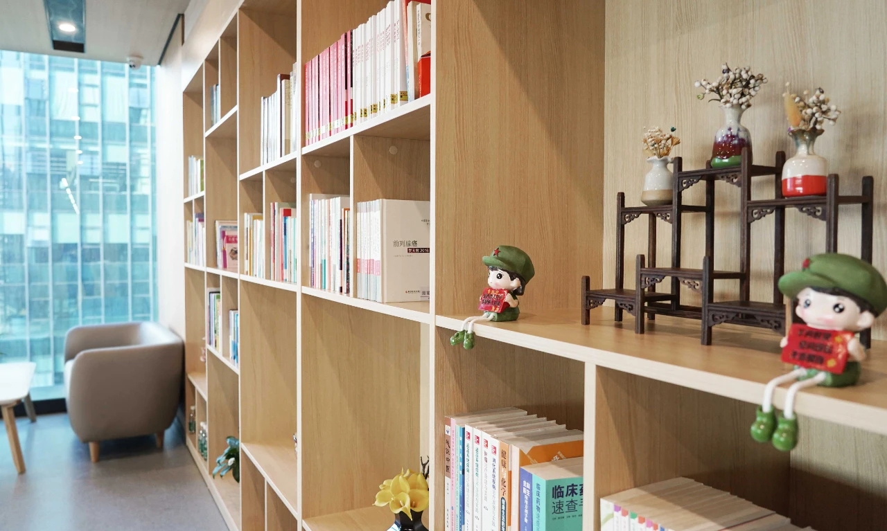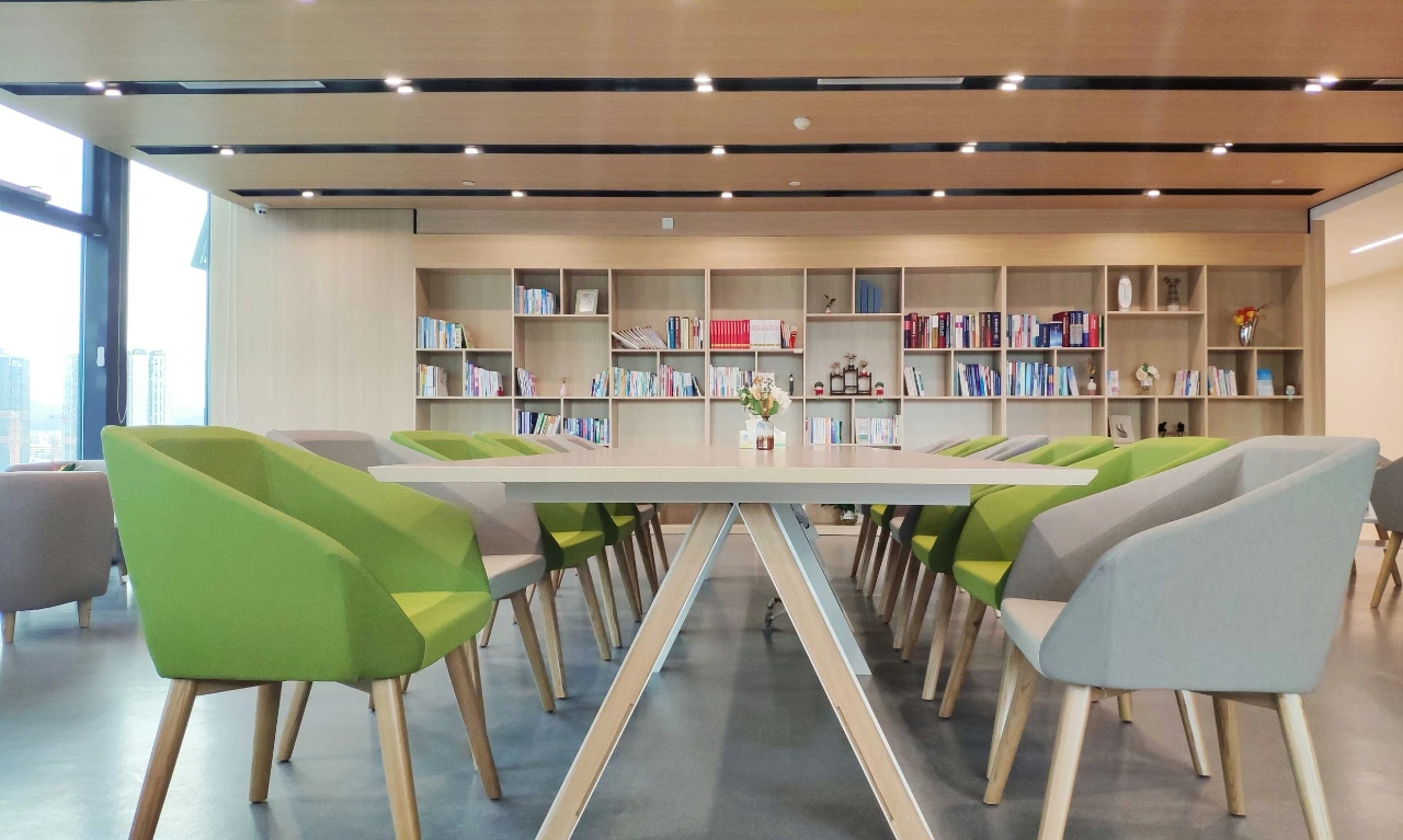 内容上聚焦功能,阐释美学的当代设计表达。一楼上来的楼梯内部为双向走向,书架造型分流的同时隐喻知识的支撑力量。二楼休息通过柜体的围合创造出一个相对独立的区域。在办公环境融入造型设计,打破普通的空间体态,开阔的空间和不拘一格的建筑结构,带来轻松、自然的体验感。