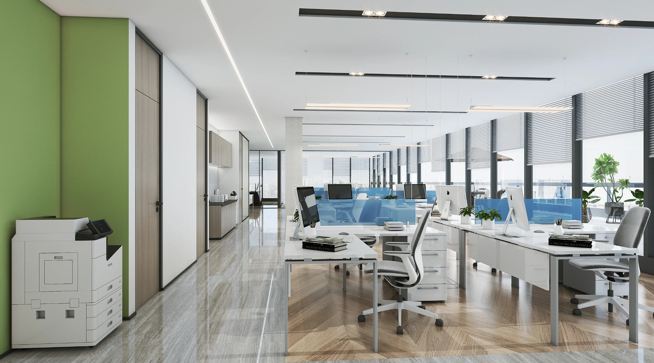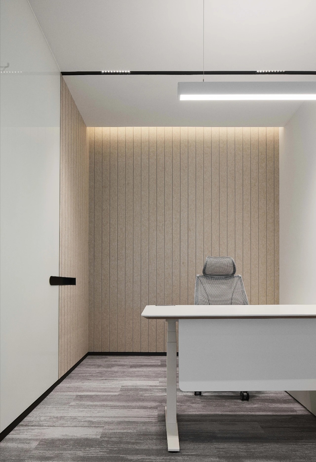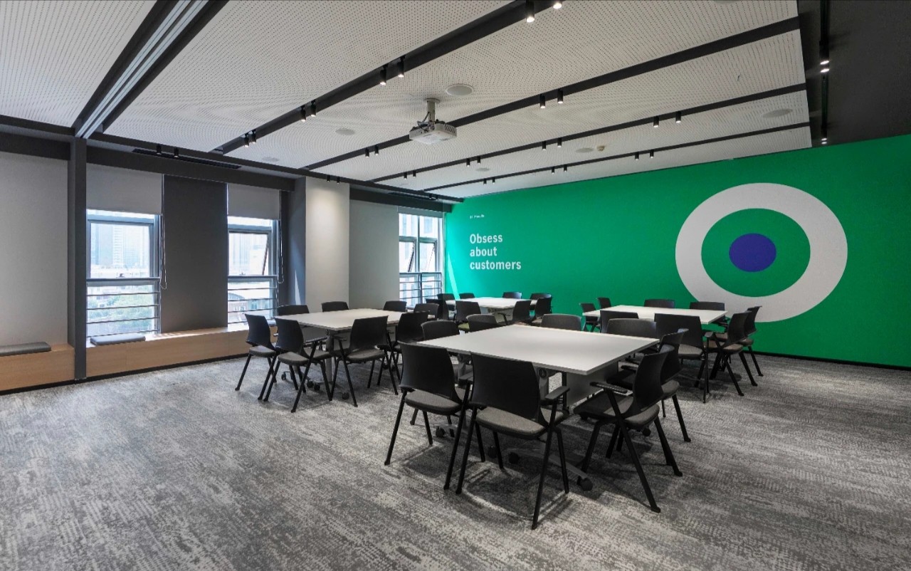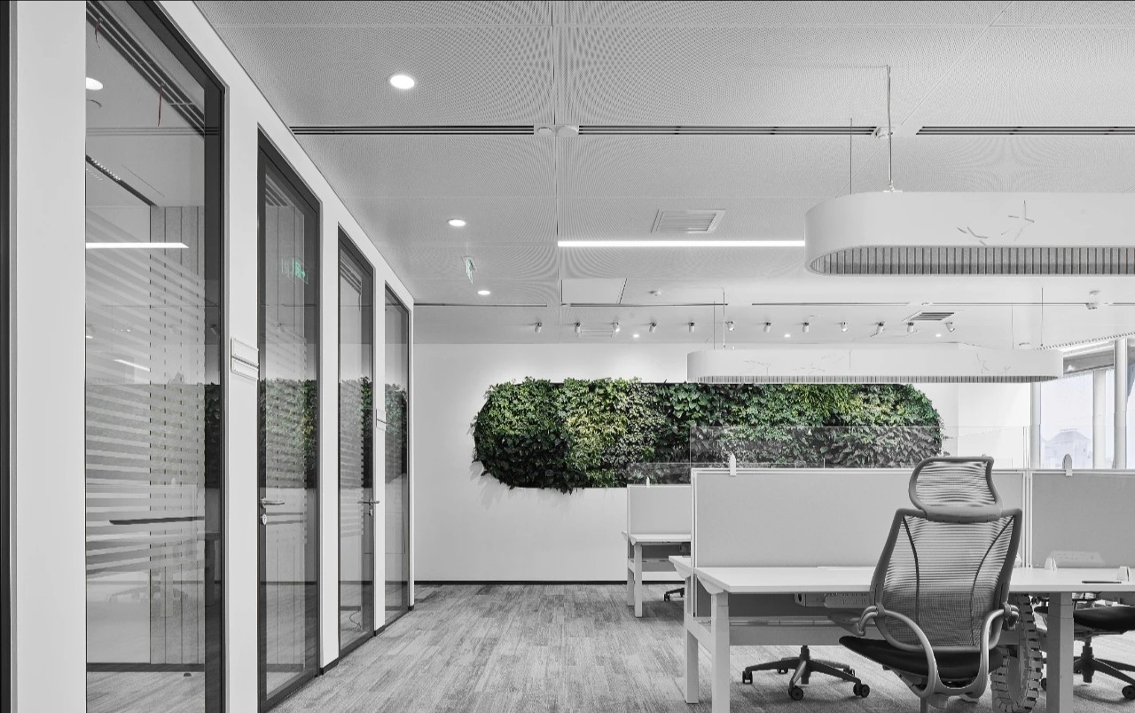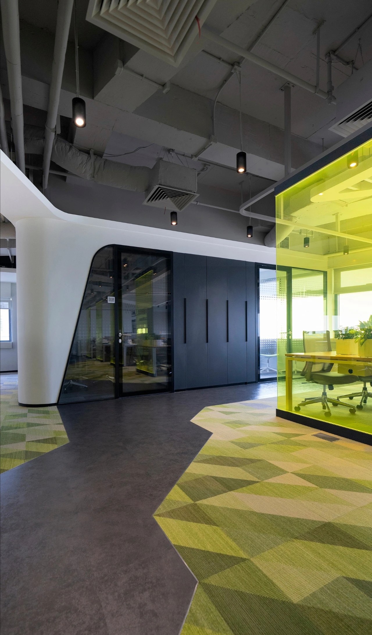 与波士顿科学的整体形象一致,办公室非常明亮,充满活力,在材质上包含对比: 原始的混凝土,彩色玻璃和光滑的白色表面上点缀着绿色。