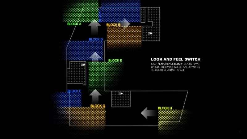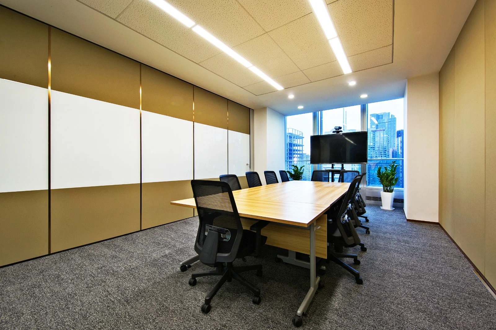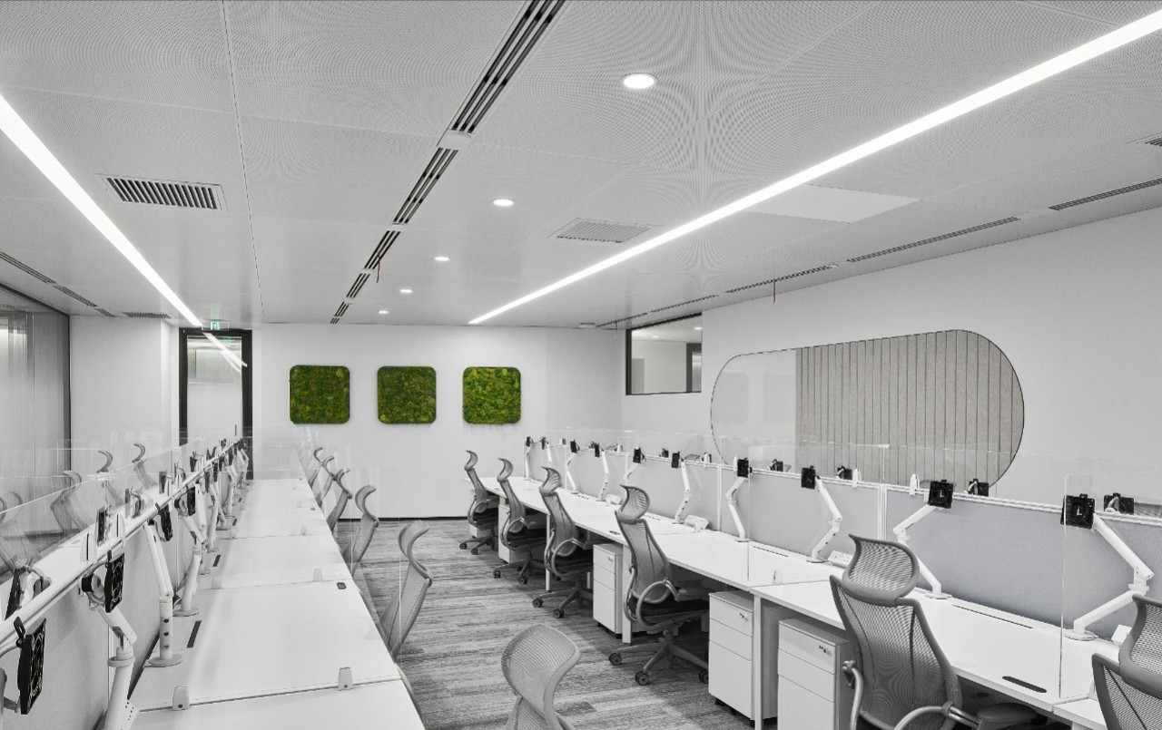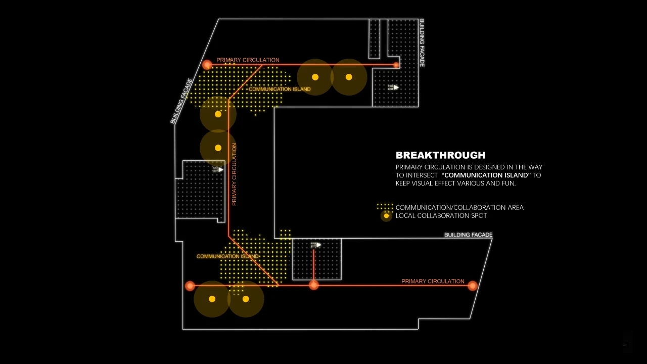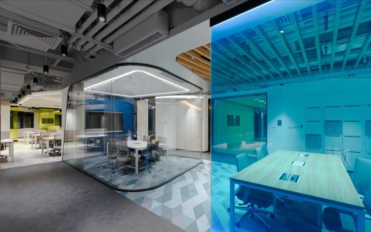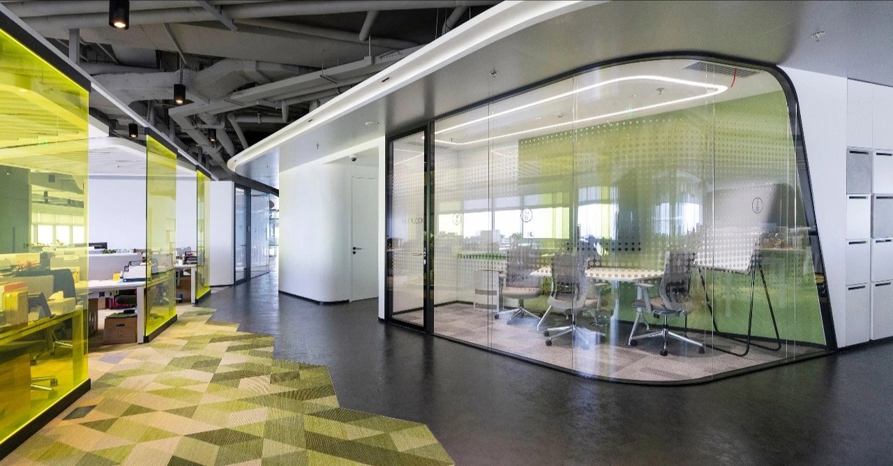 办公室的中心部分被称为“社交桥梁”。它包含了一边对公众开放的空间和另一边为合作而设计的区域。这些是员工们每天见面交流经验的地方。在开放空间工作区的旁边还有一个次要的协作区域,用于项目团队成员之间的快速会议。以这种方式划分敏捷空间,为项目团队成员提供了更多的隐私,同时也让人们在必要时能够顺畅地交流。每个开放空间的工作区域都由彩色可移动的玻璃隔墙封闭在主通道外。它们有多种功能: 使开放的办公室更加私密,在简短的会议中为做笔记和产生想法提供额外的空间,同时保持空间的透明和开放。