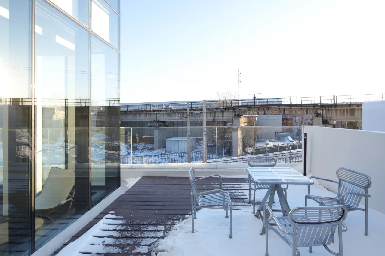 改造后,东侧新增一挑空多功能区,其外立面下半部分由实墙改为落地窗,上方原始开窗则被封闭起来。开洞位置的改变在保证室内光线充沛的同时,与窗外花园景观的视觉联系也更加紧密。南向户外平台的矮墙被敲掉后,换上了玻璃栏板,人坐在露台上可以获得开阔且连续的视野,看火车徐徐驶过,享受片刻闲暇时光。
