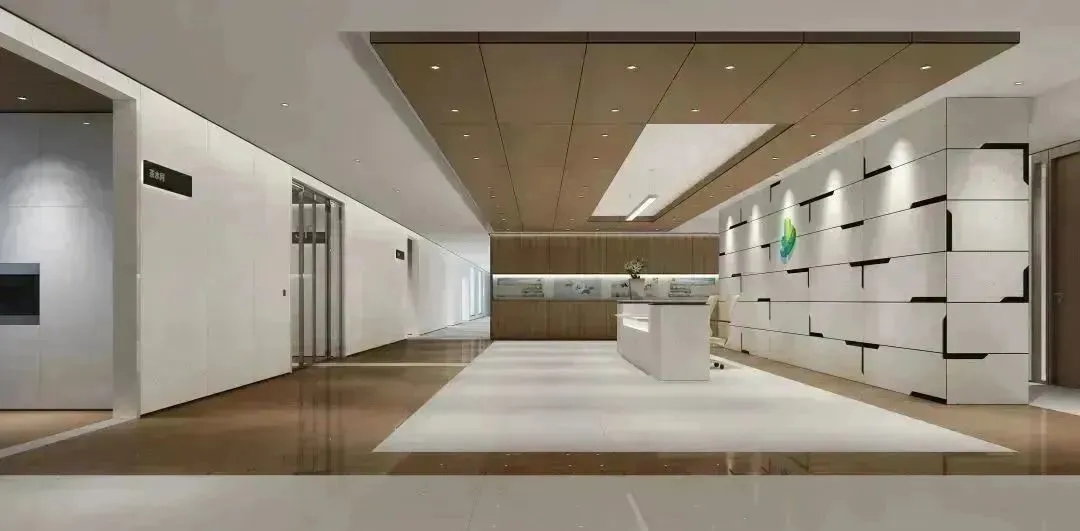 光影.线条感十足的办公空间赏析 ‖ 前厅的设计墙面采用钻石切割面设计手法,进口涂料一直从背景延续到会议区,前厅与办公区也设计了通透三角空间,线型灯光也是从前厅一直延续到会议区,增强线条感和统一性。