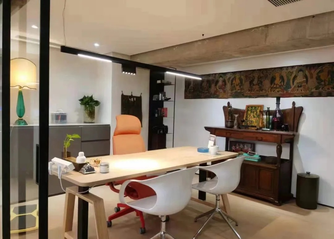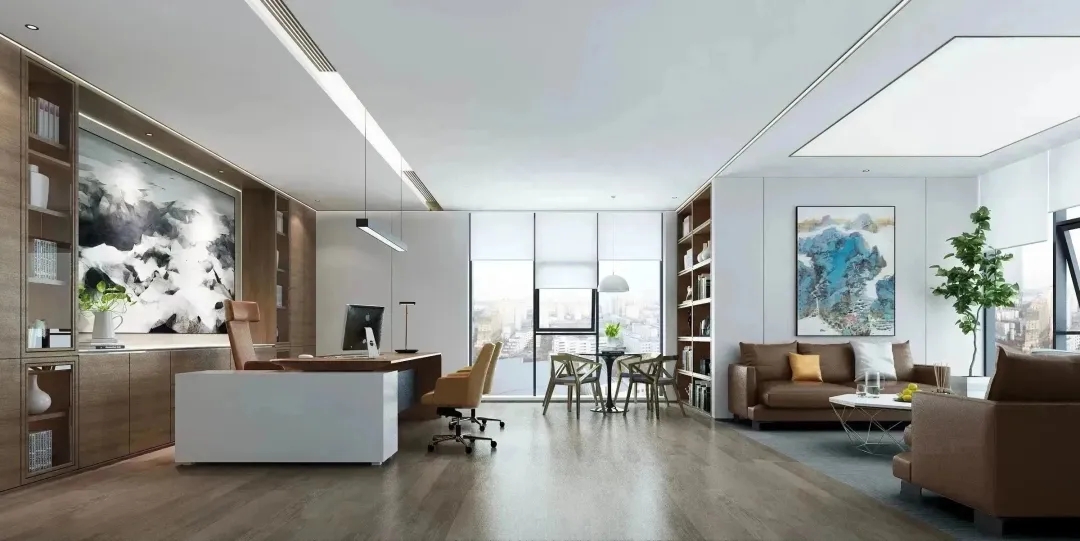老板办公室是按照灰调设计的,本身老板很年轻 所以我给的建议是高冷范,老板对风水有些讲究,必须选一副山水画,所以我们在设计的时候也是为了融合这幅画在柜子的展示设计上用组合柜的形式来设计来达到我们想要的设计想法。