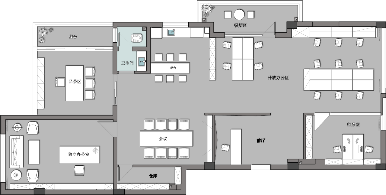 针对年轻化、时尚个性的性别与年龄趋势分析,对色调的控制也需要倾向于轻成熟的中灰度。基于办公空间需要的多形态及场景组合,独处与讨论,安静与喧闹,坚硬与柔软,设计师希望在矛盾中寻求统一。整体空间在材料使用上较为克制,每一种材料背后都希望指向一种独特的空间关系和与之对应的美学构筑。