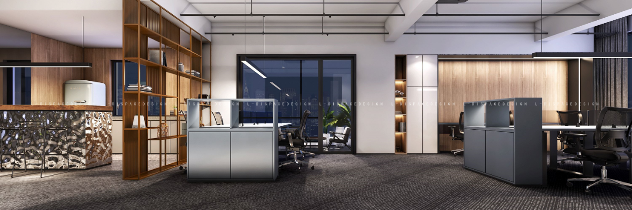 靠墙的卡座前面整面墙的木饰面,后期可以作为员工活动栏、公告栏,开放式办公区和水吧是相连的,通过金属书架作为通透隔断,其实就是为了释放整体的空间,让空间与环境与人融合,让员工对公司有足够的归属感,毕竟一个好的环境对员工的工作氛围是很关键的。