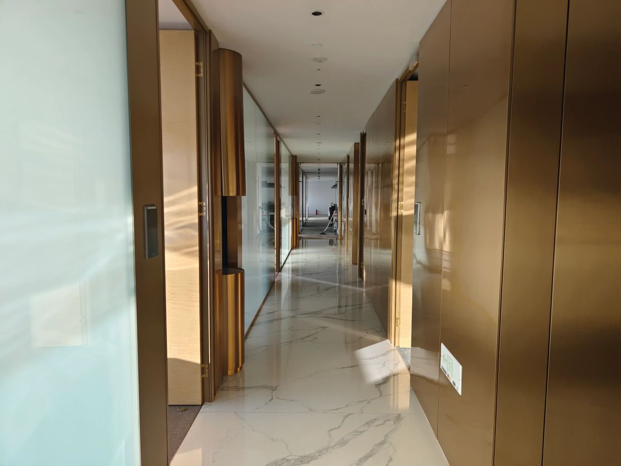 裸露的原始建筑水泥顶,展现出淋漓尽致的原始美,将所有管线隐藏于局部的悬浮吊顶内,悬浮吊顶之间的管线用工业不锈钢包裹,使得整个顶干净利索,既保留了工业风的粗犷又微微透露着现代风的细腻温柔。