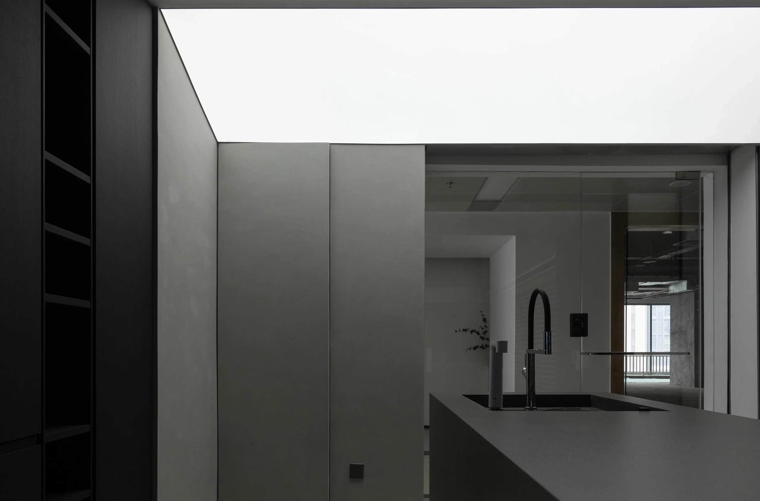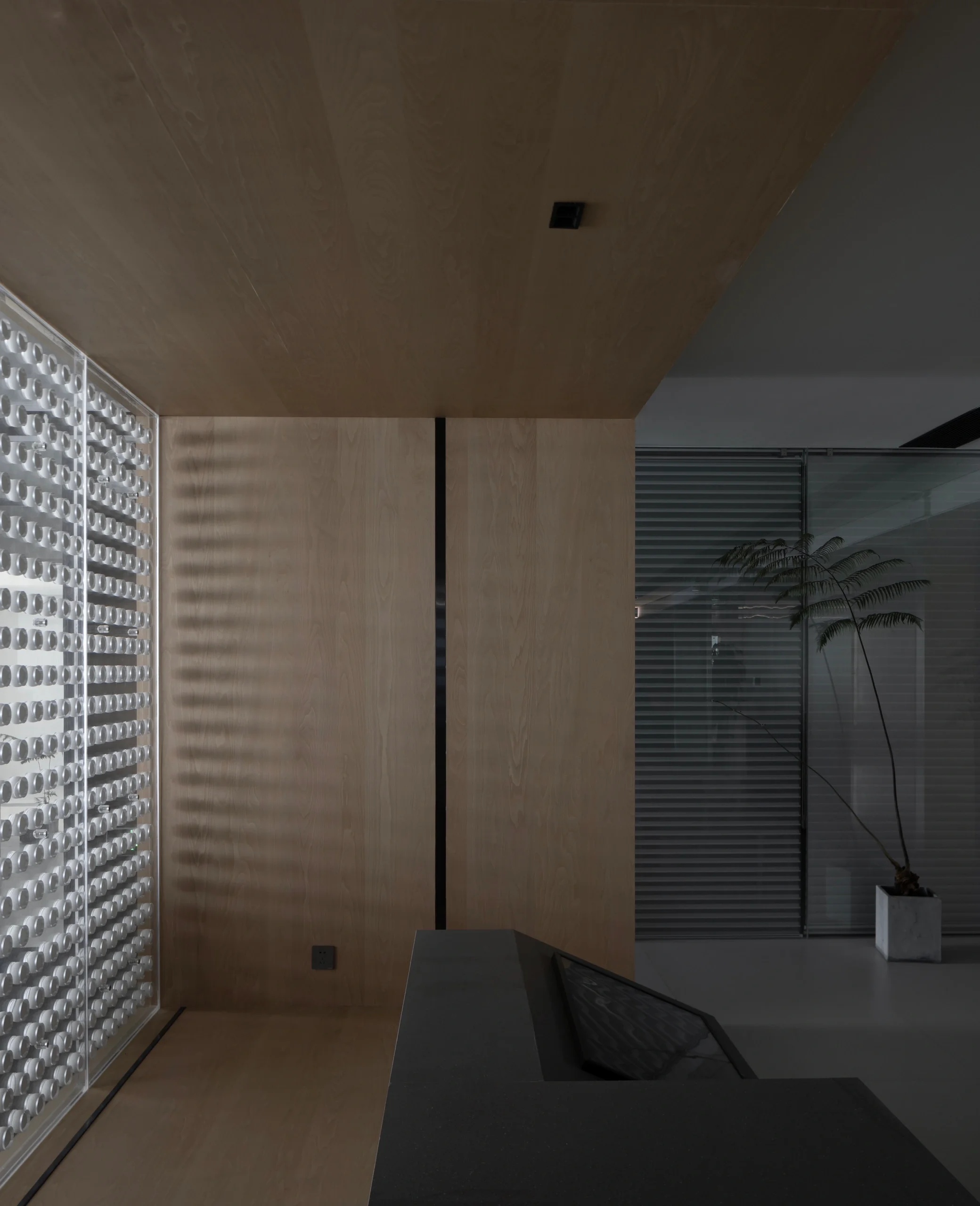 天、云、山和水叠层交错,在这意境中设计由黑金沙大理石做的矩形前台造型,采用天然石材的肌理、纹路和颜色赋予山石脚下积淀的力量。也寓意着犹如立丰律师事务所扎根武汉23年的历史传承,坚如磐石。