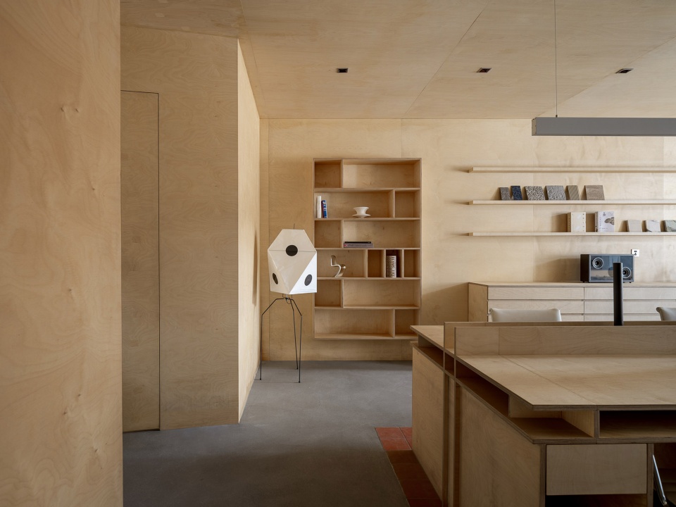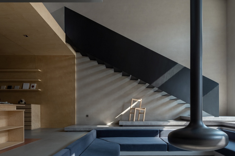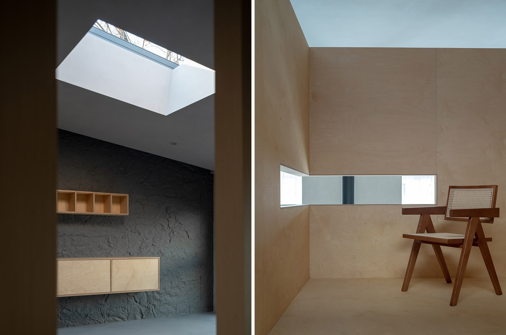 材料处理:对于新加建的空间体量我们采用了全桦木的海洋板和黑色油漆的钢板,尽量让其呈现的简单而细腻,而对于原始的墙面和地面,我们采用了浅灰色的微水泥。我们认为设计都应该保持克制,即使使用极其简单的方式与设计手法,也可以让形体和空间更加的纯净,更素雅,而又多变化。在这里,空间之间是可以存在无限变幻的。