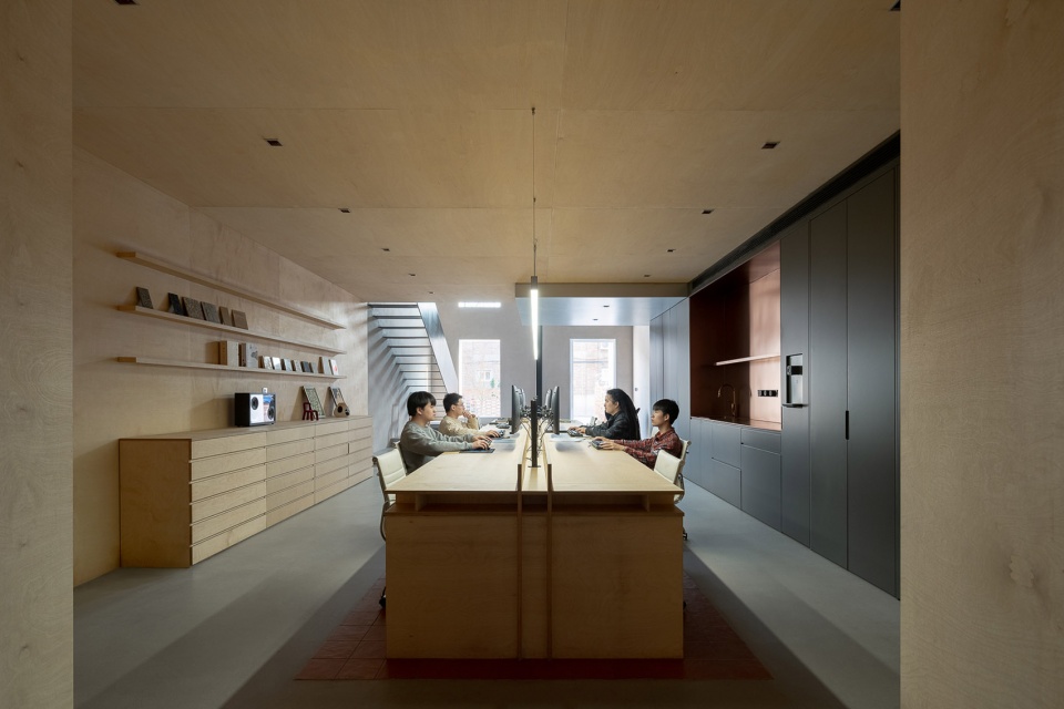 主要办公区设置在一楼,用不同于整体的地面铺装材料来区分了空间的功能,左边为办公辅助和水吧台,右边作为材料展示区和阅读区,中间则为公共办公区域,在动线上使得整体动线呈回字形,方便了工作人员的流动与沟通。