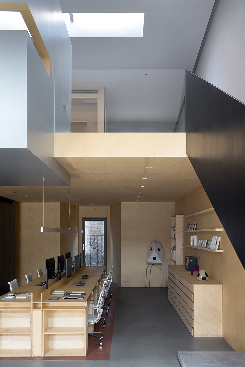一层最里面用两个不规则几何体将空间分割开来,左边为工具房,右边为卫生间,中间则为玻璃门,这样让后院的自然采光很好的引入到室内空间之中。二层的空间功能主要分为会议室、接待室、休息室。其中“小盒子”作为休息室来使用,给办公晚归的人员提供了私密的休息场所。