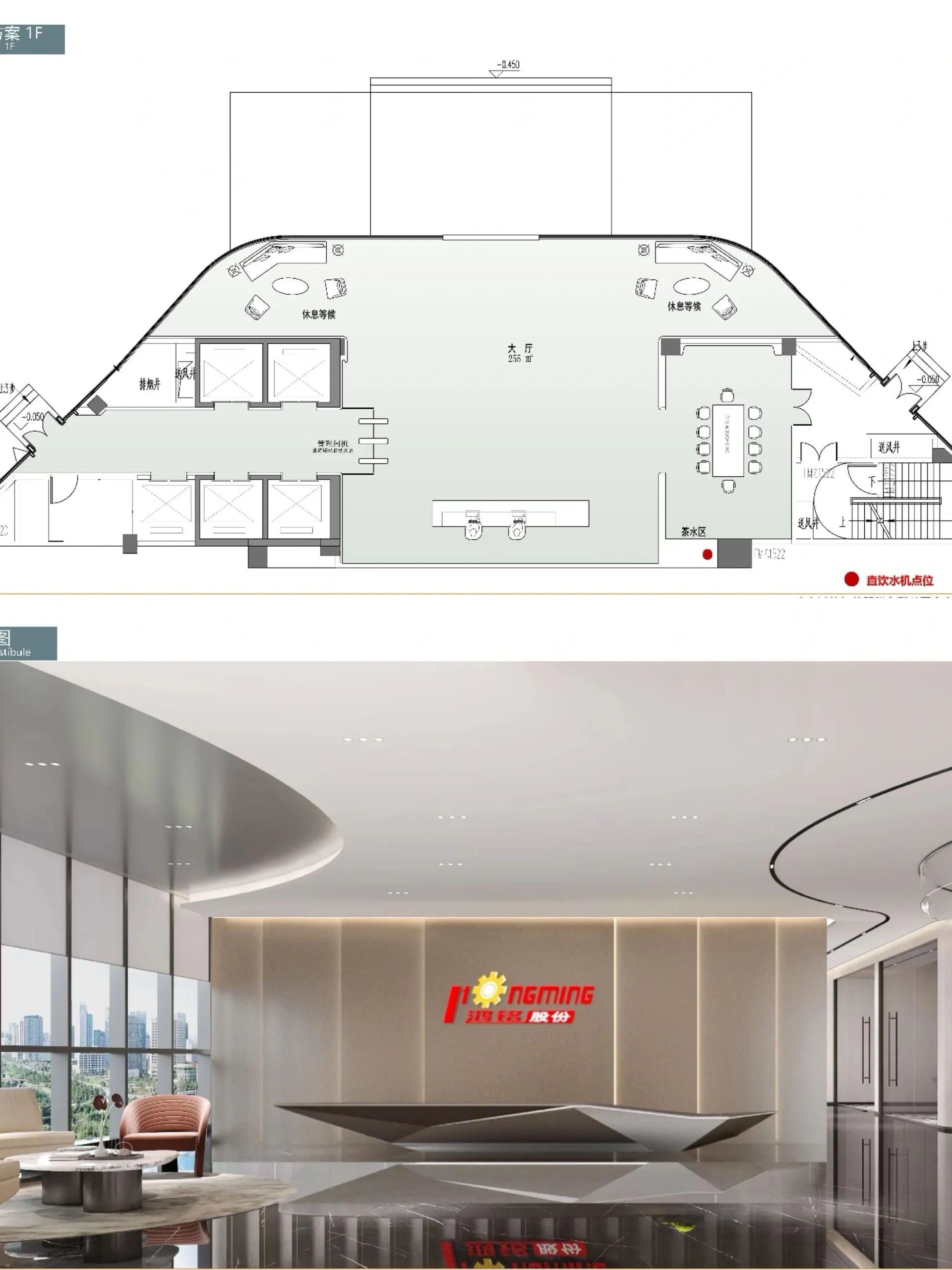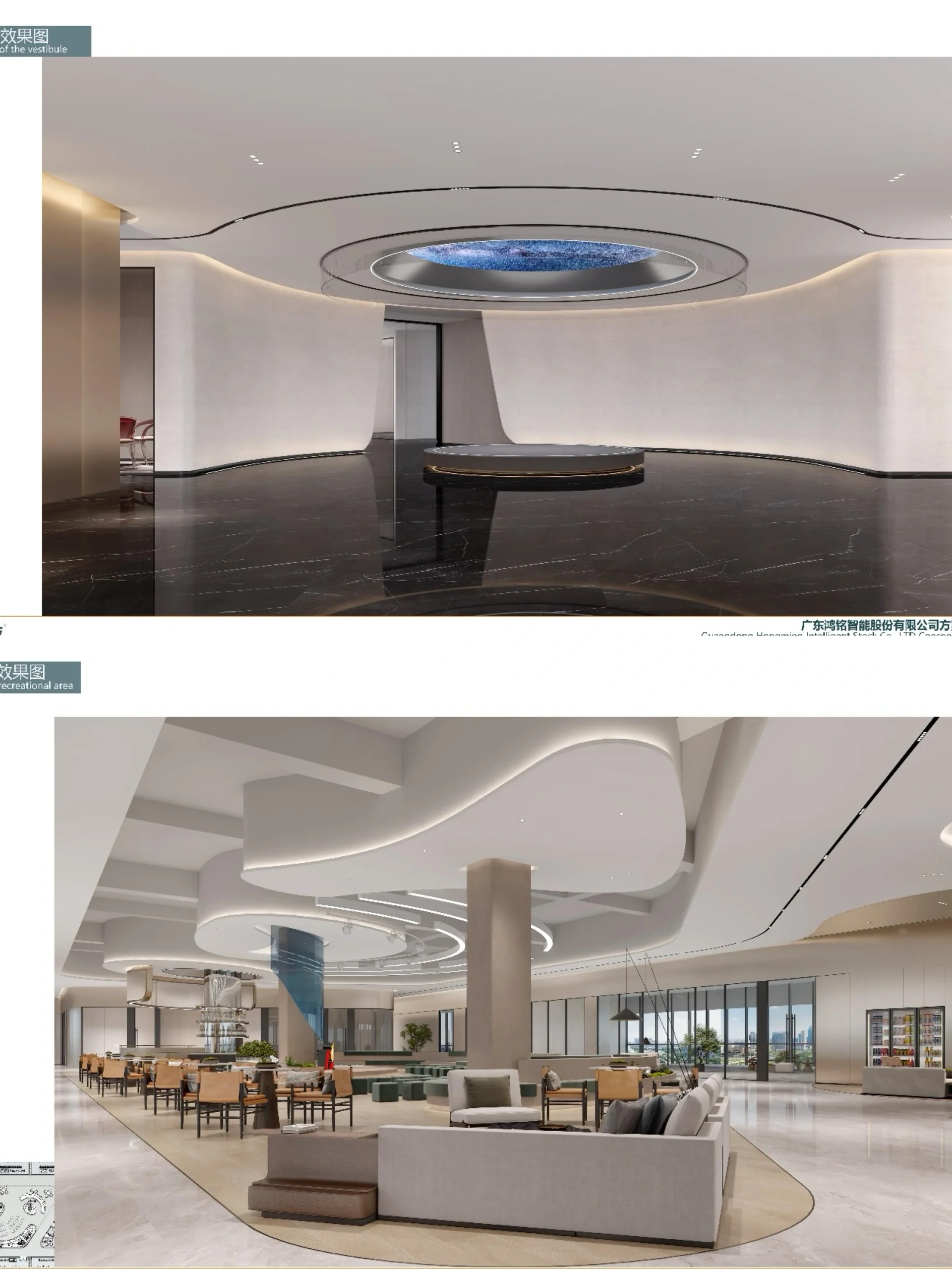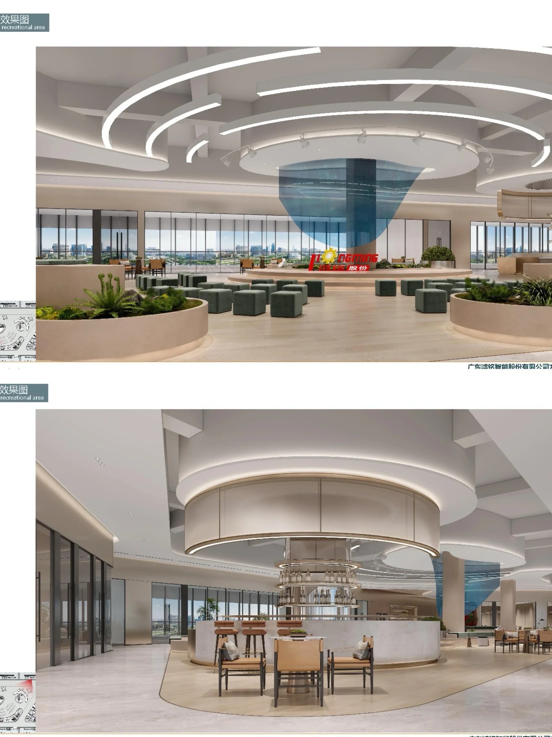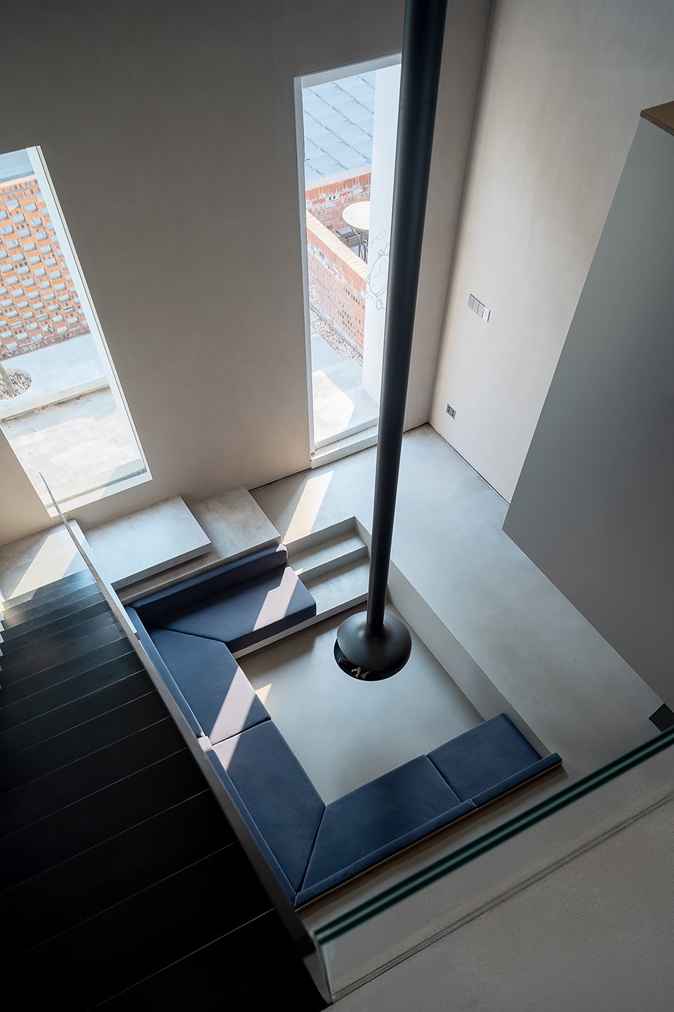 进入工作室会先经过一个小的围合式的景观庭院,我们通过透景的设计手法,很好的将室外景观在视觉上延申至室内空间中。入户右手边利用了高差的设计手法打造出一块下沉式的交流及休闲空间,使整体空间更加富有层次感,也能实现空间转换与功能区域之间的错落感。