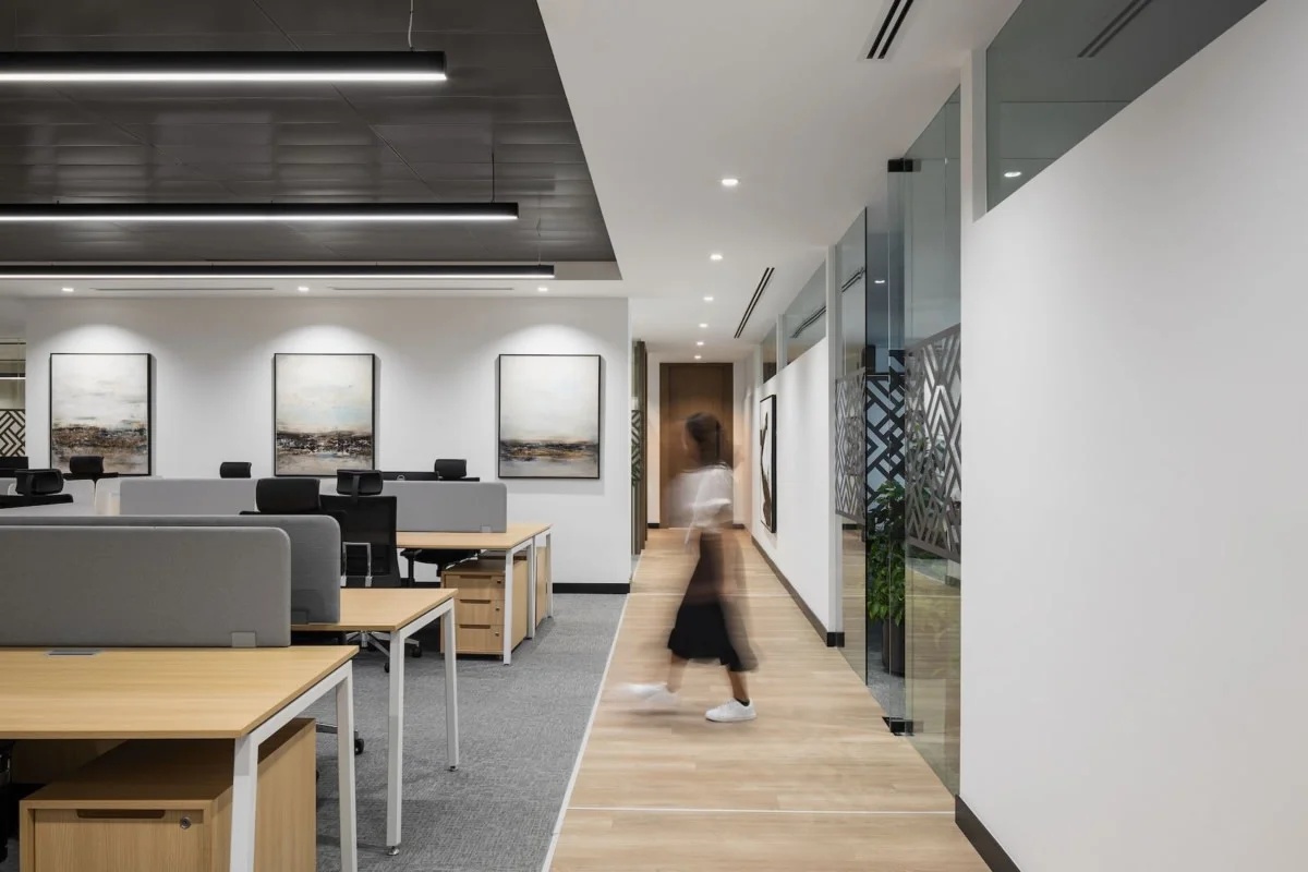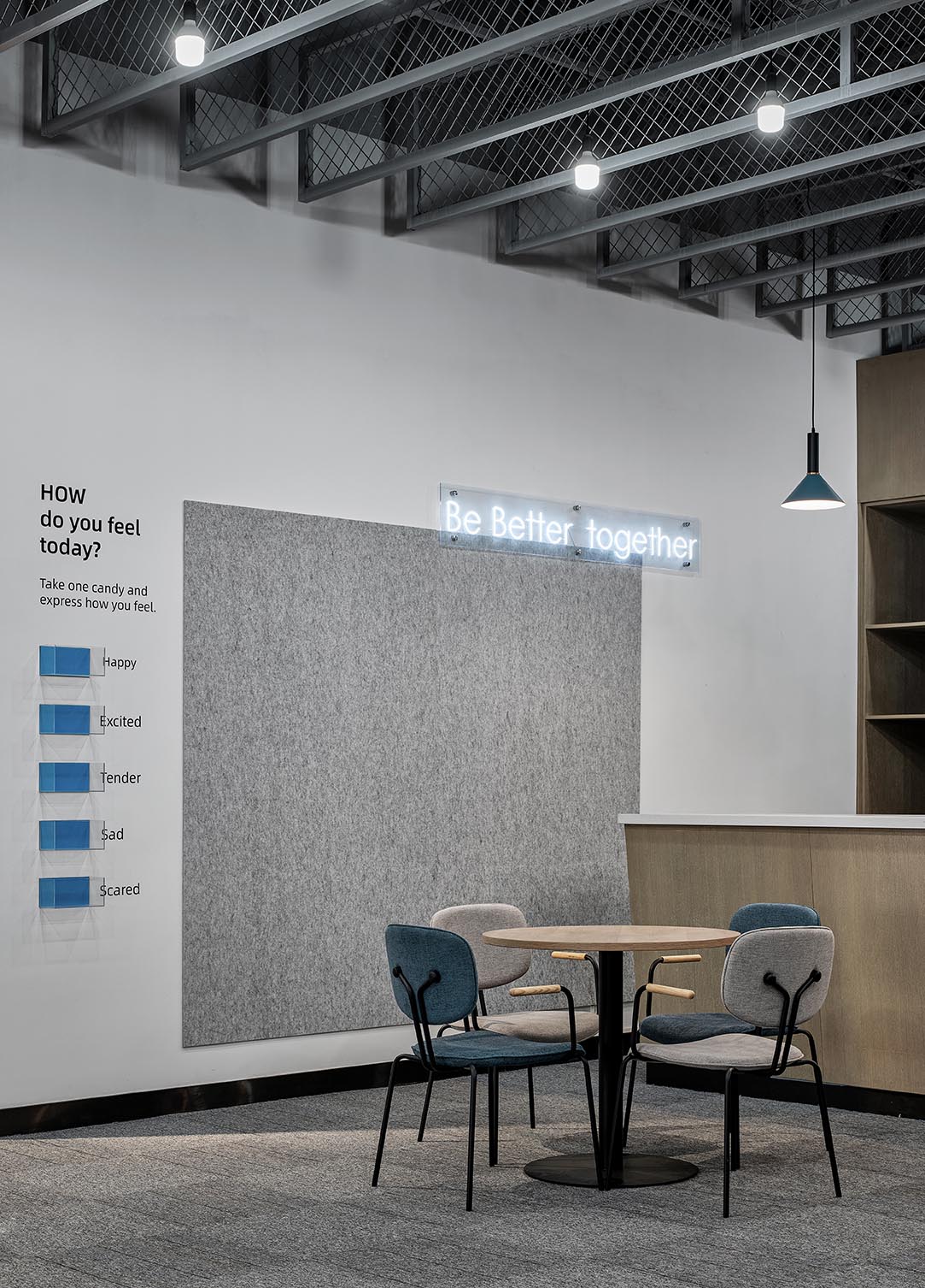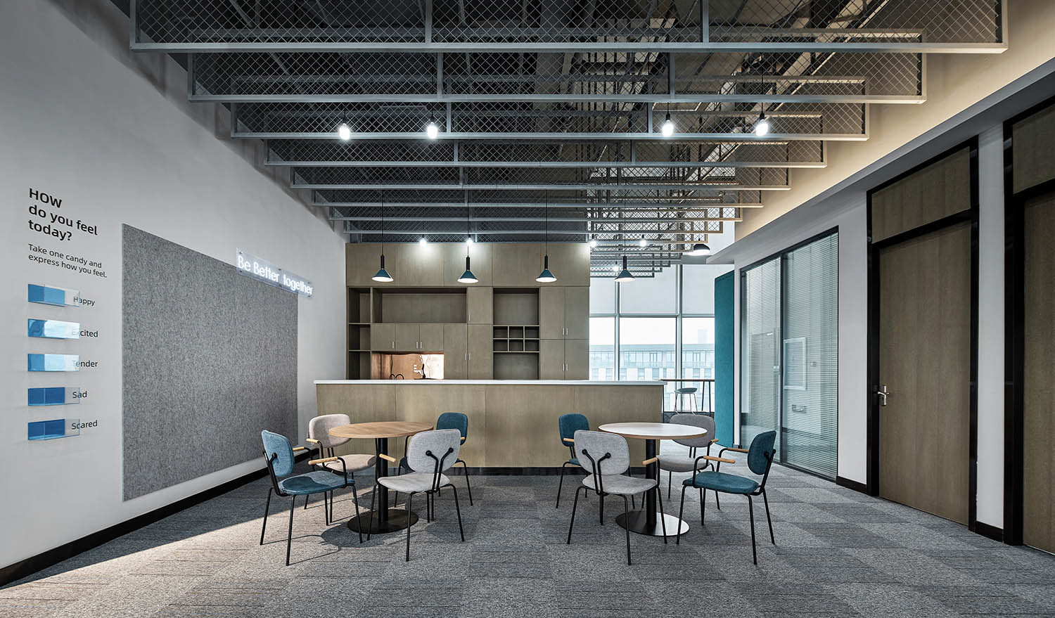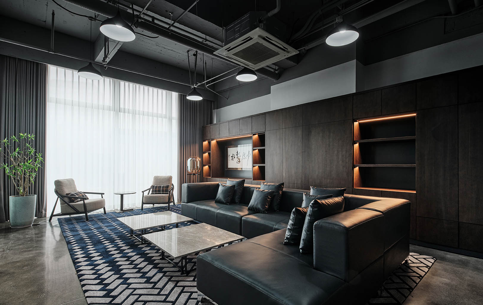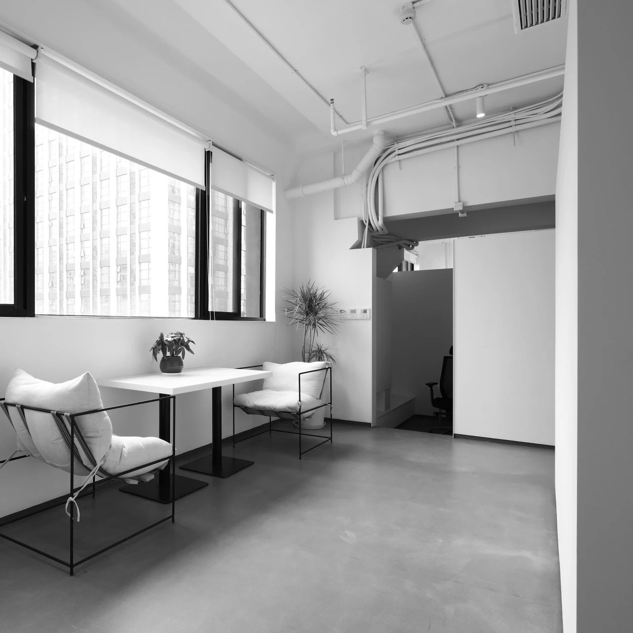 大面积的灰色地坪,原木材质,线型灯,乃至喷绘成白色的裸露电线,点点滴滴无不诉说着空间的高级。办公环境,本身就该是一种态度。