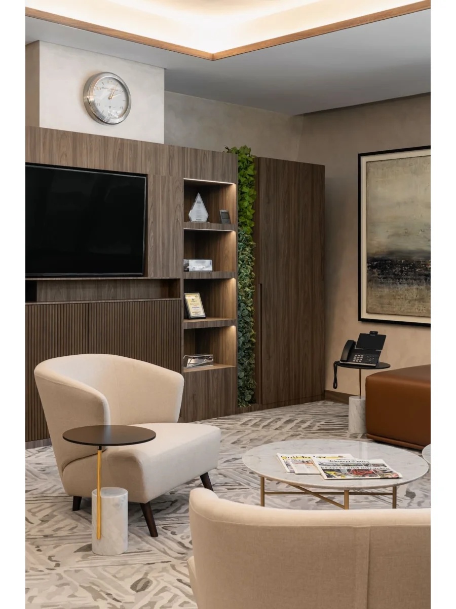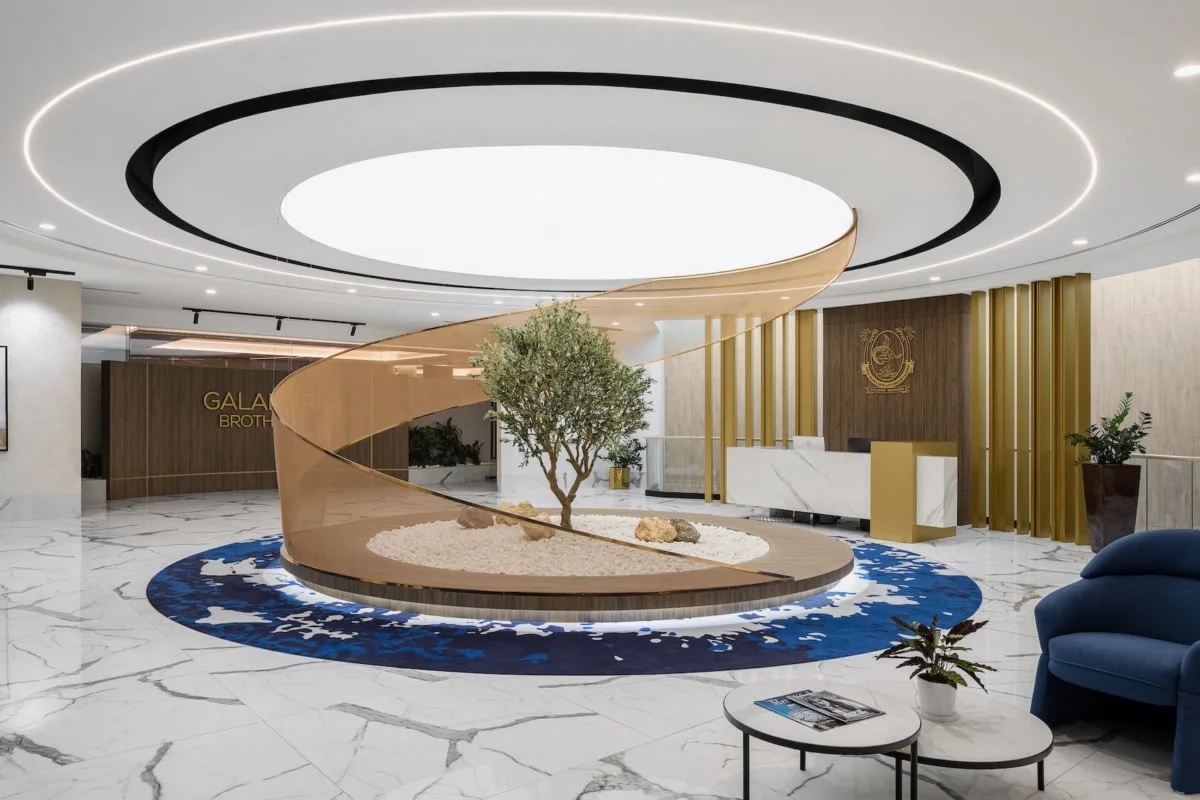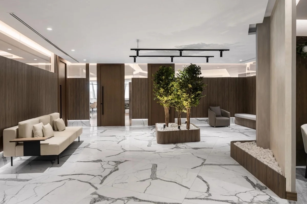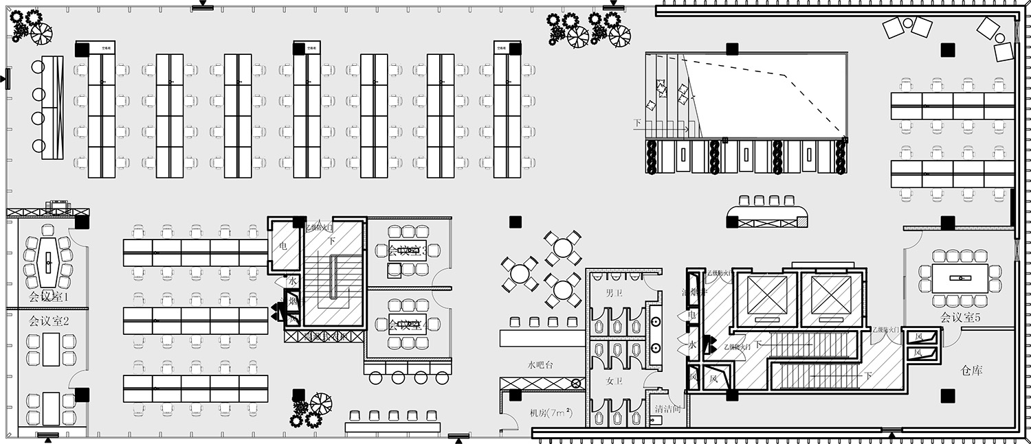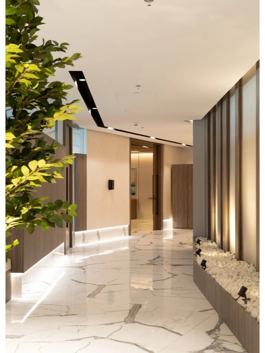 块面的混搭,排列与穿插,讲究又随性。空间挑高的层次多变,高低有序,彼此相辅相成。绿植装置即是视觉上温柔的补充也完成了建筑物的灵动。