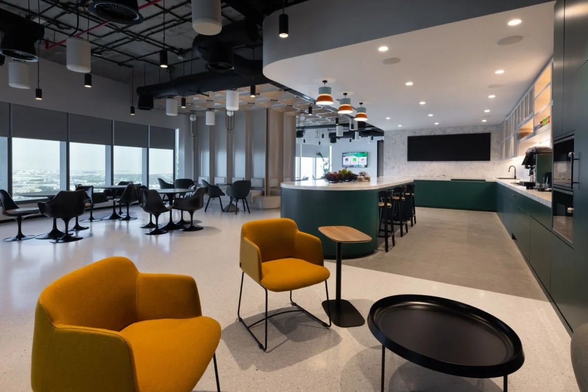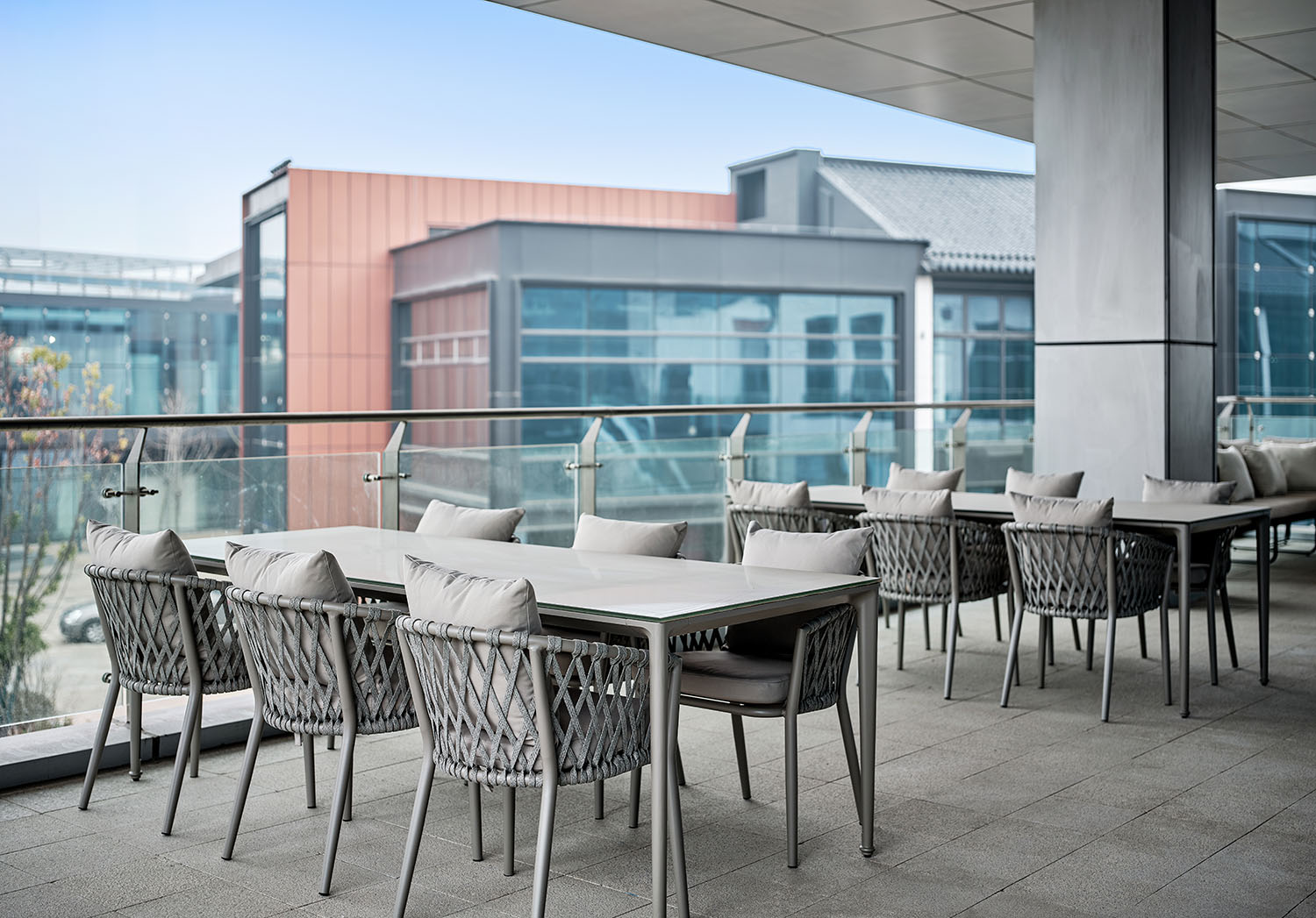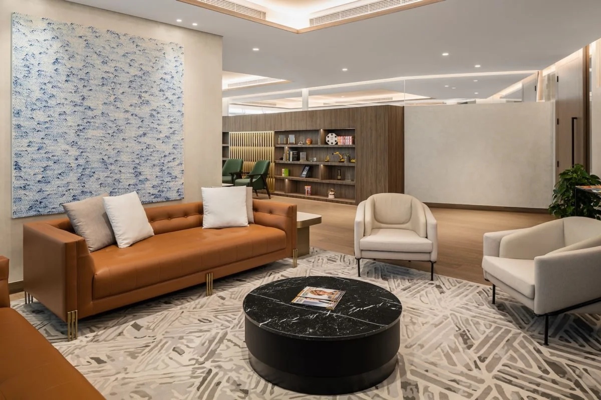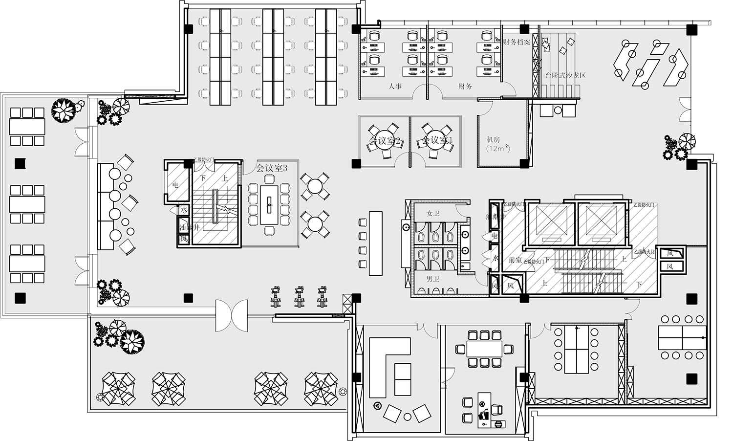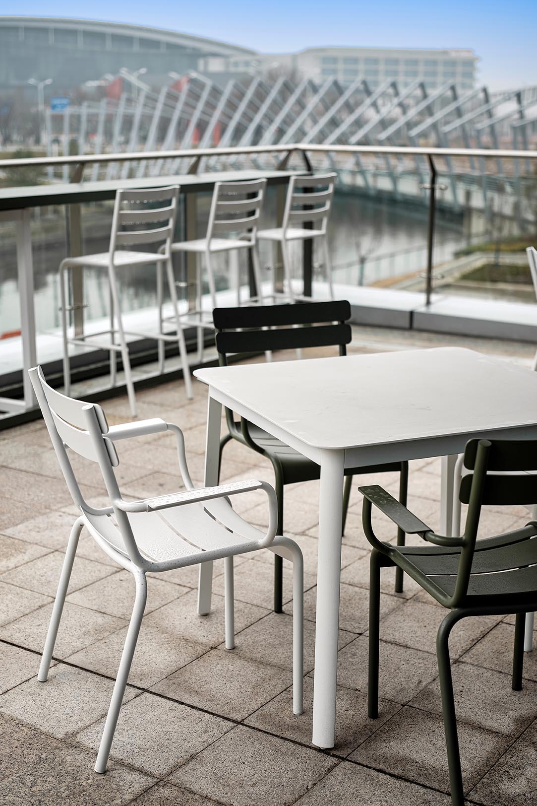 块面的混搭,排列与穿插,讲究又随性。空间挑高的层次多变,高低有序,彼此相辅相成。绿植装置即是视觉上温柔的补充也完成了建筑物的灵动。