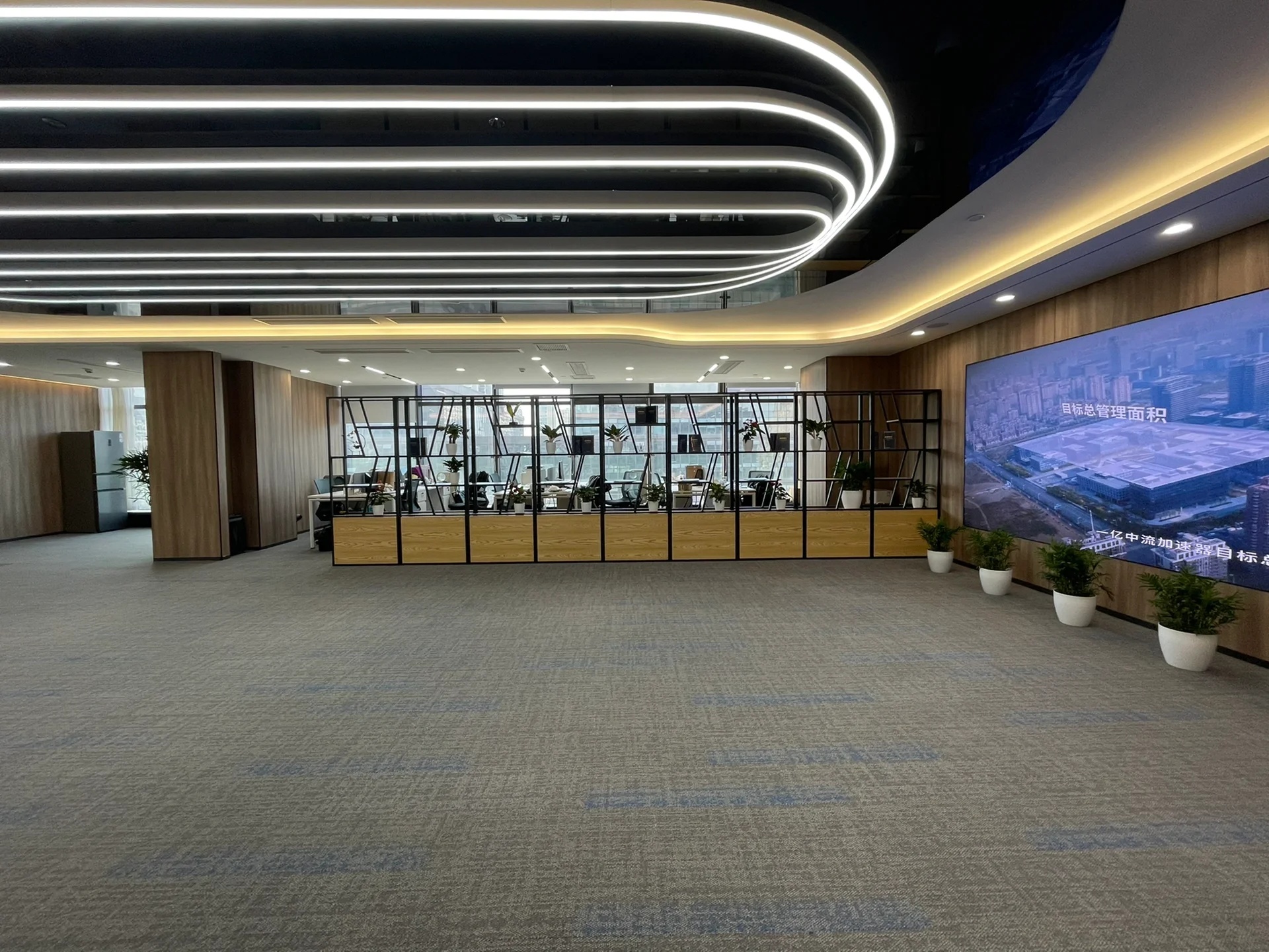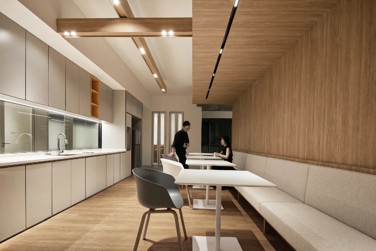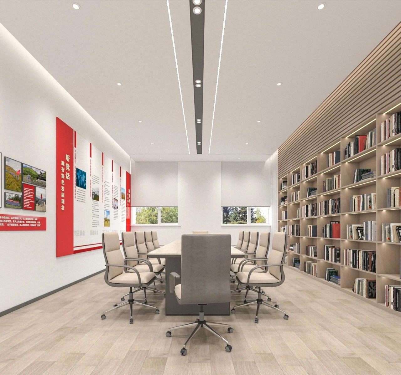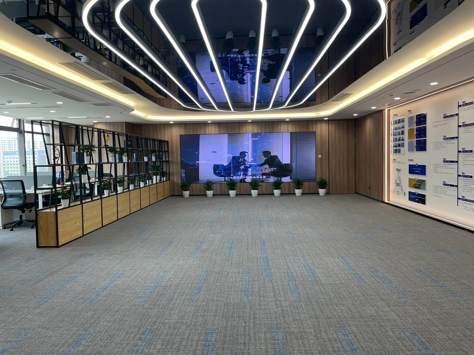 党政办公室的墙壁和天花板采用深色调,以彰显庄重和正式感宽大的书架满足储物需求,文化墙突显公司的身份