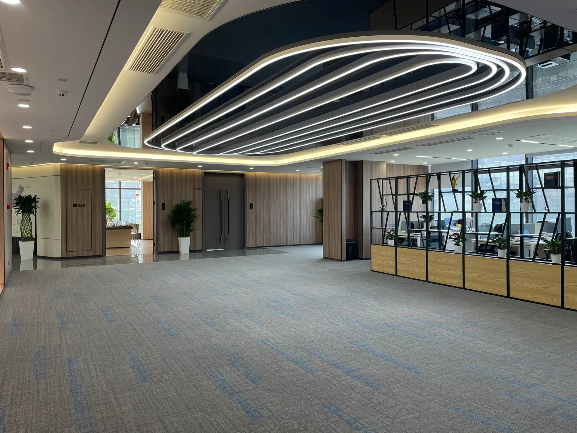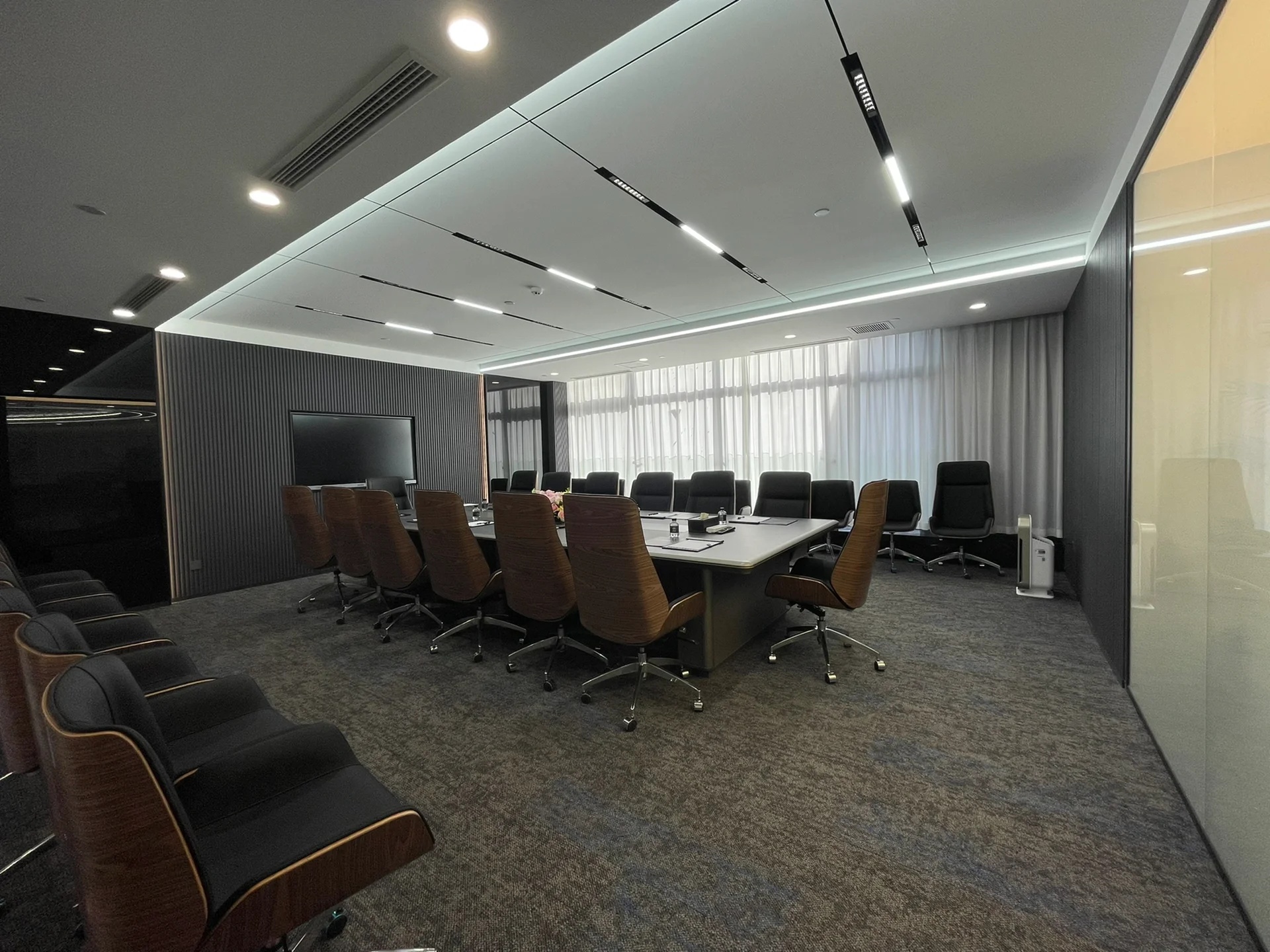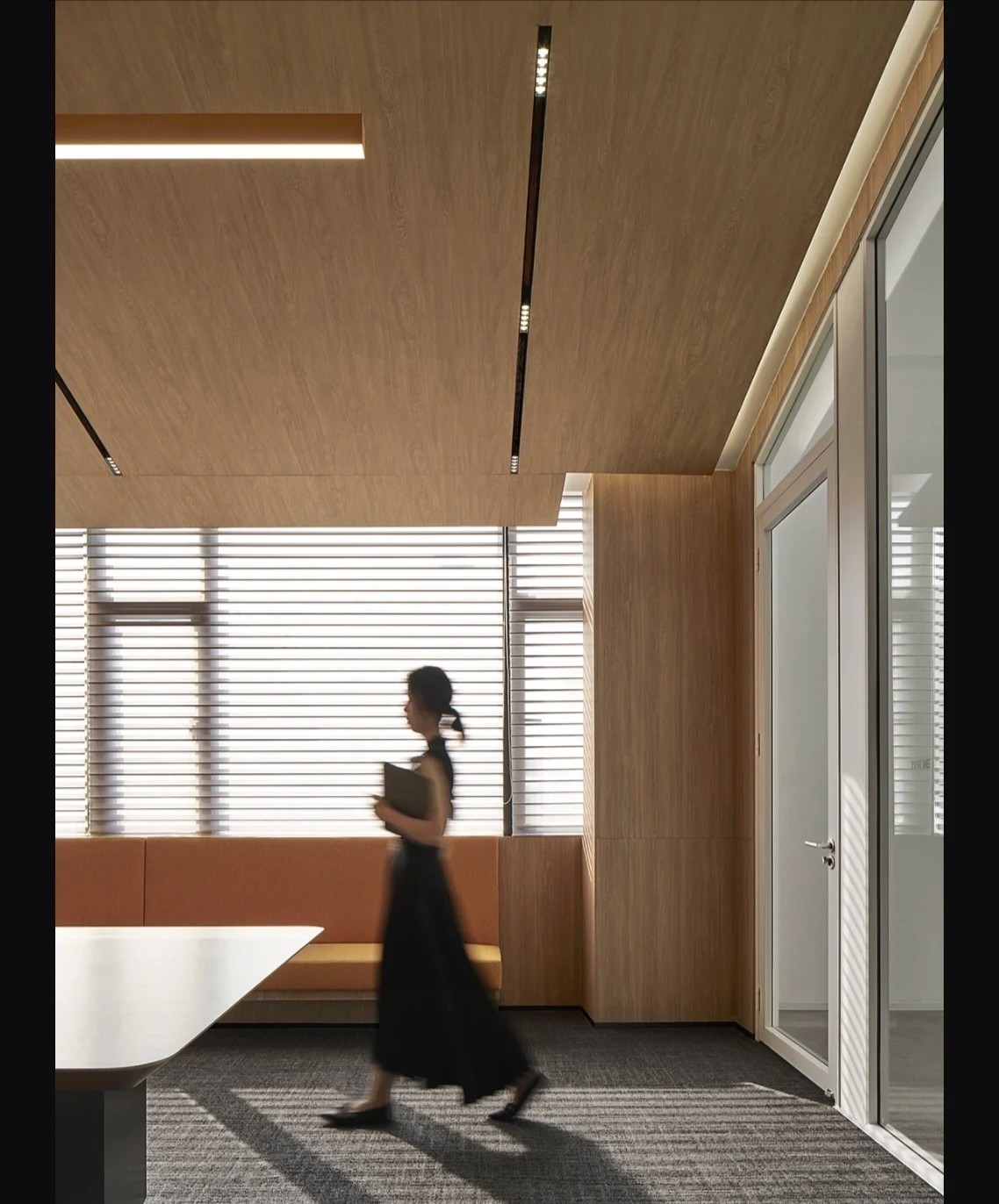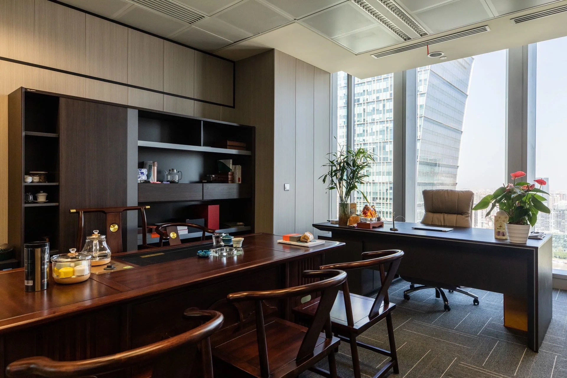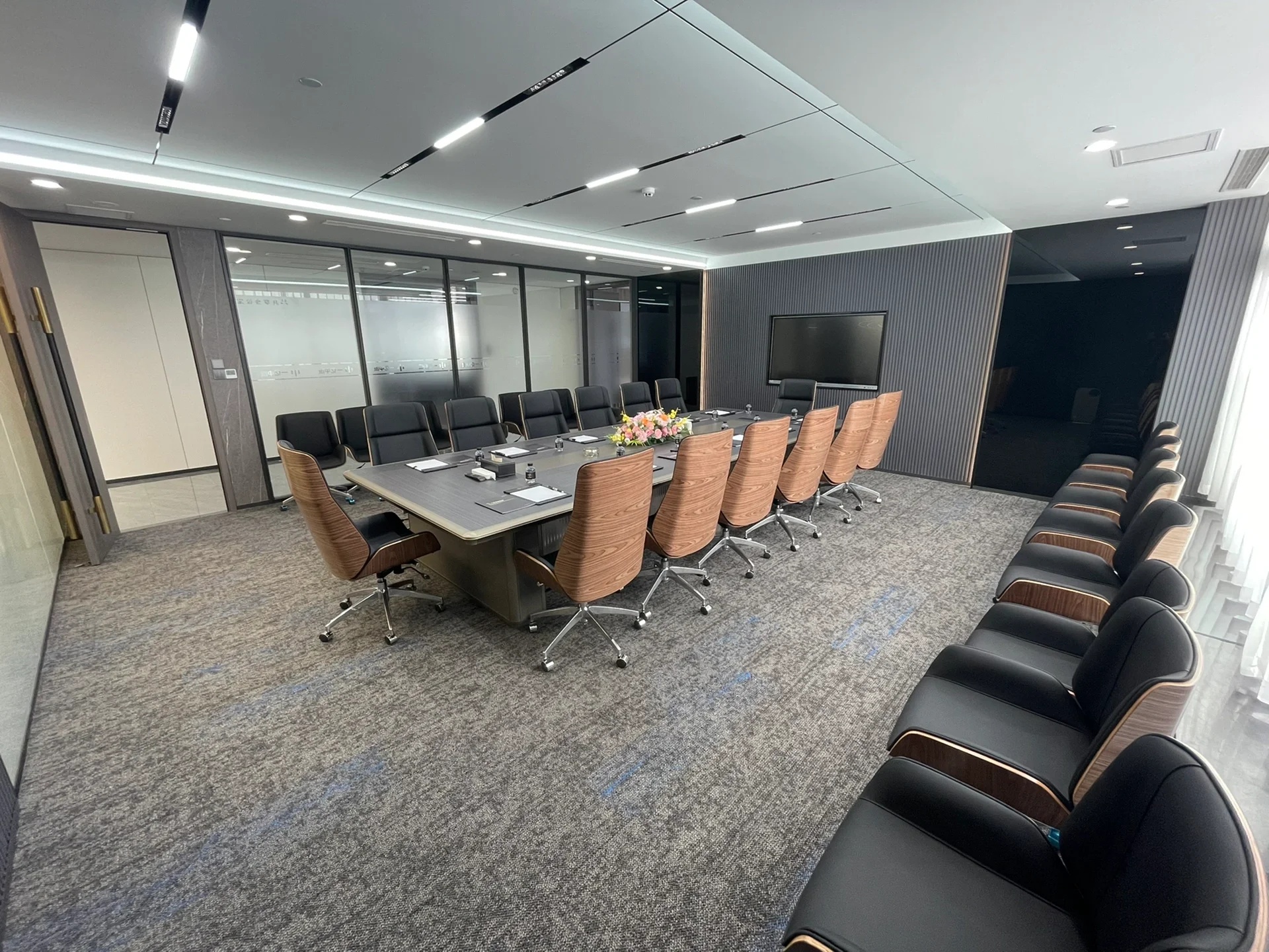 党政办公室的墙壁和天花板采用深色调,以彰显庄重和正式感宽大的书架满足储物需求,文化墙突显公司的身份