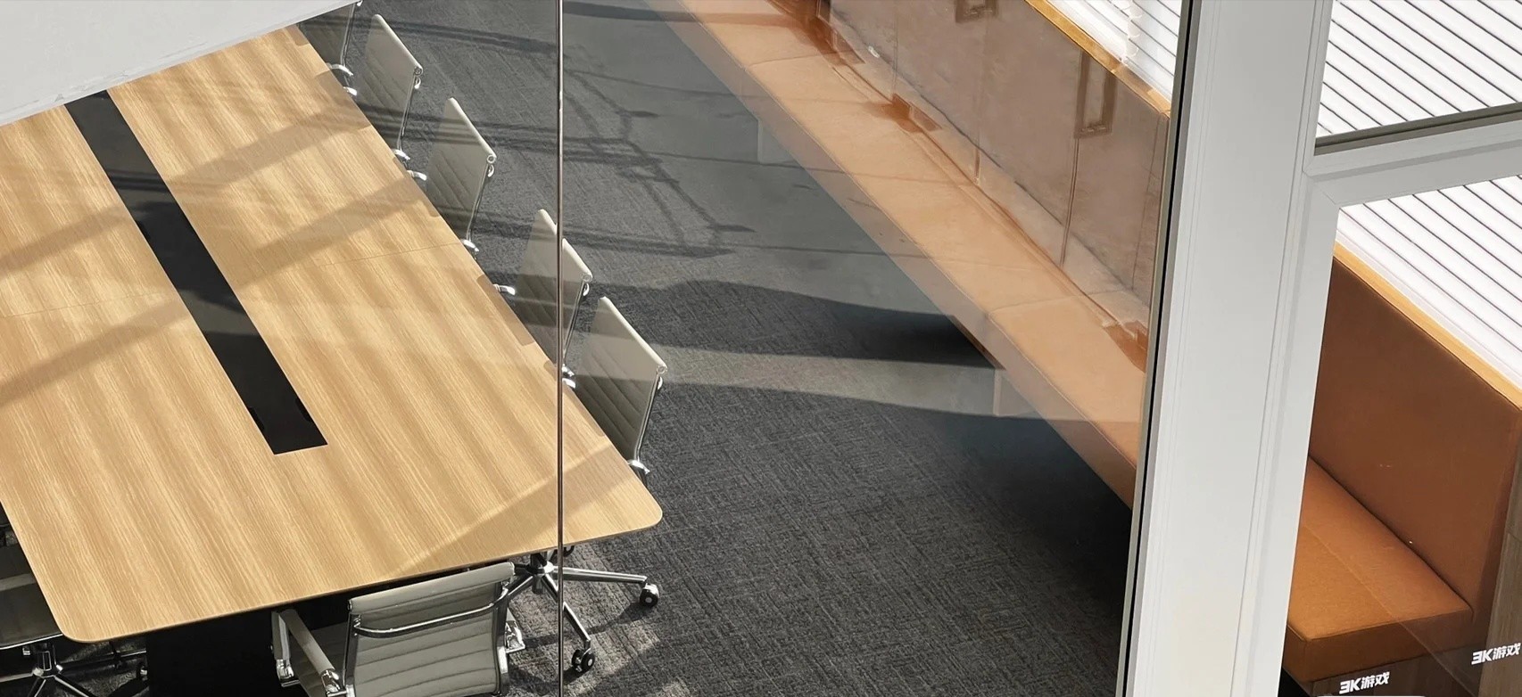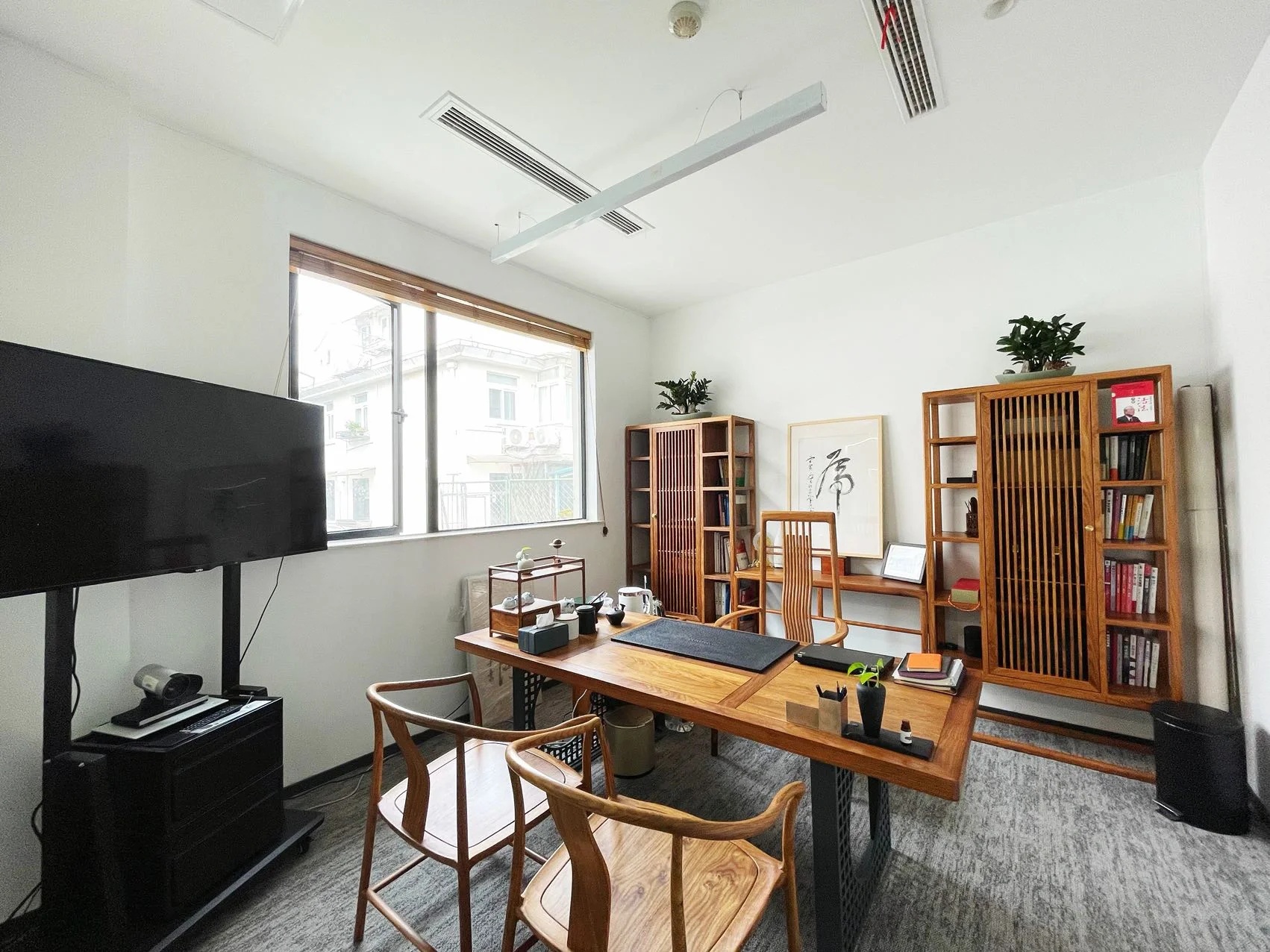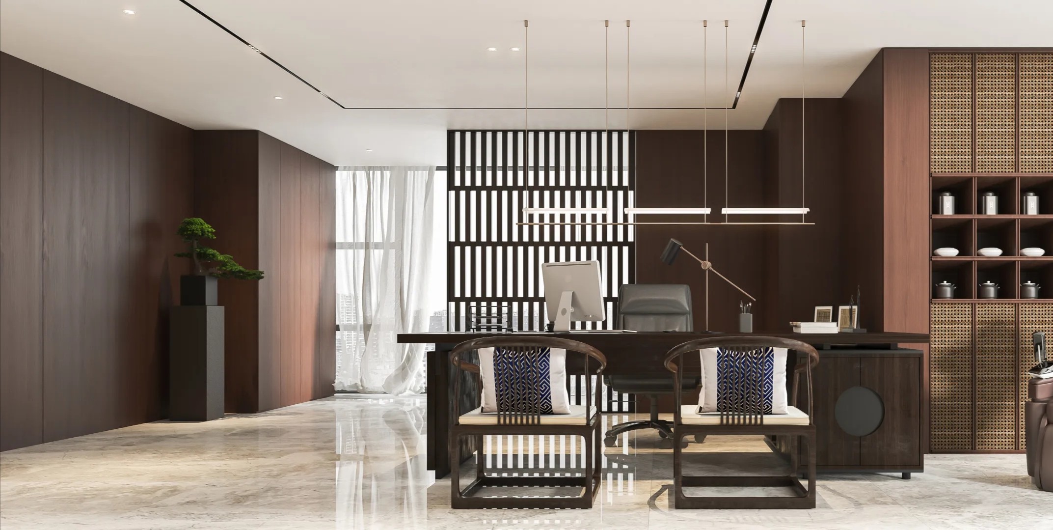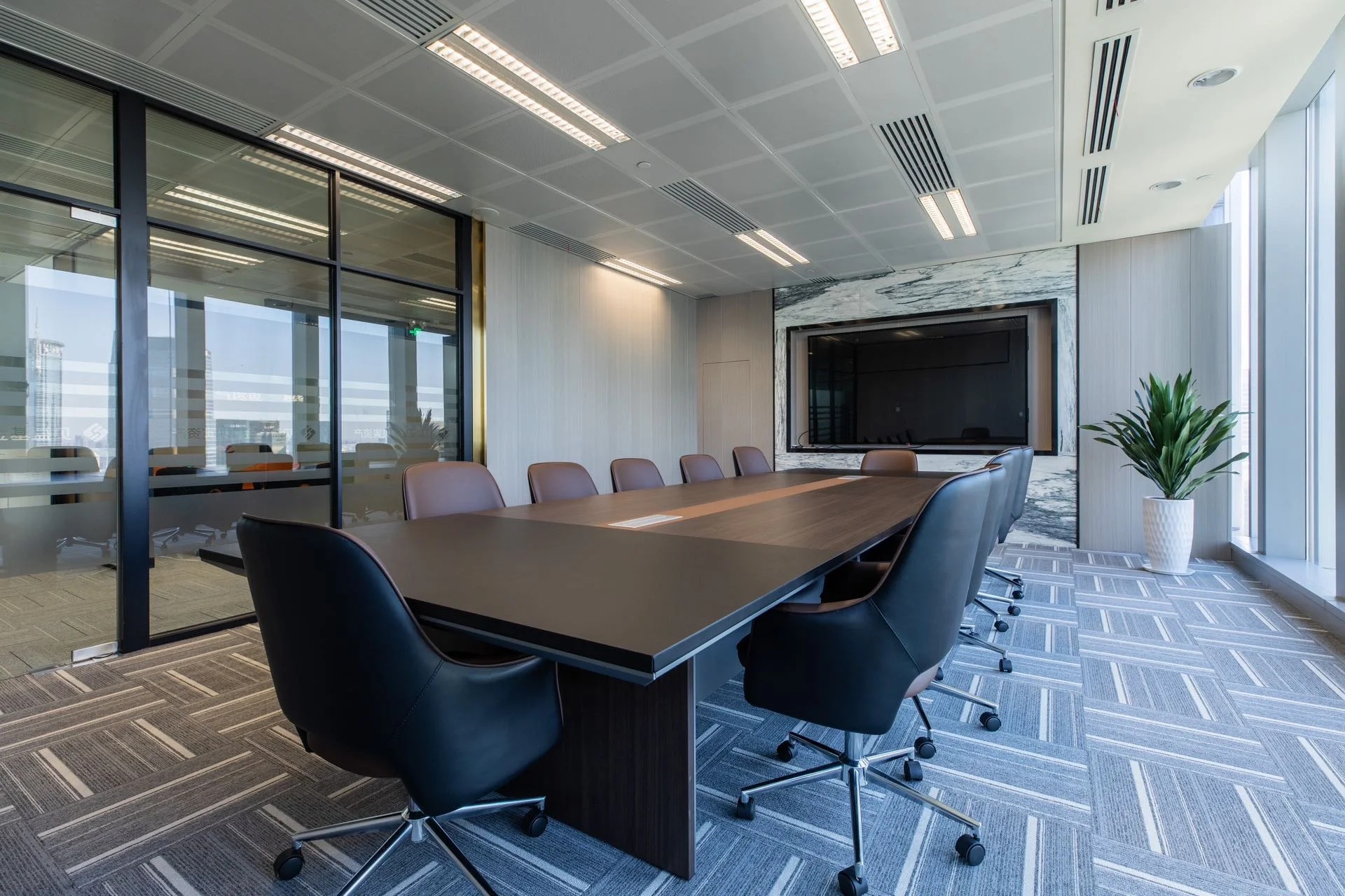 党政办公室的墙壁和天花板采用深色调,以彰显庄重和正式感宽大的书架满足储物需求,文化墙突显公司的身份