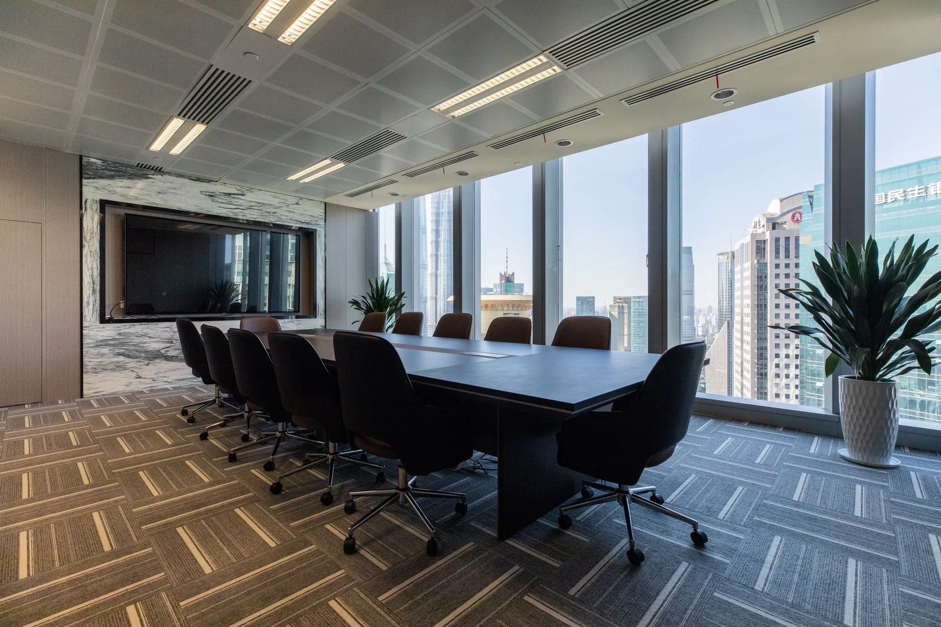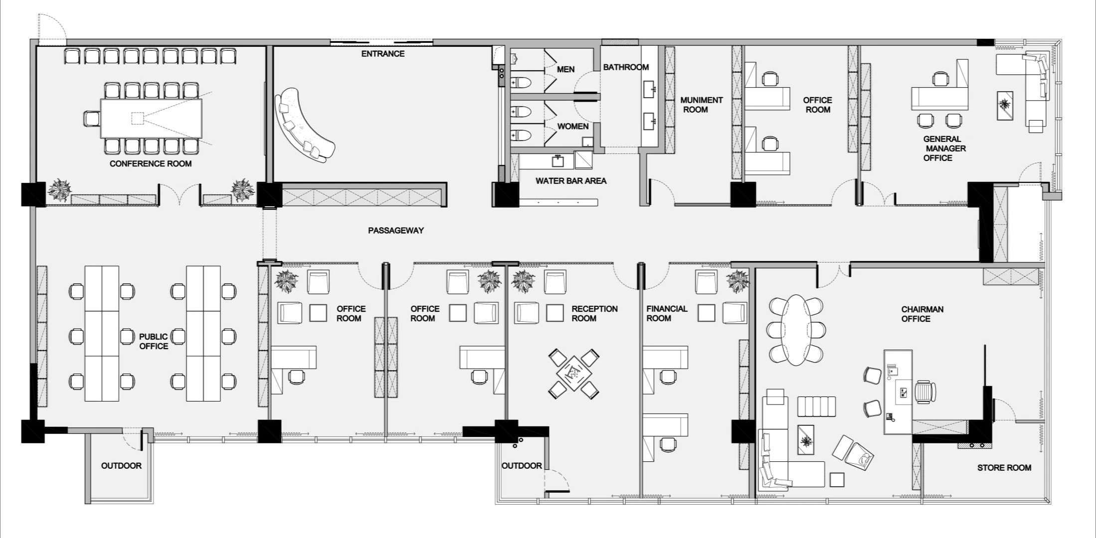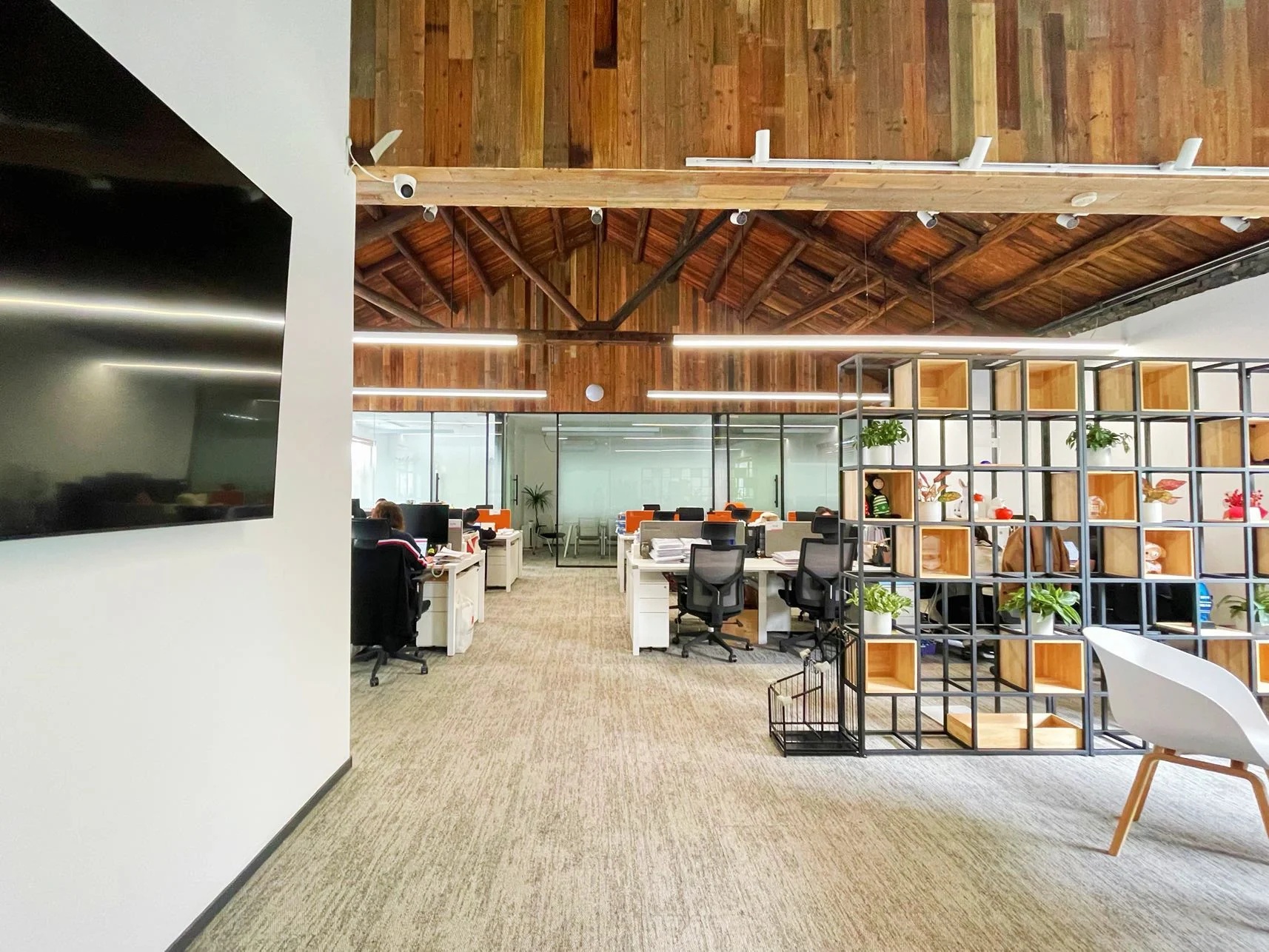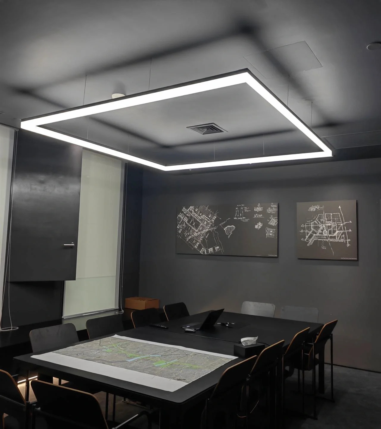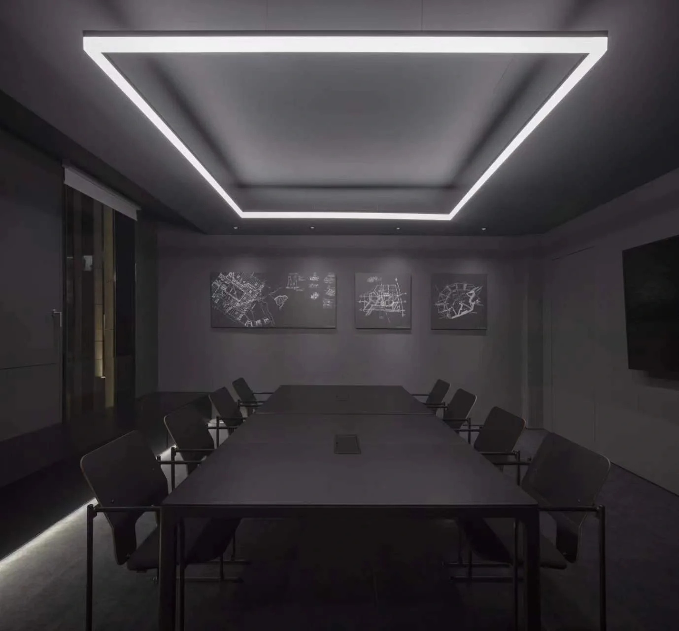 党政办公室的墙壁和天花板采用深色调,以彰显庄重和正式感宽大的书架满足储物需求,文化墙突显公司的身份