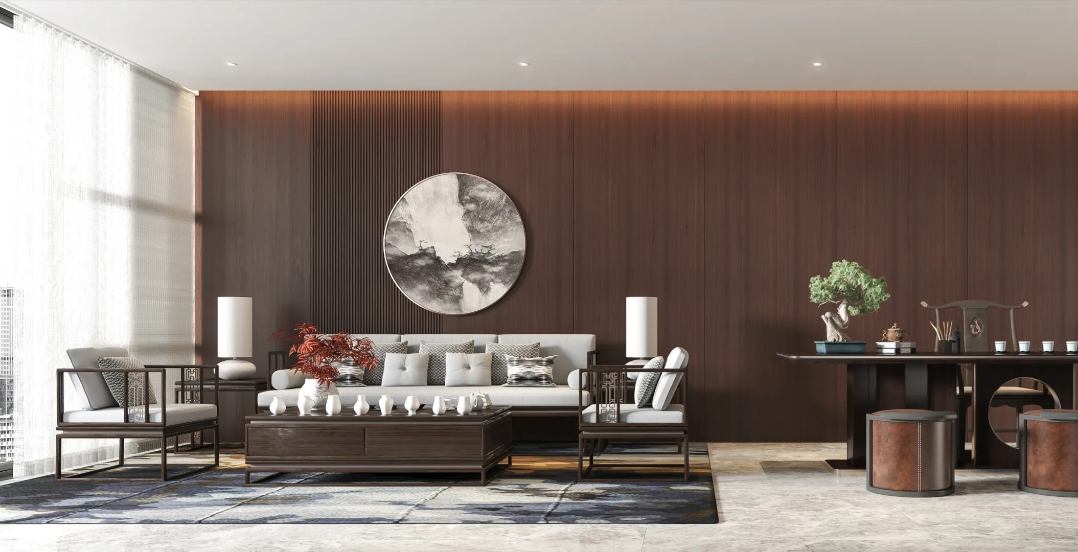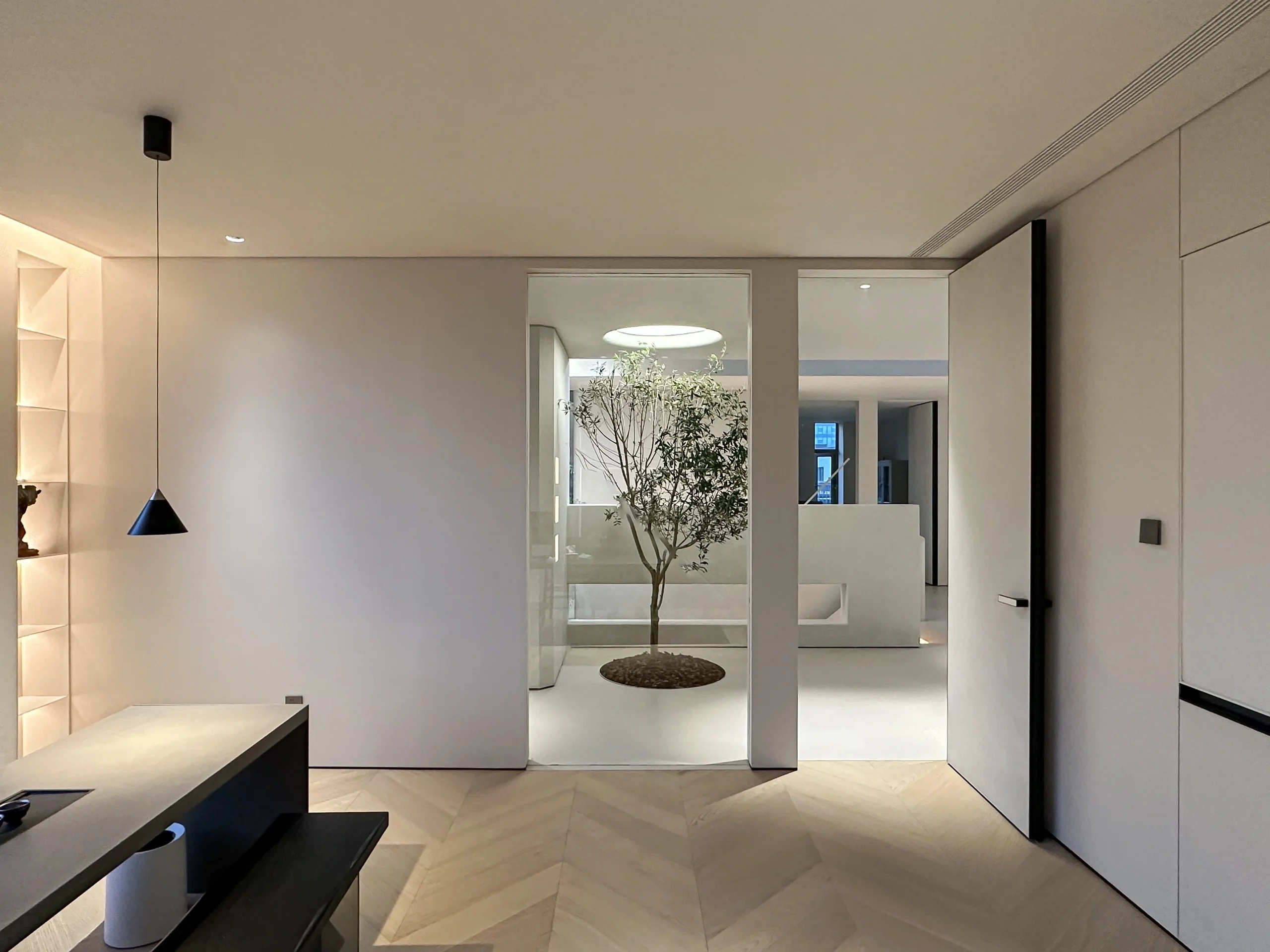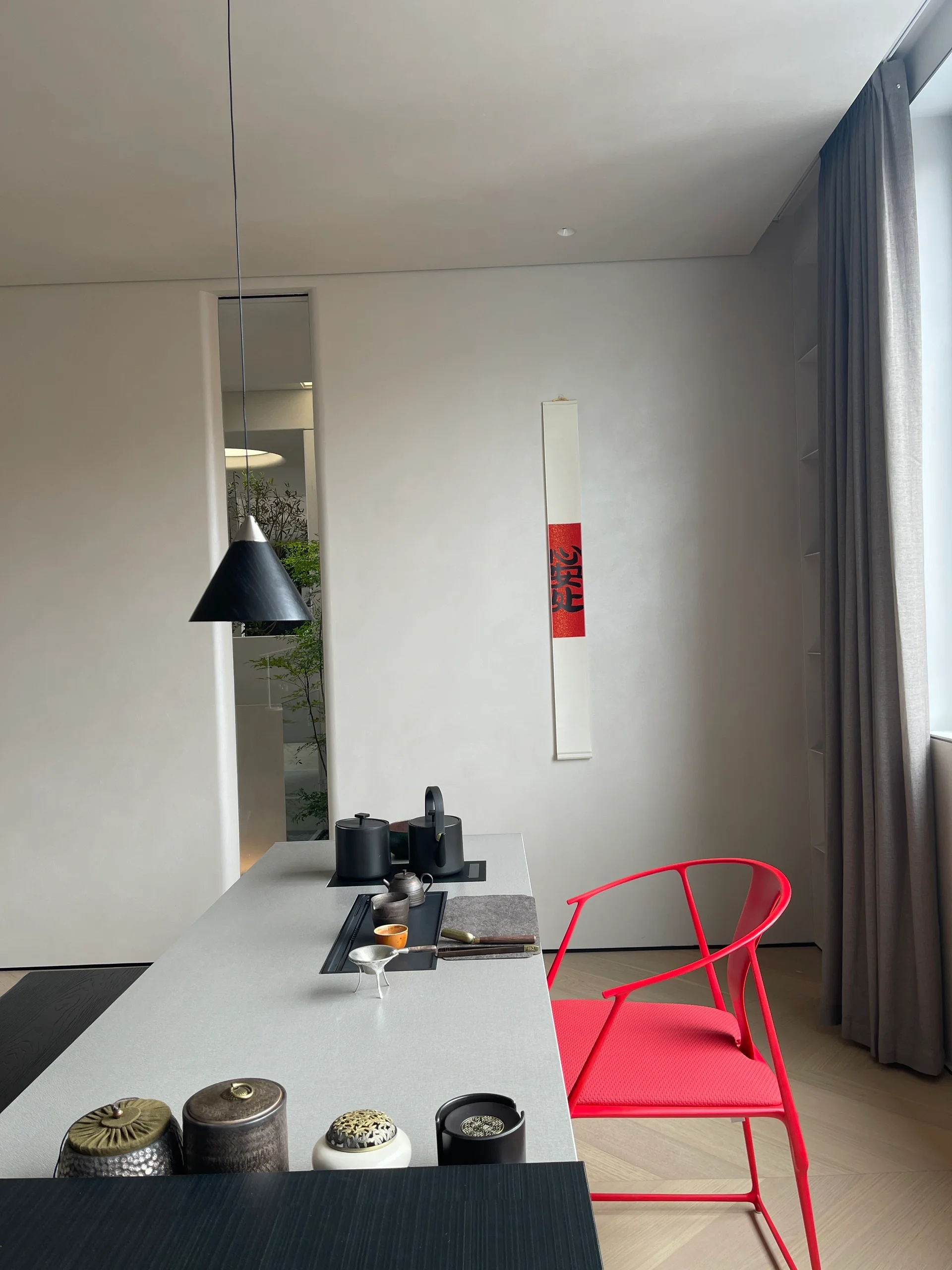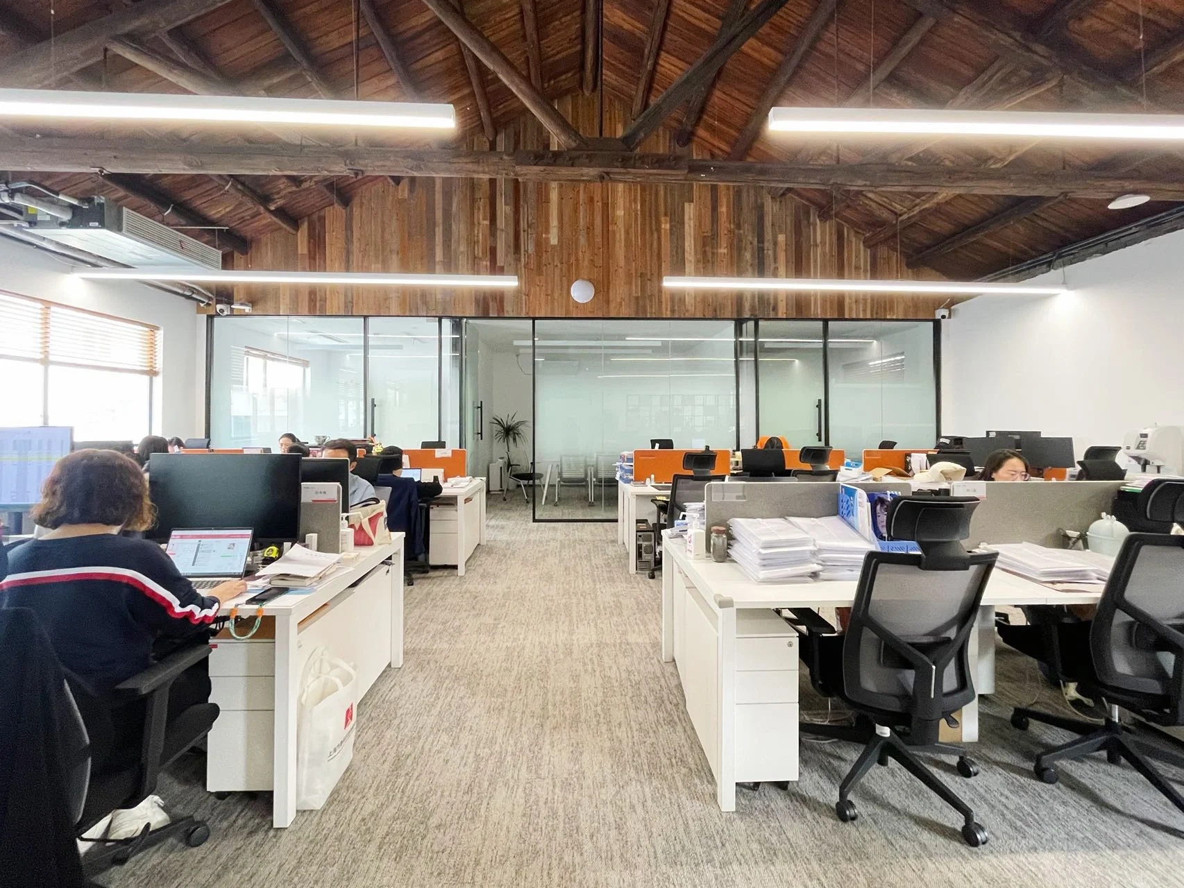 党政办公室的墙壁和天花板采用深色调,以彰显庄重和正式感宽大的书架满足储物需求,文化墙突显公司的身份