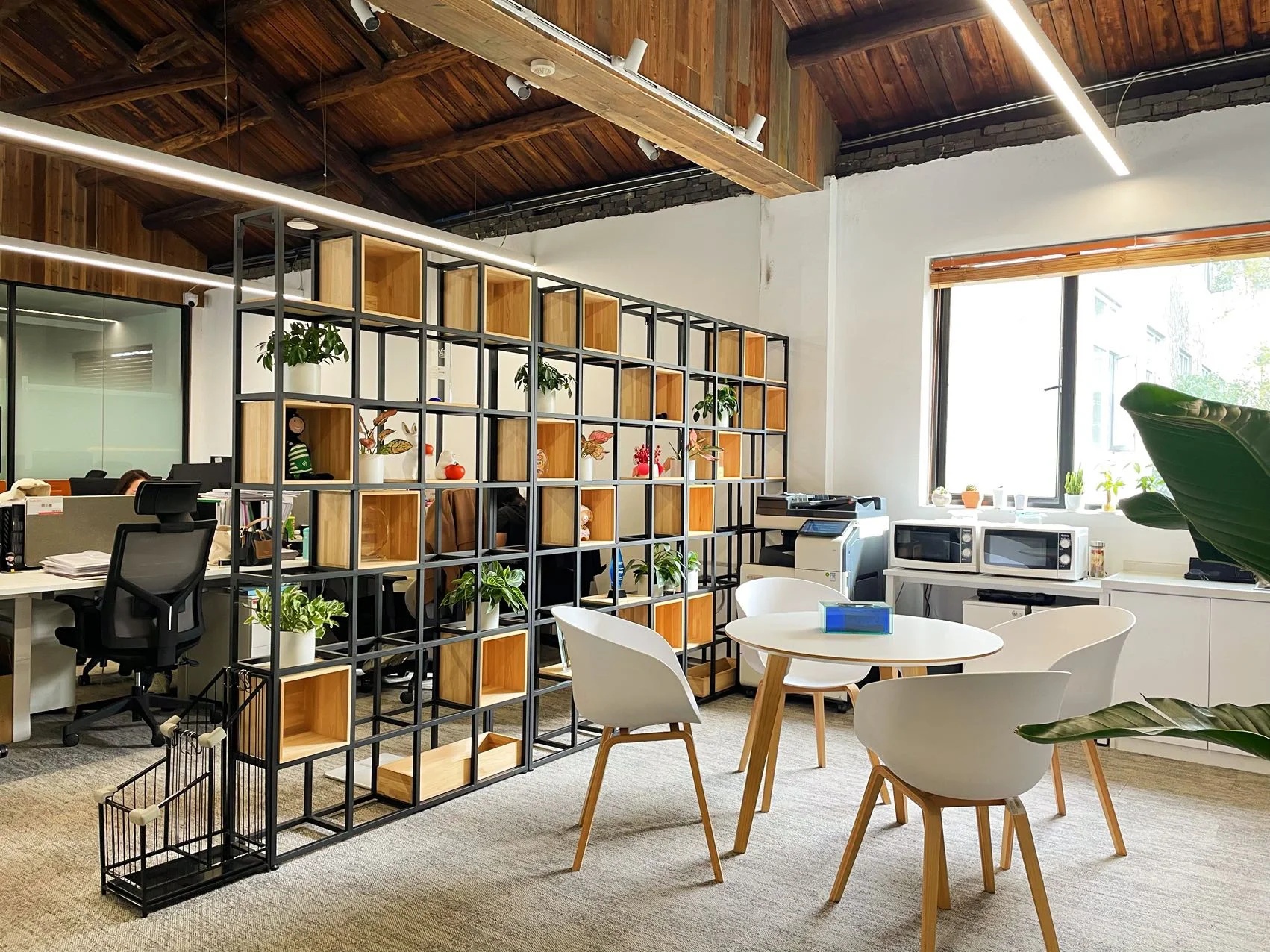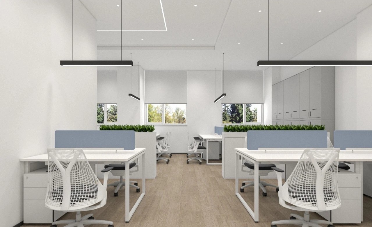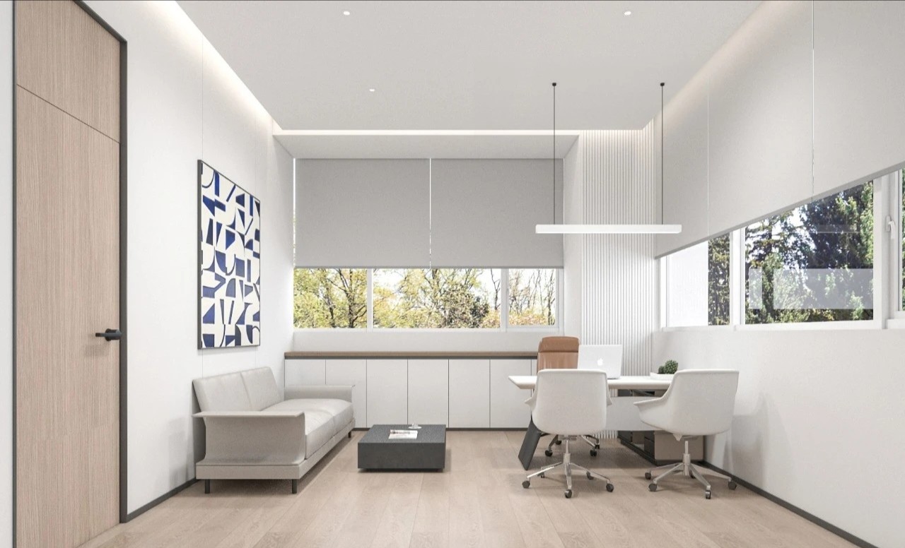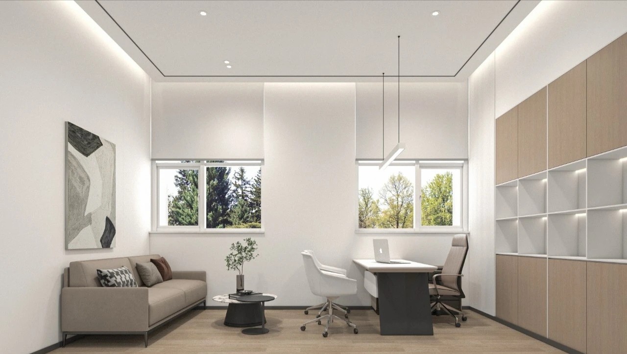 办公桌和椅子都选择了简洁的设计,白色桌面,金属色的储物柜,搭配简约框架注重功能性和空间的最大化利用,摒弃了多余的装饰和复杂的设计