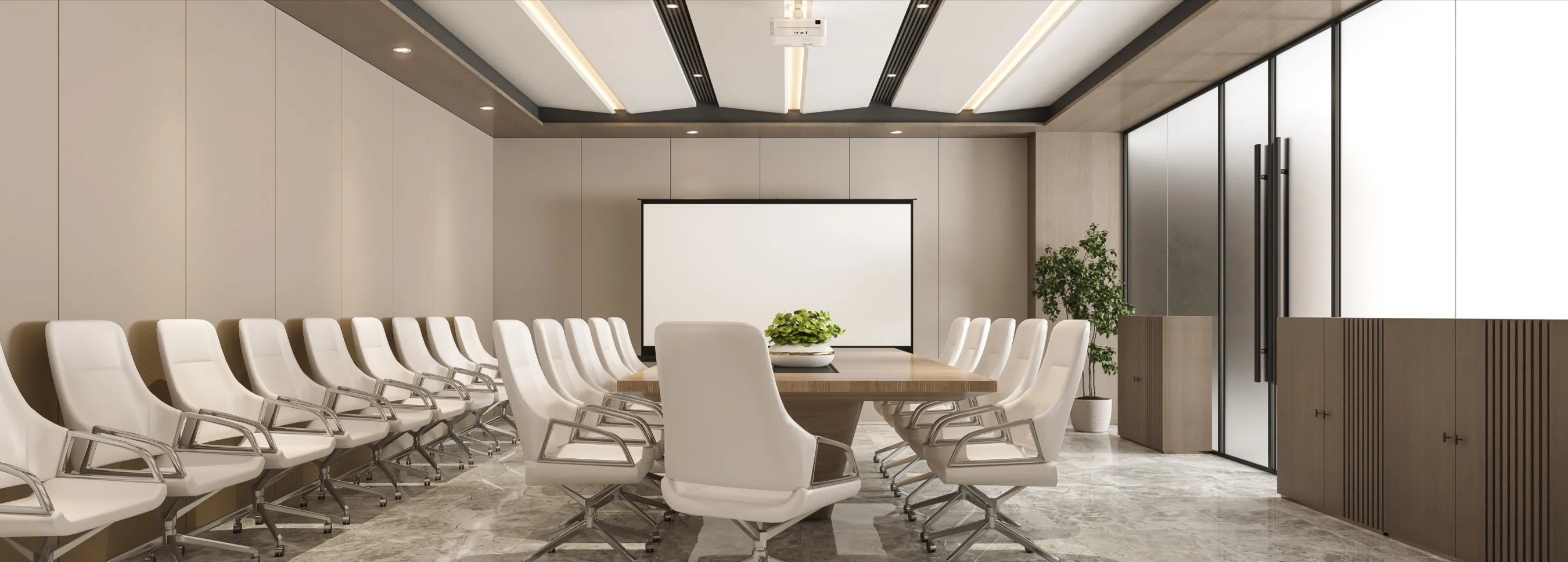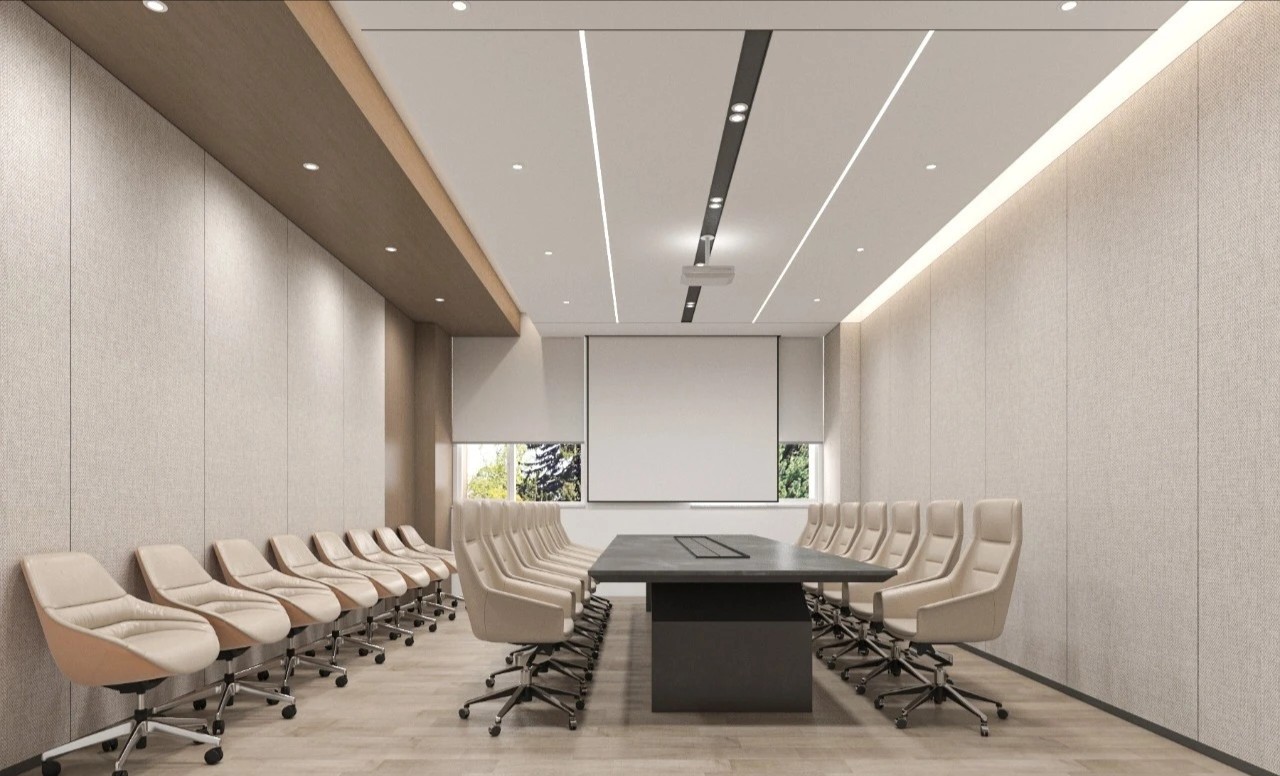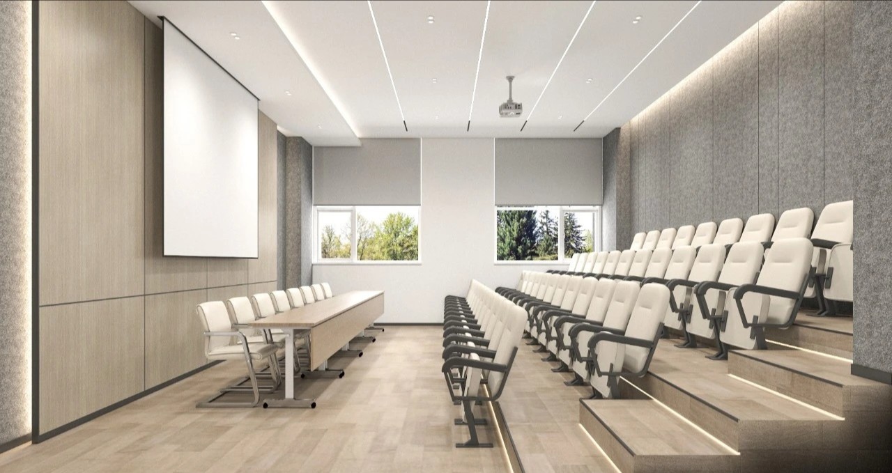 会议室的墙壁采用米白色调,营造出清新、明亮的氛围设置了阶梯座位,形成一个半圆形的观众区域,使每个与会者都能够清晰看到屏幕座位之间的空间也设计得宽敞,方便参会者的流动和互动