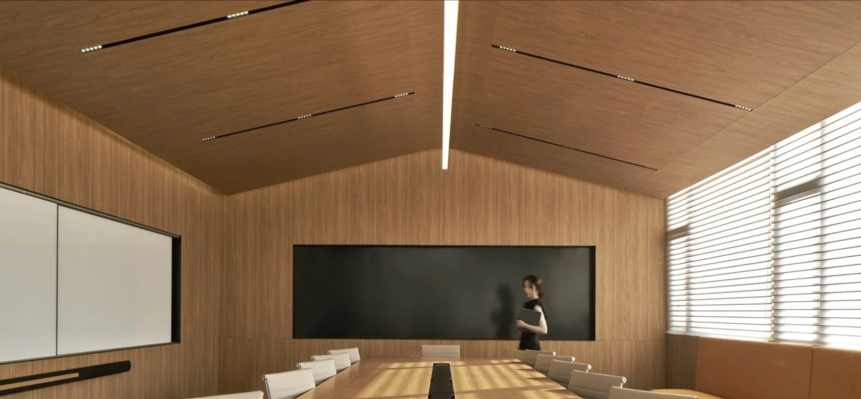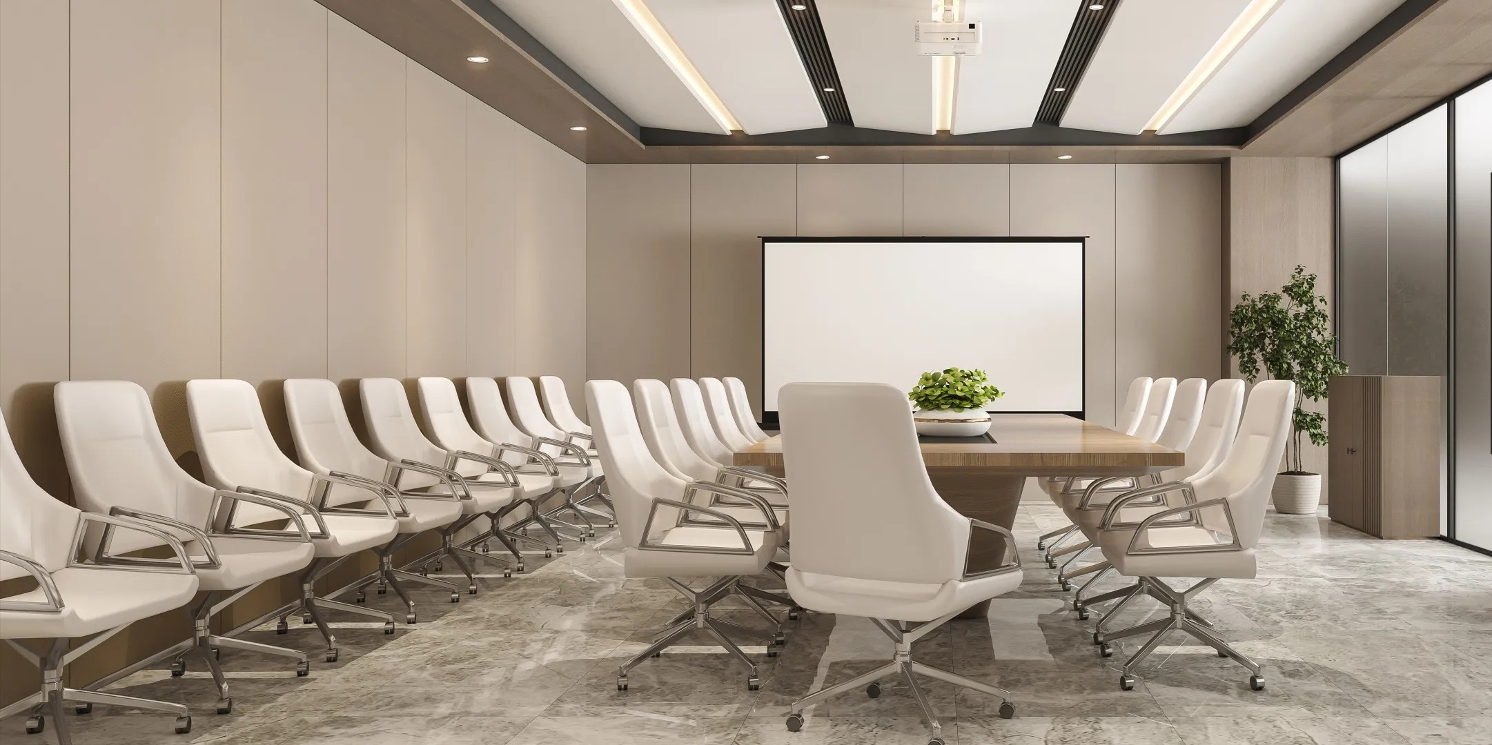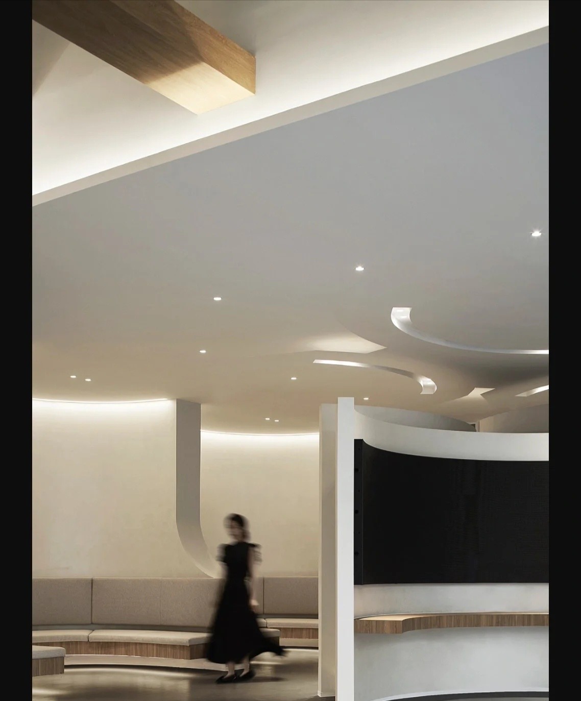 会议室的墙壁采用米白色调,营造出清新、明亮的氛围设置了阶梯座位,形成一个半圆形的观众区域,使每个与会者都能够清晰看到屏幕座位之间的空间也设计得宽敞,方便参会者的流动和互动