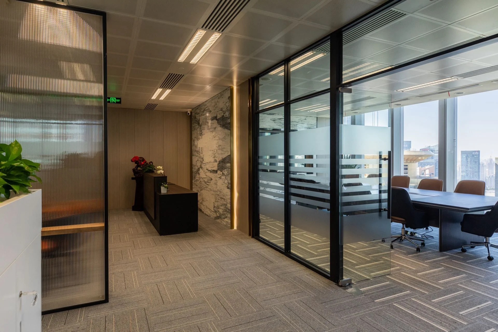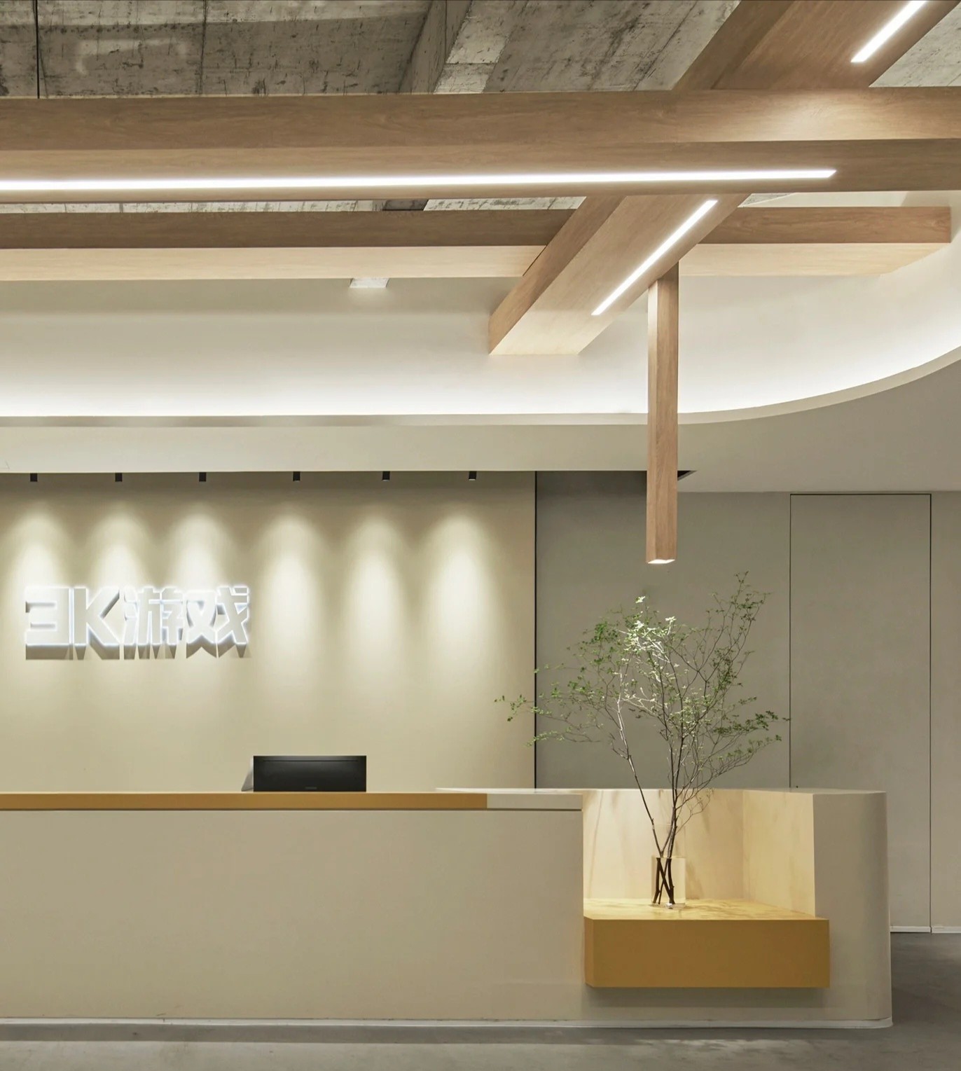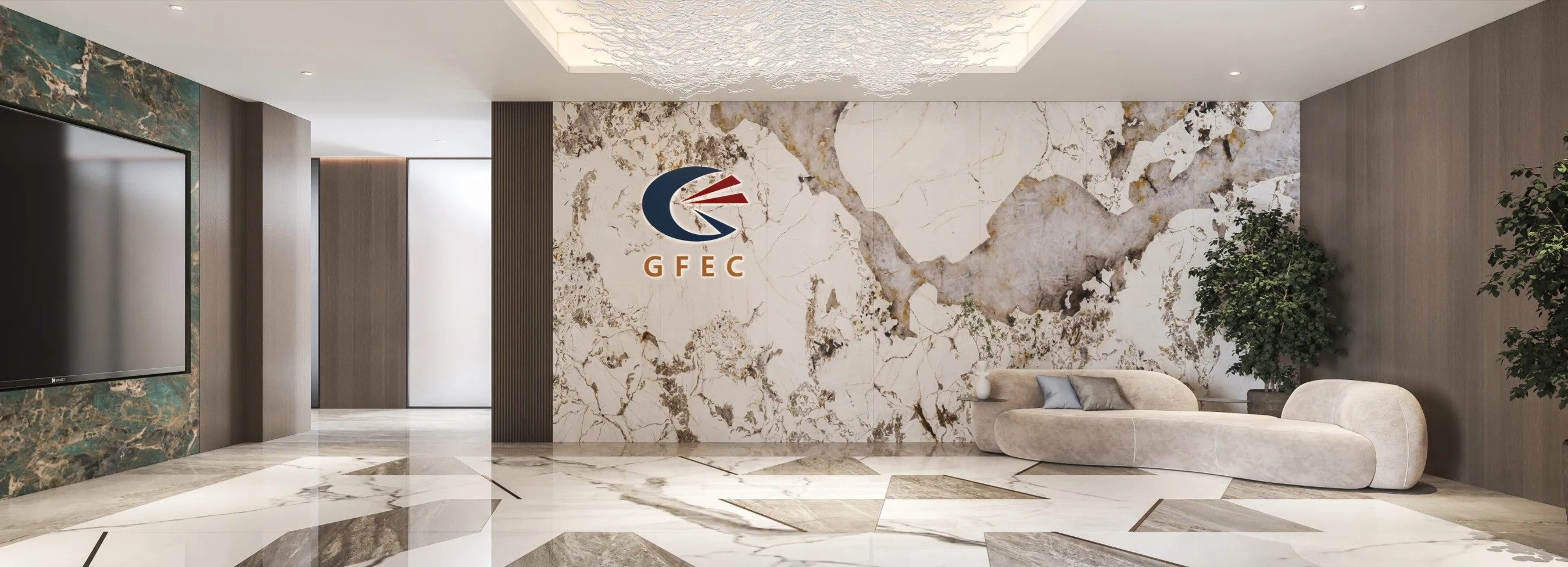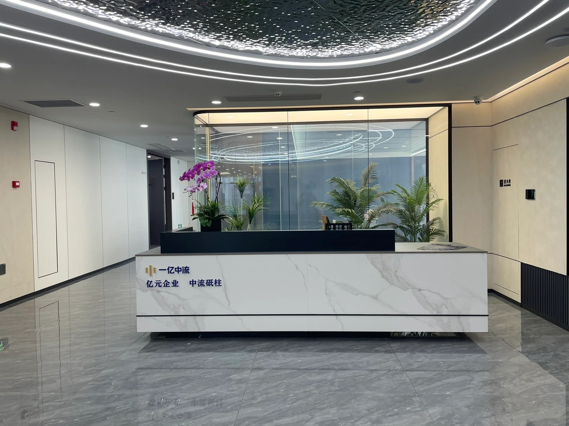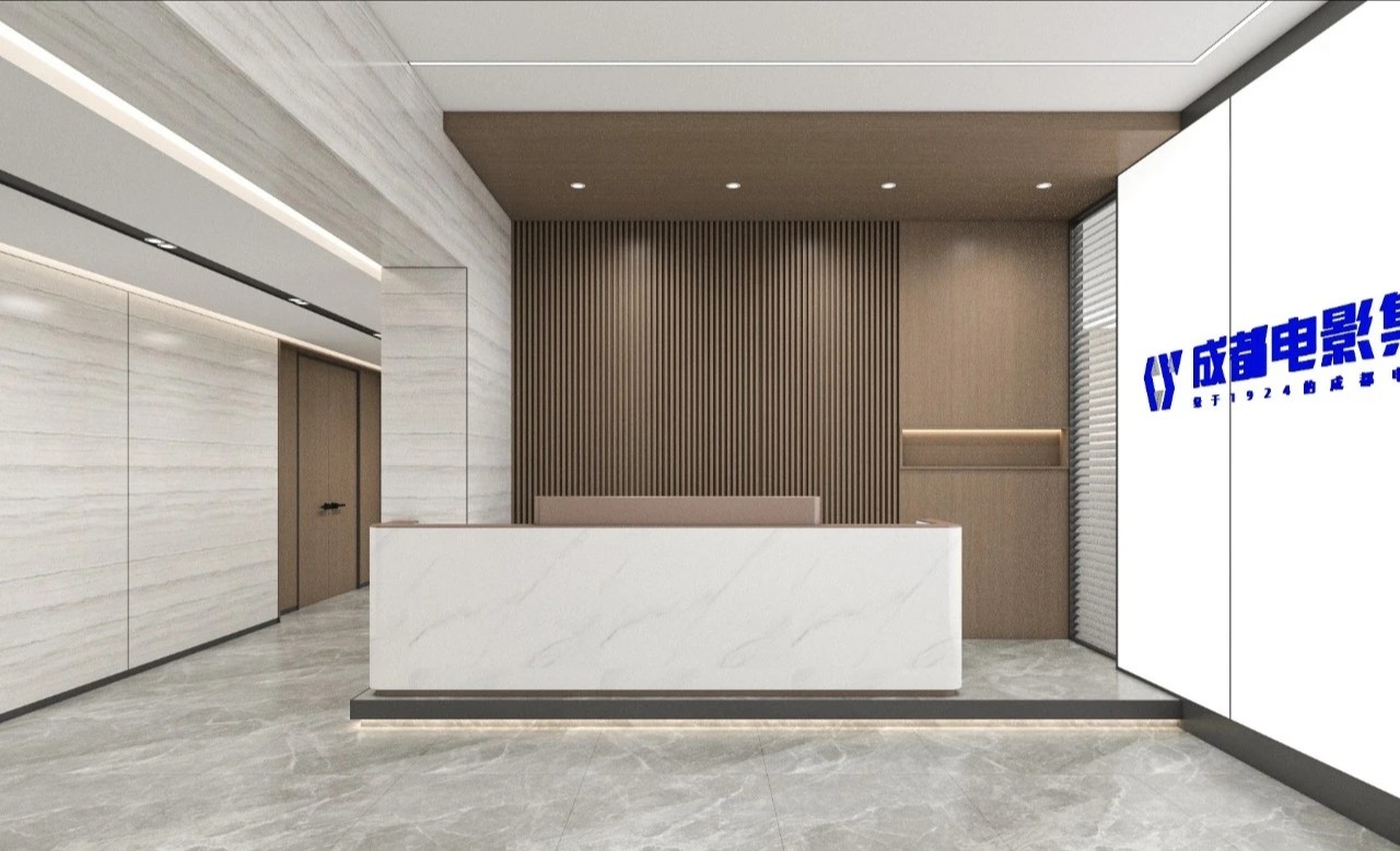 前台采用高贵的大理石桌面与清晰的LOGO墙设计,营造出亲切而独特的氛围旁边的公司简介墙点缀着空间,为整个环境增添了一抹独特的个性