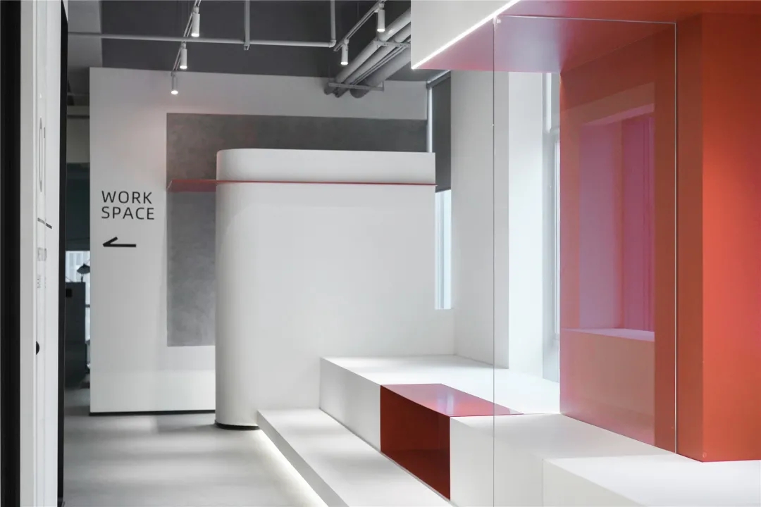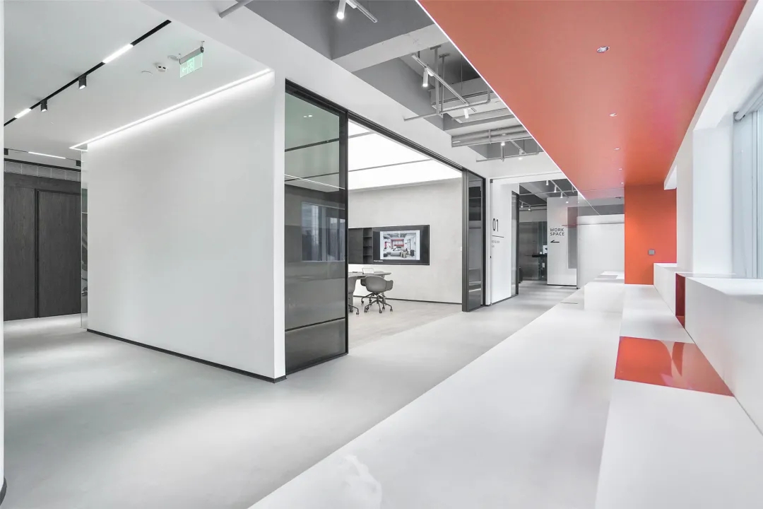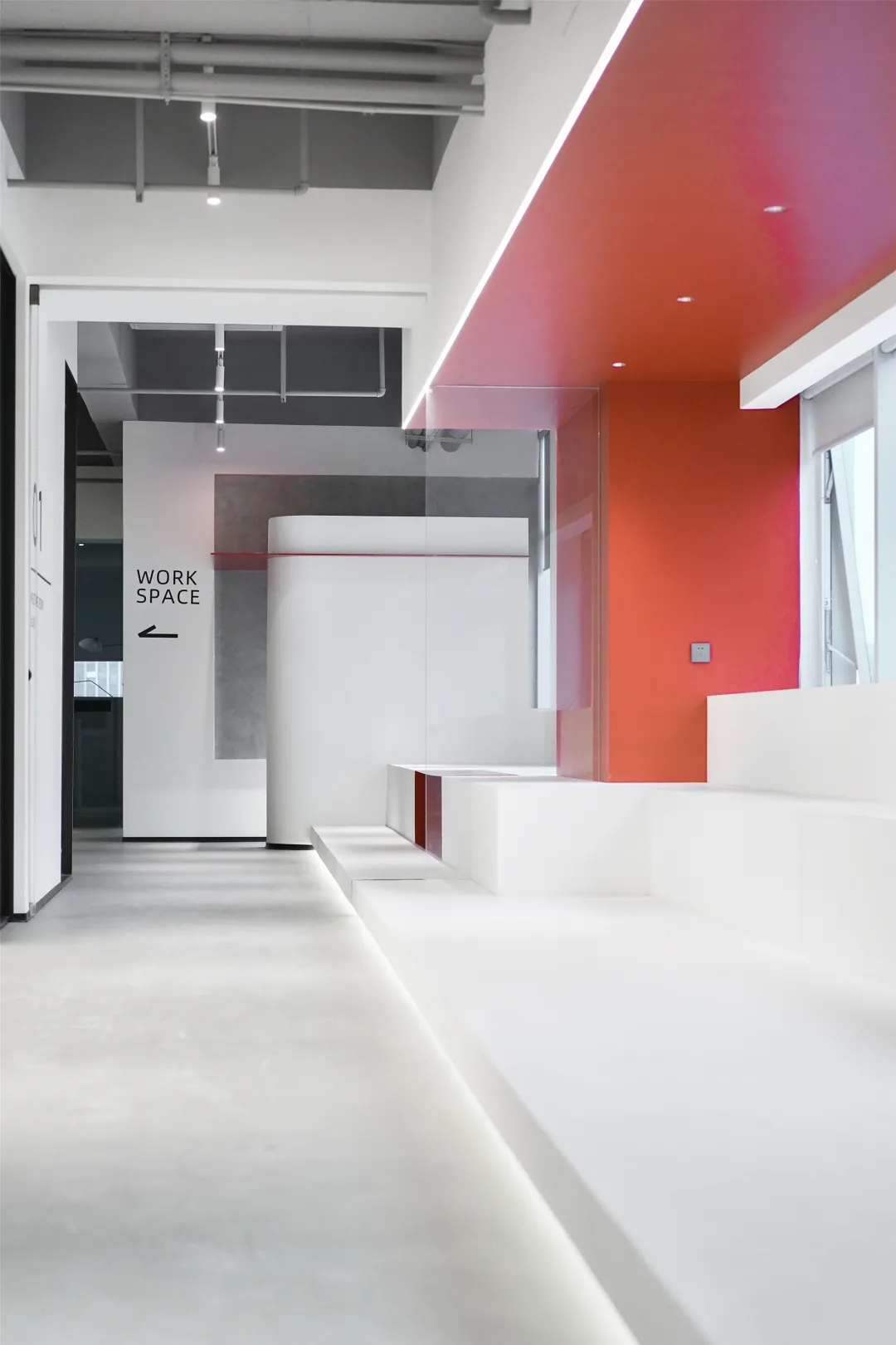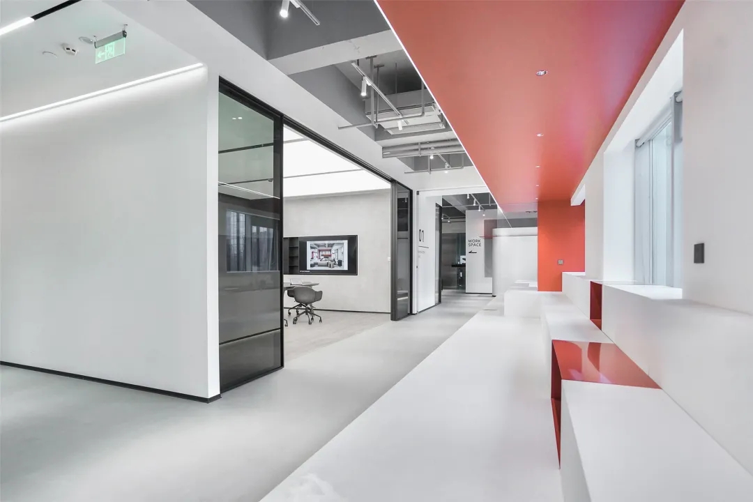 办公室内空间整体以白色为基调,红色作为点缀。我们希望以简洁的设计语言和纯粹的颜色搭配呈现更耐看的办公环境。自由开放是这次设计的核心。整个办公室,不同区域有不同形式的座位方式,员工可以自由选择自己喜欢的工位,以更好的激发员工的工作效率。