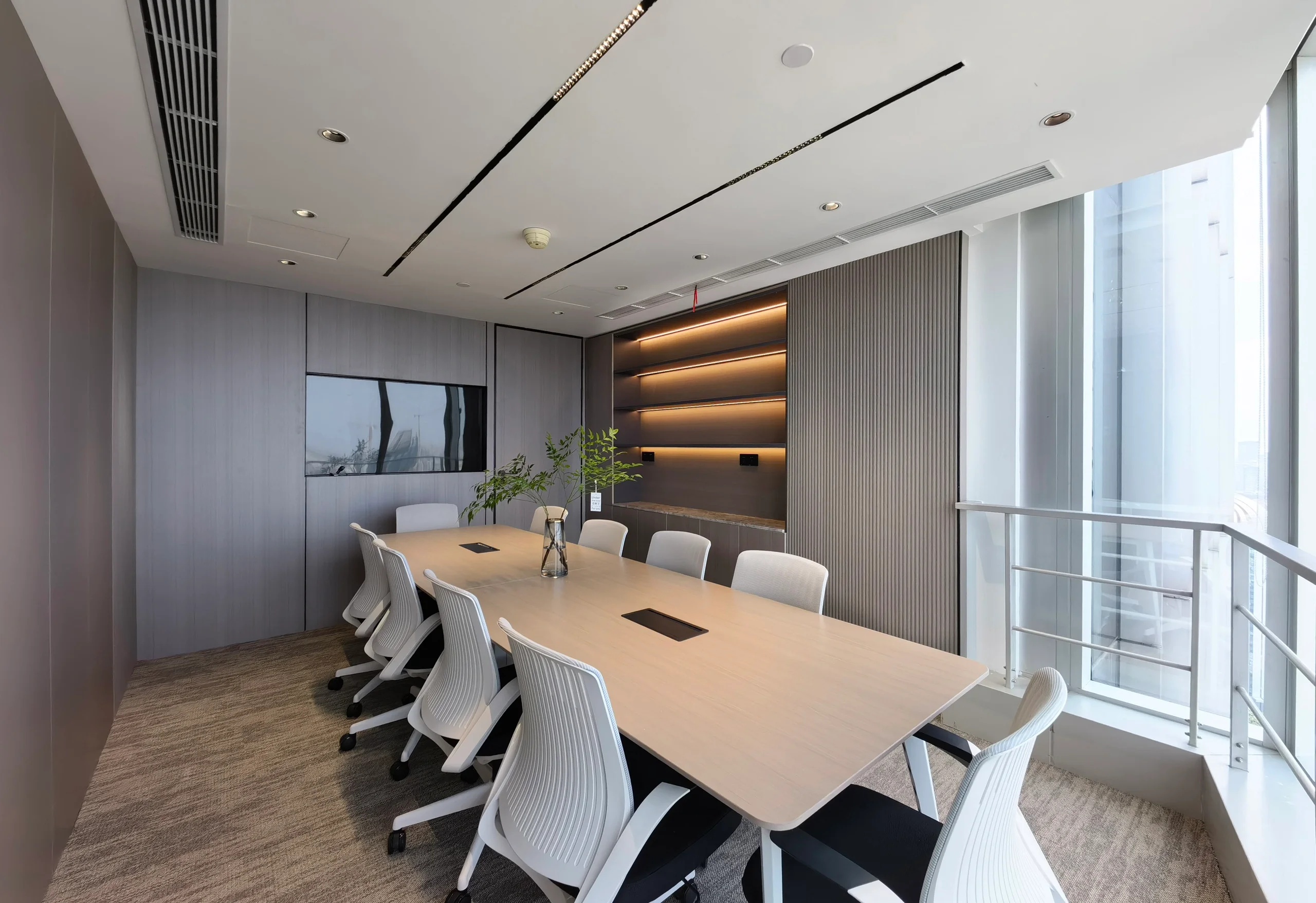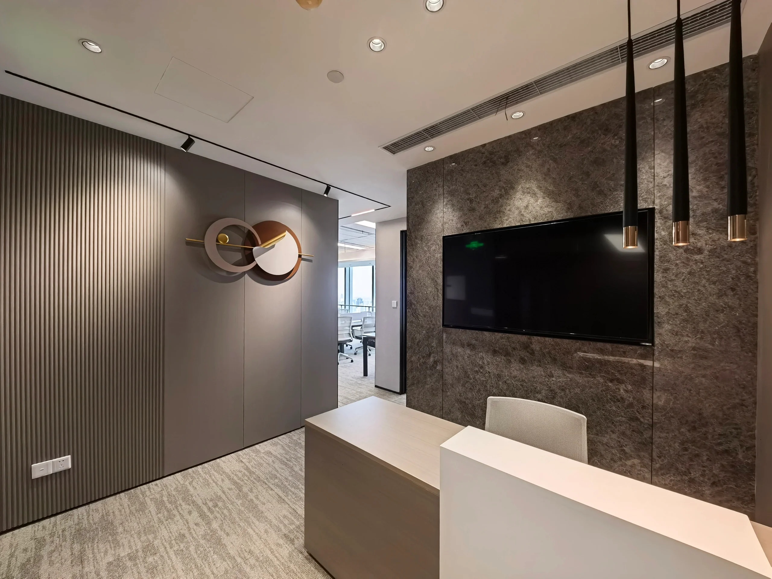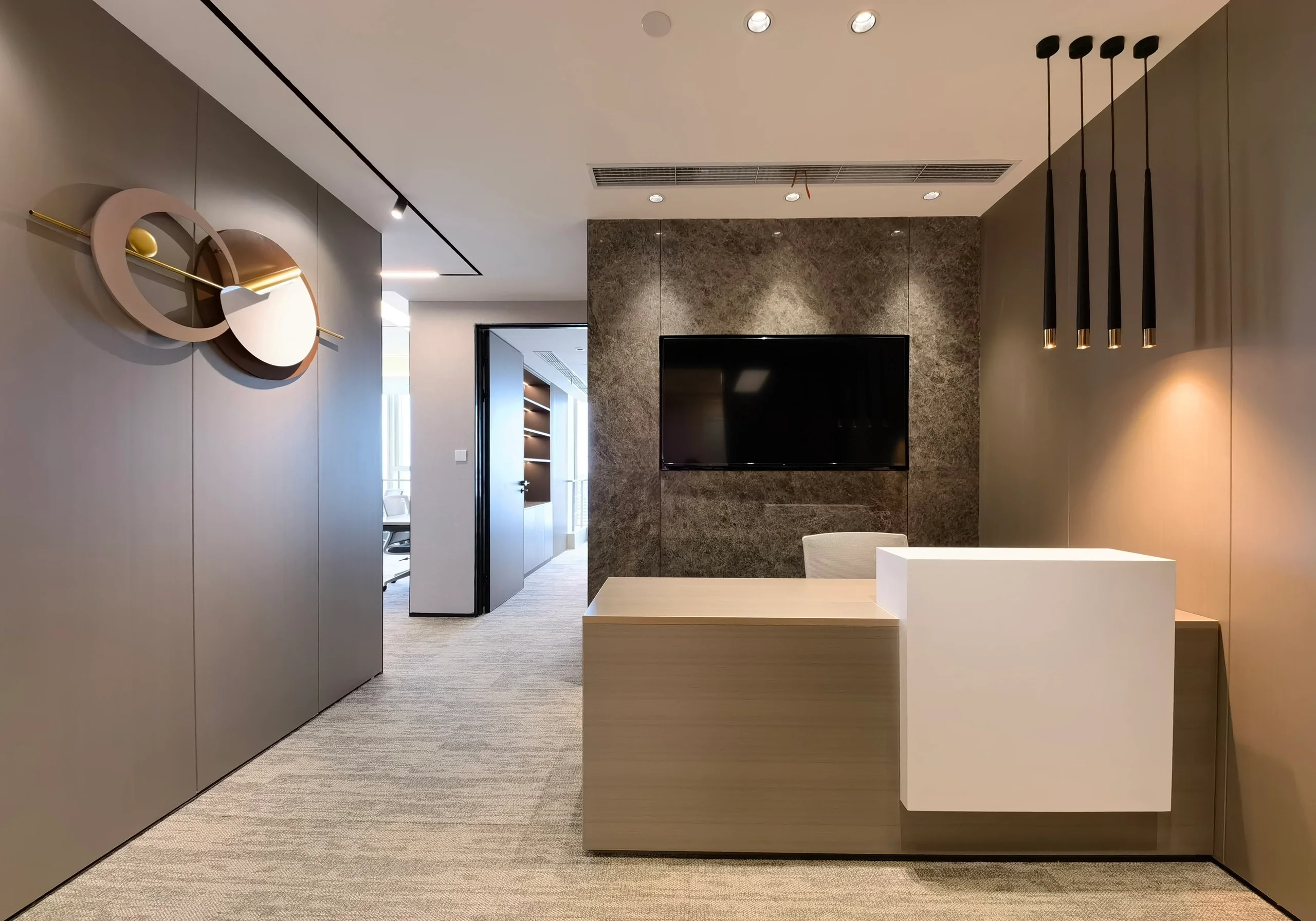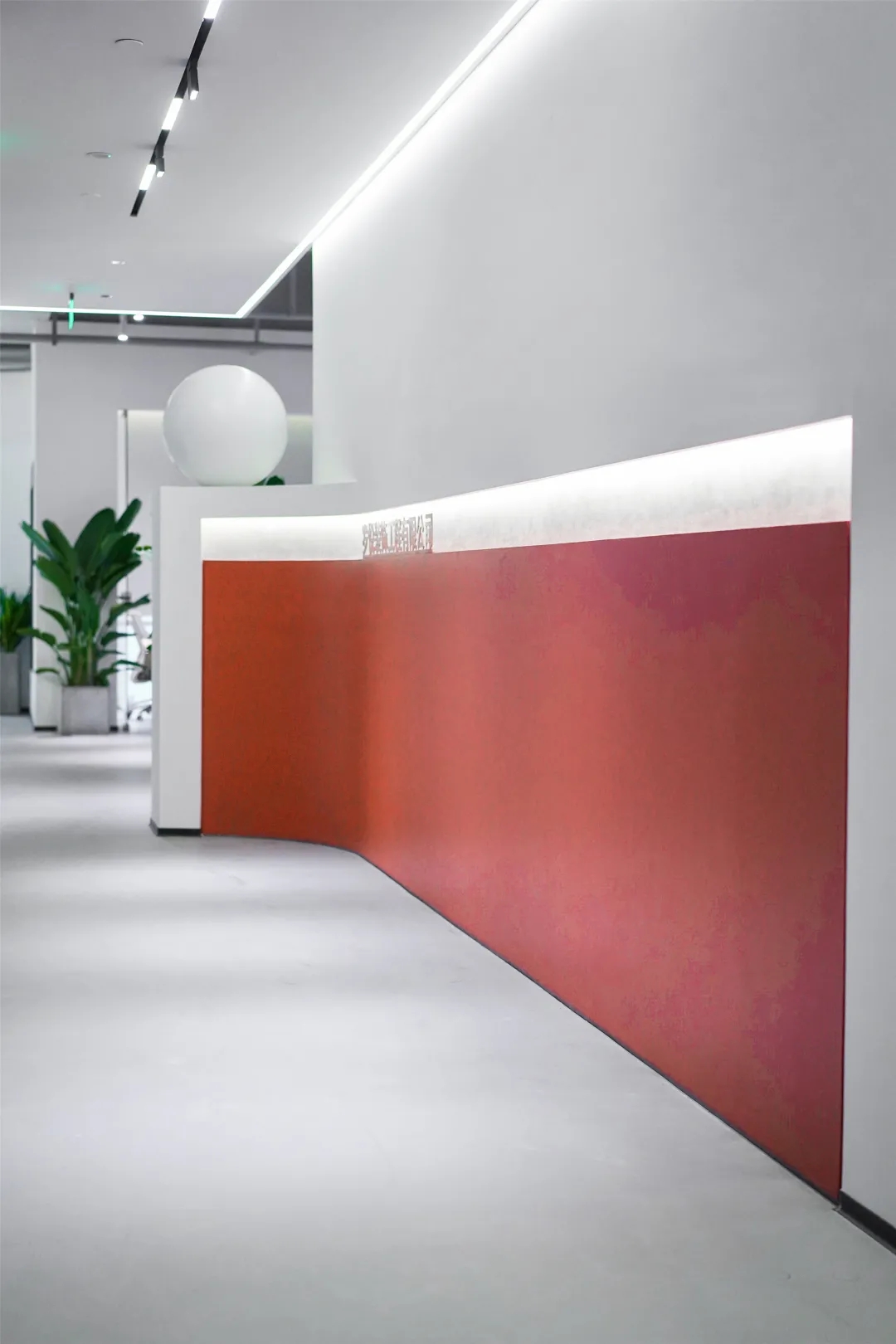 会议室和水吧是空间的核心筒,由此形成一个环形的动线。客人与员工进入公司分别有不同的路径,员工通过刷卡可以从侧面入口更有效的进入办公区域。来访的客人则需要环绕会议室外围一圈进入公司区域,这样的设计,能让客人沿途参观到公司项目和部分工艺与材料的展示,让到访者更好地了解公司的各方面业务能力。