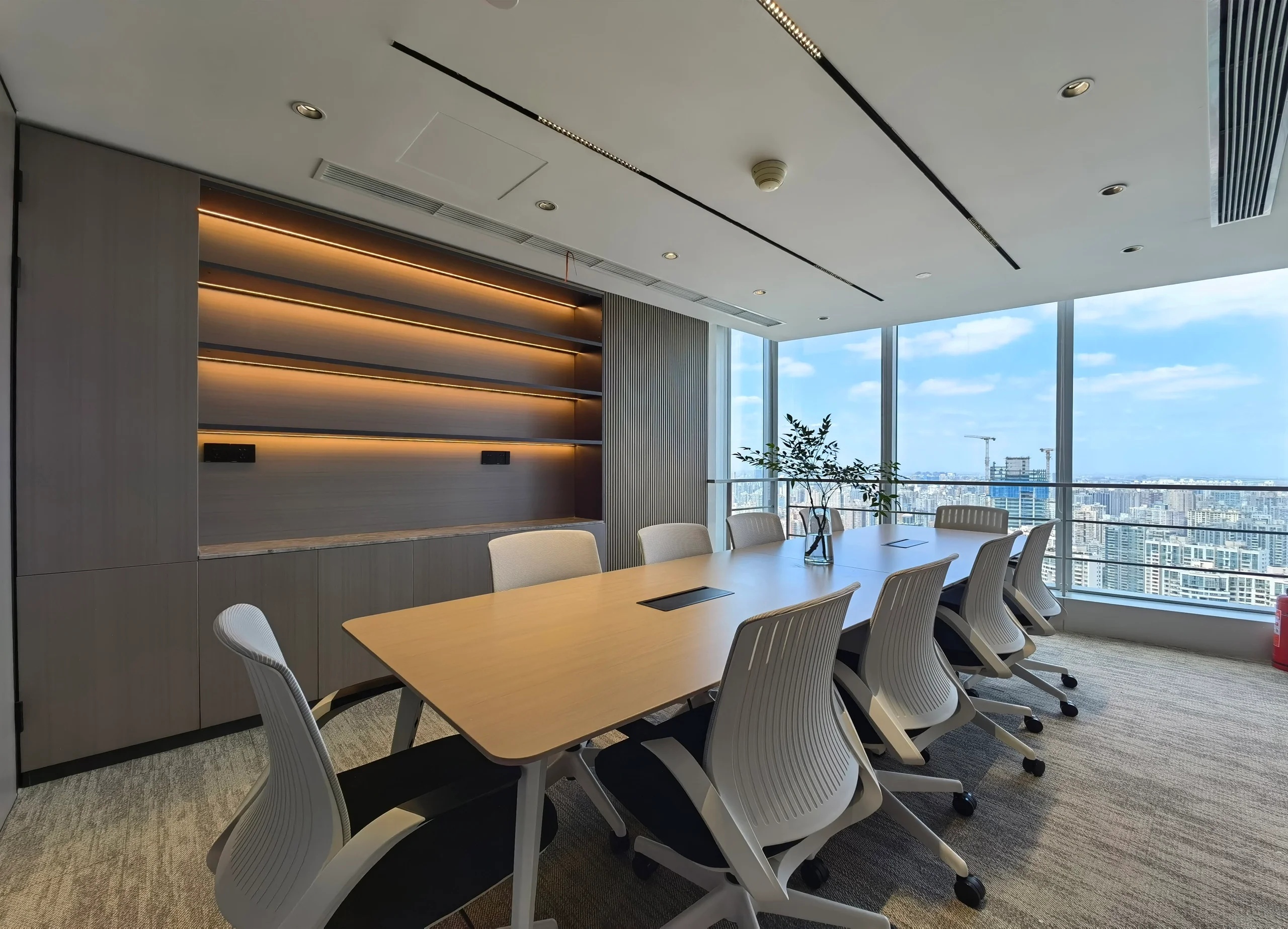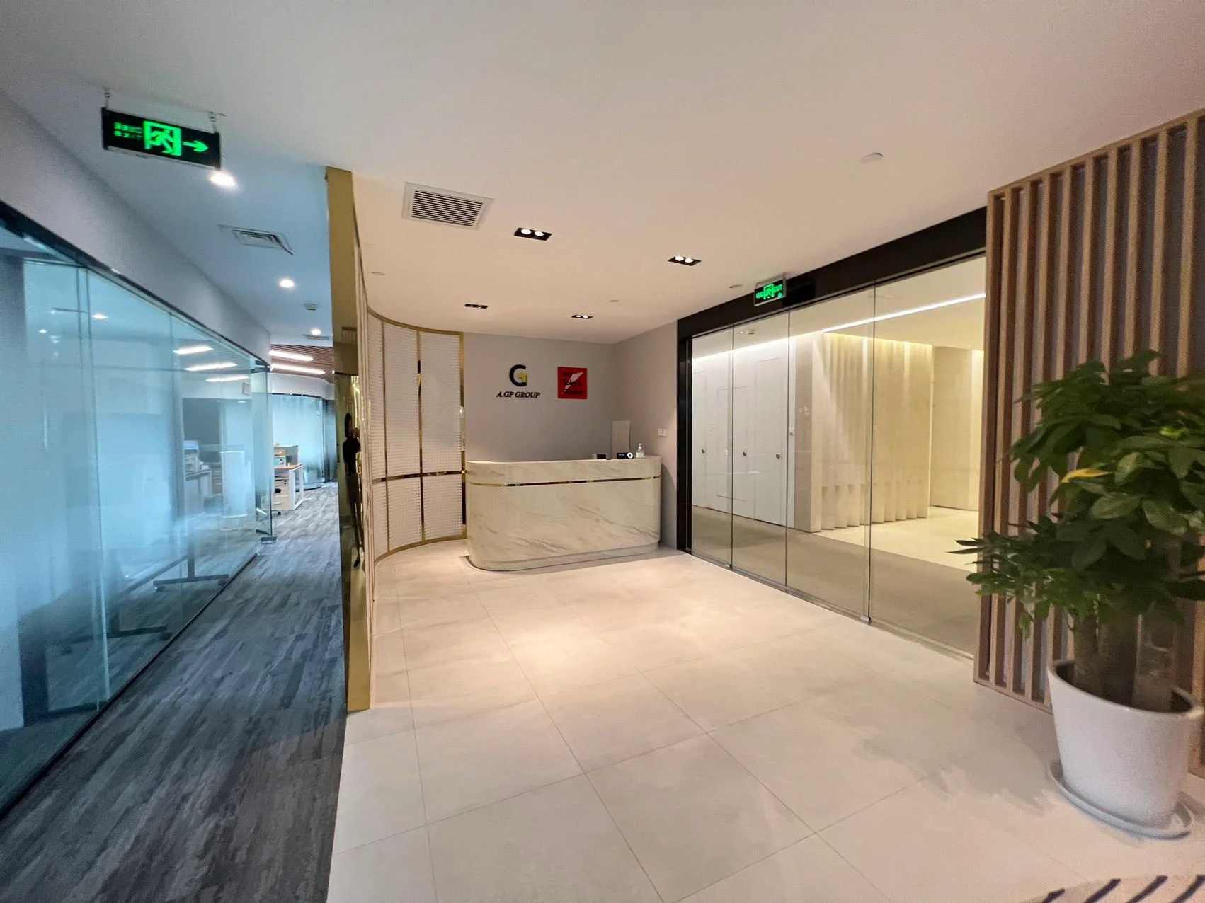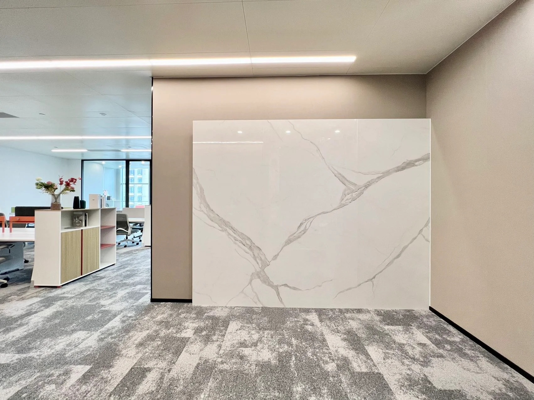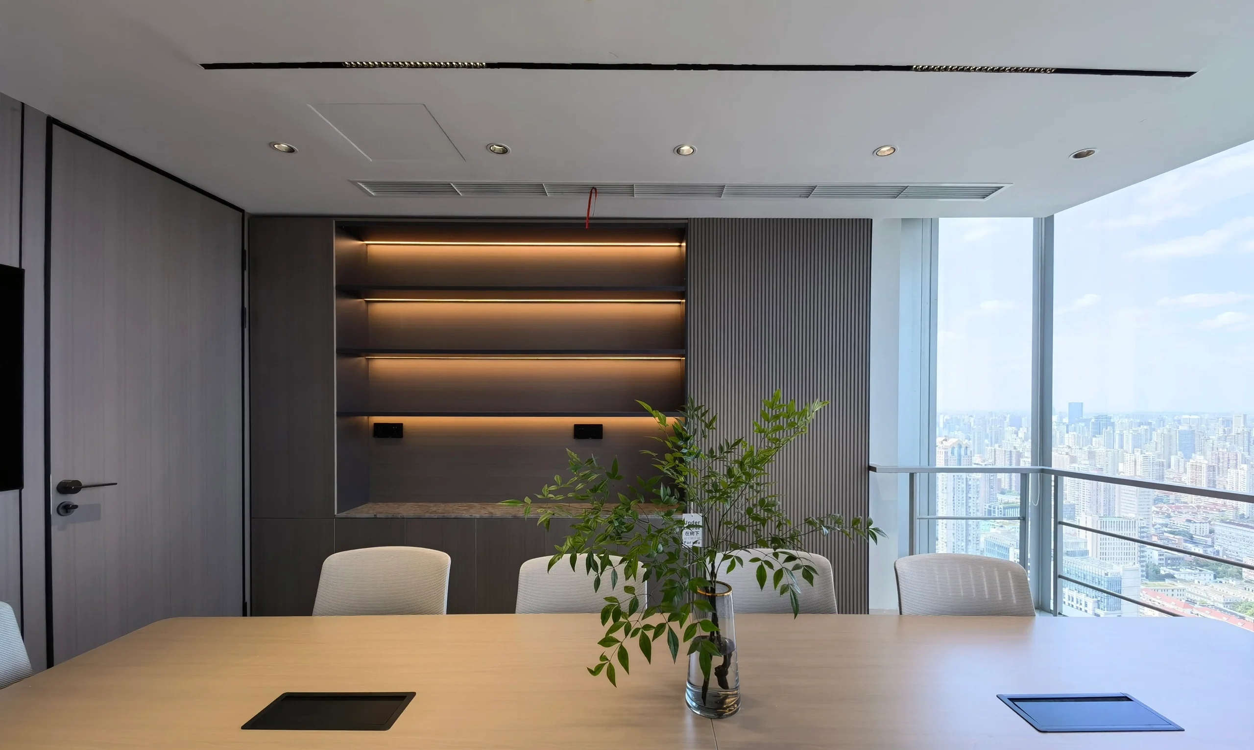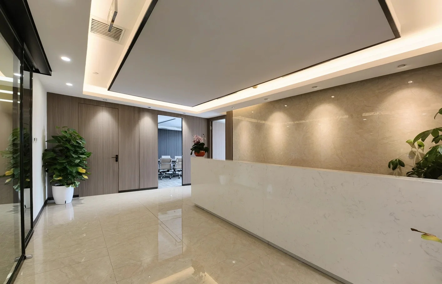会议室和水吧是空间的核心筒,由此形成一个环形的动线。客人与员工进入公司分别有不同的路径,员工通过刷卡可以从侧面入口更有效的进入办公区域。来访的客人则需要环绕会议室外围一圈进入公司区域,这样的设计,能让客人沿途参观到公司项目和部分工艺与材料的展示,让到访者更好地了解公司的各方面业务能力。