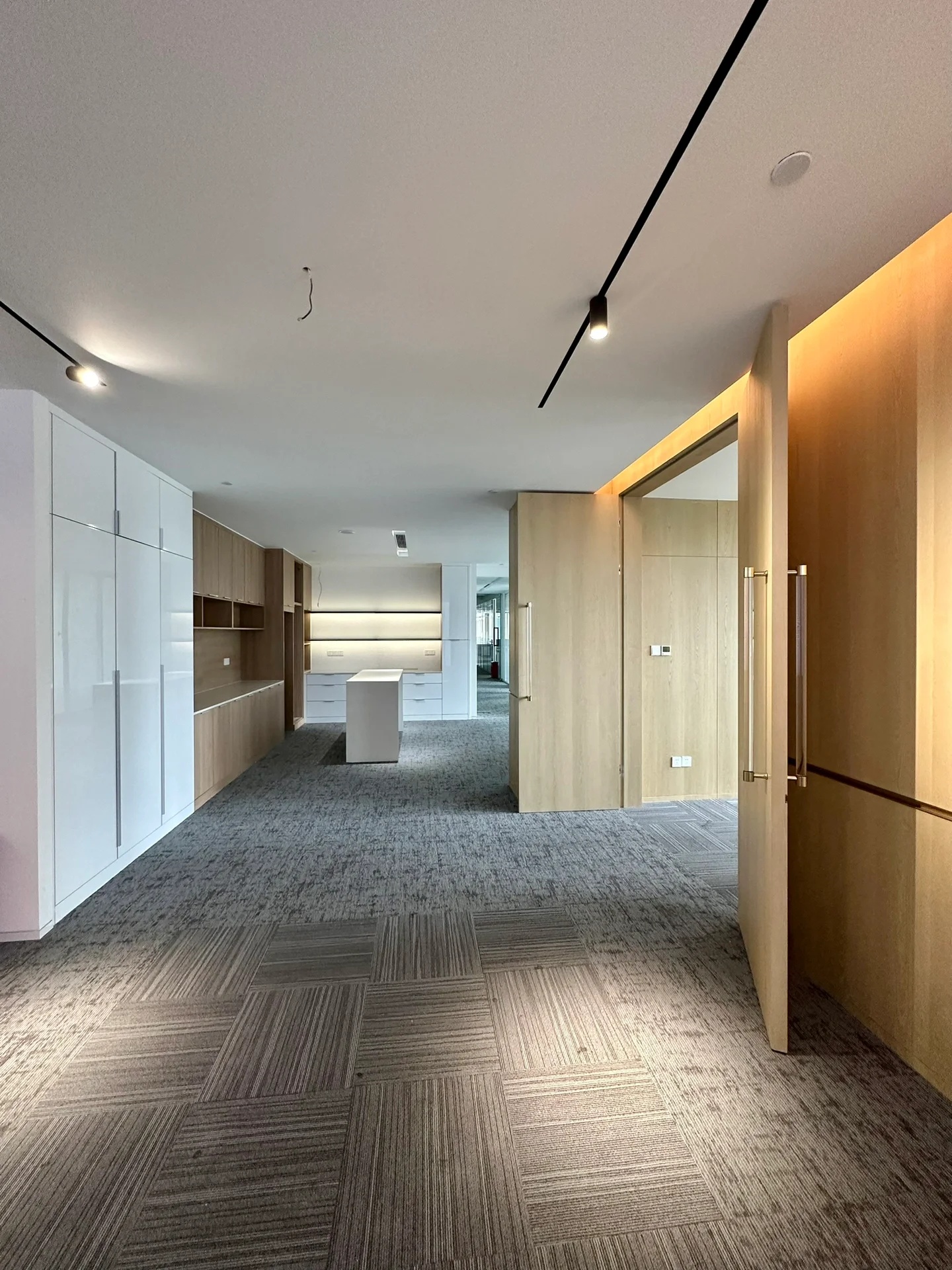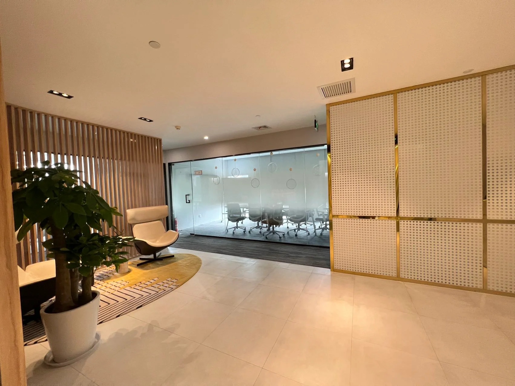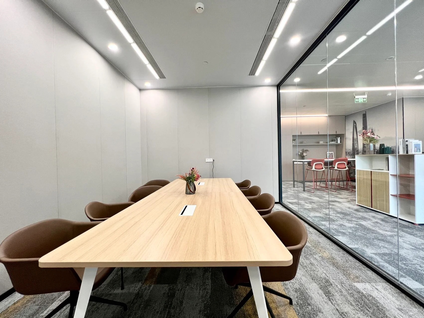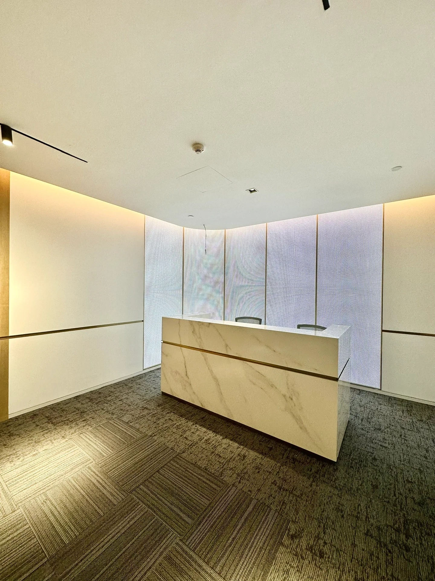 会议室和水吧是空间的核心筒,由此形成一个环形的动线。客人与员工进入公司分别有不同的路径,员工通过刷卡可以从侧面入口更有效的进入办公区域。来访的客人则需要环绕会议室外围一圈进入公司区域,这样的设计,能让客人沿途参观到公司项目和部分工艺与材料的展示,让到访者更好地了解公司的各方面业务能力。