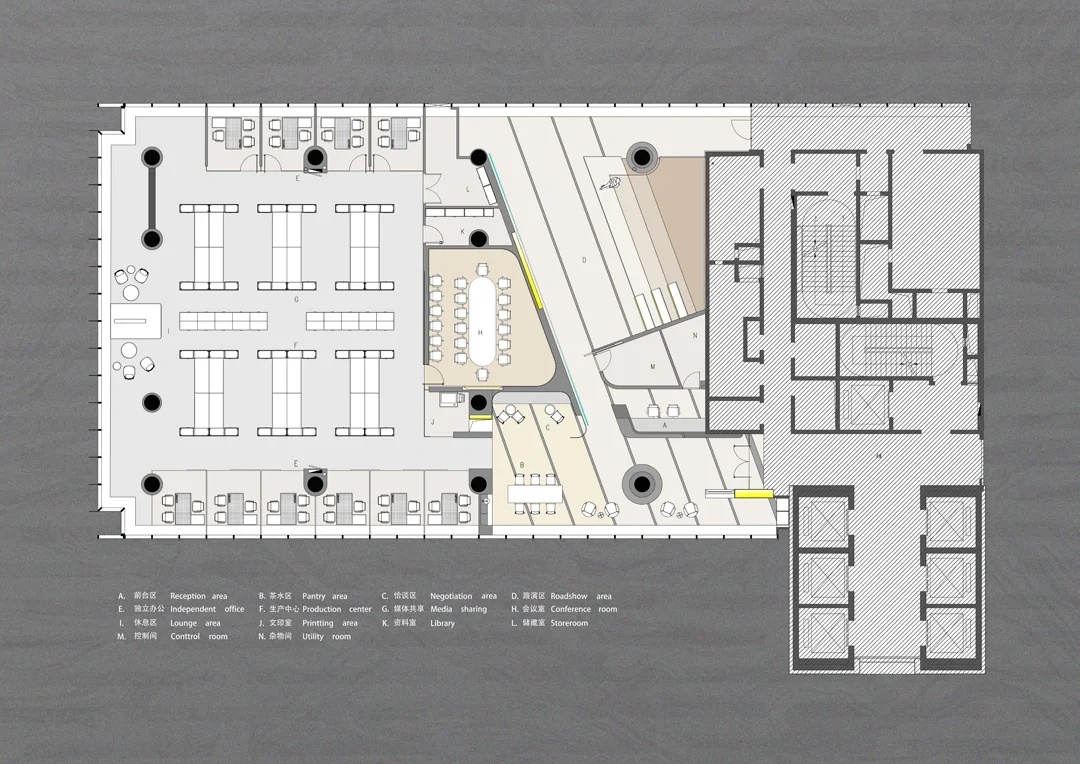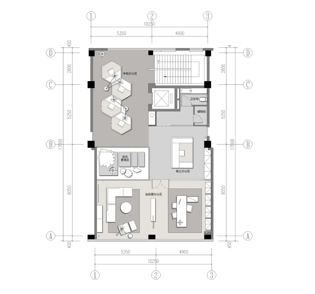 商墅源于officepark,即低密度、私密性花园式办公产品理念,相对于写字楼,商墅对于空间拓展的可实时性更强。如何把握空间节奏感的同时突出商墅本身的结构属性成为了我们这次设计的课题;