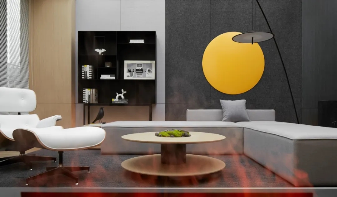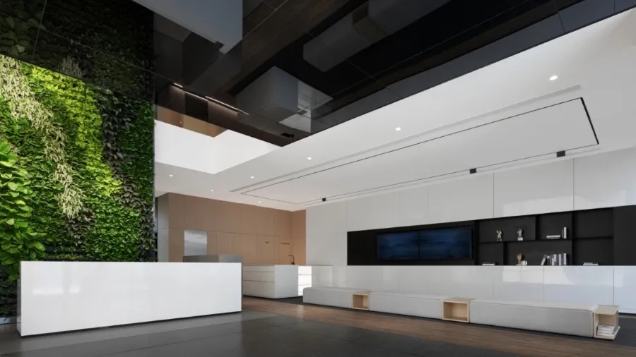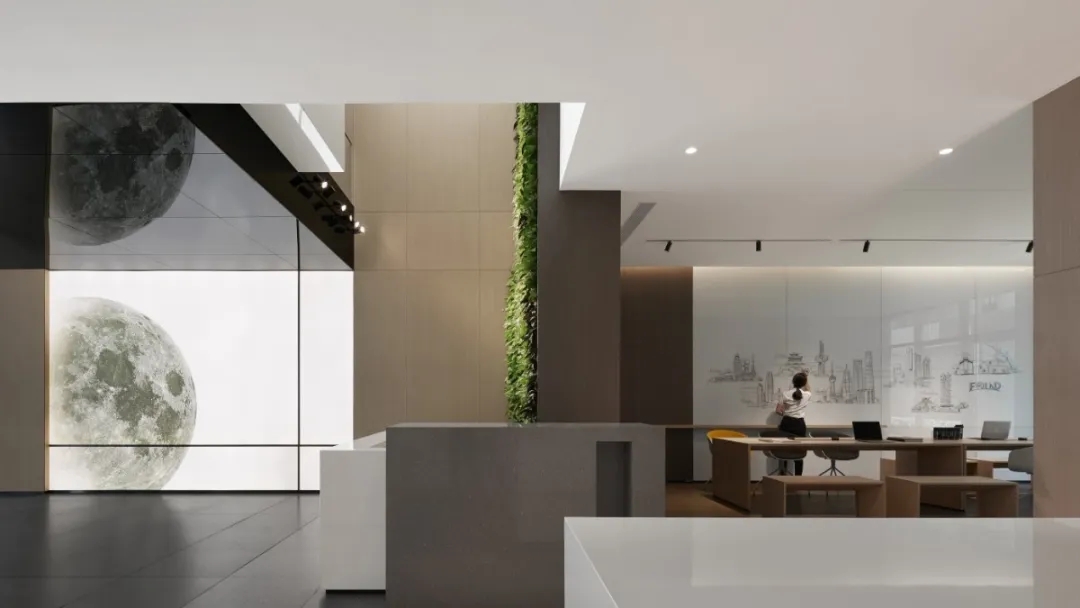 一层设计中我们将二层的楼板部分去除,用活体绿植墙进行上下贯穿,增加一二层的互动关系,突出结构的空间特性。