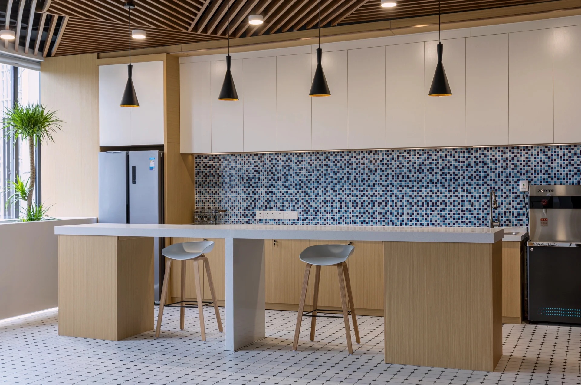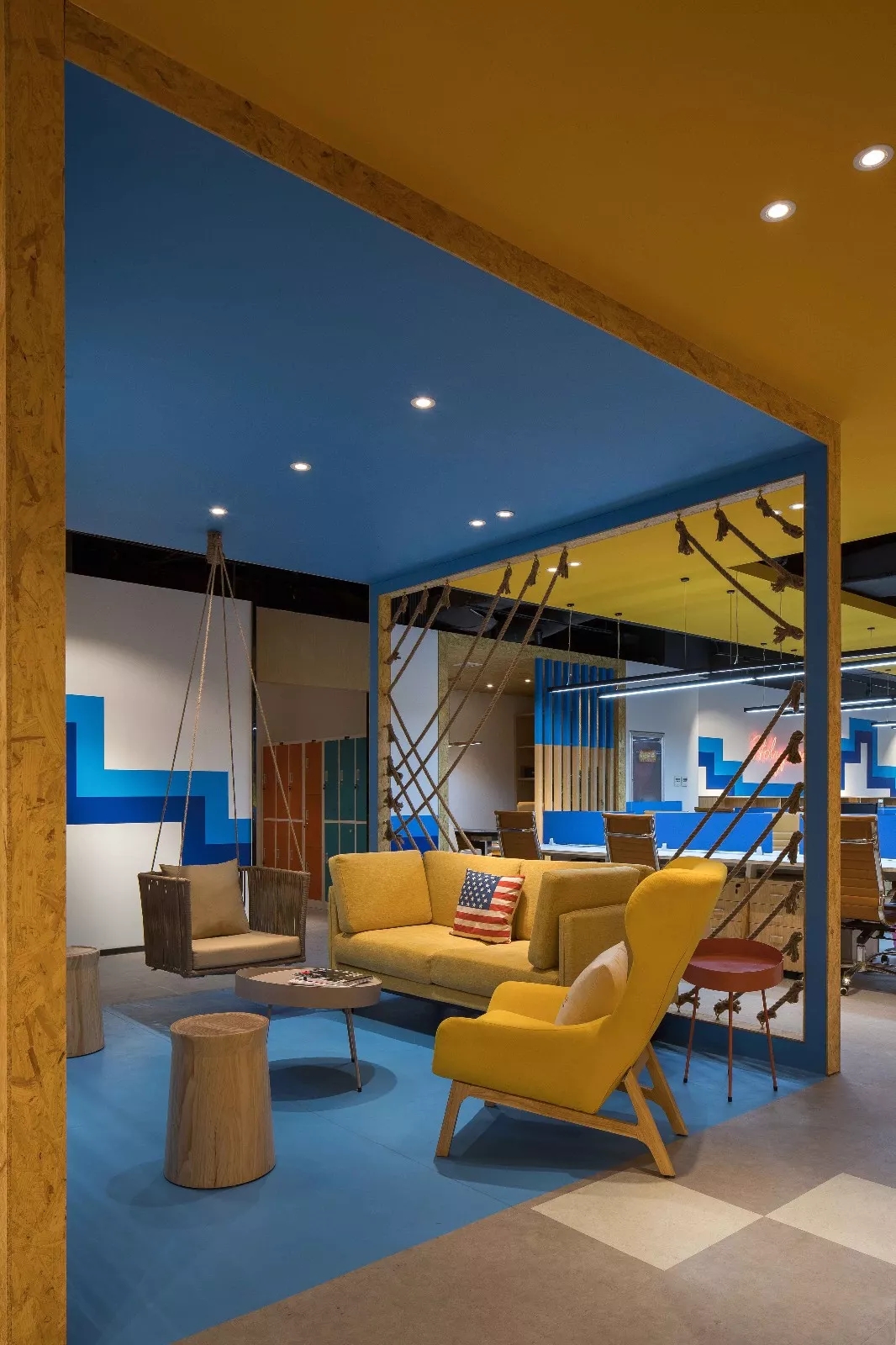 办公区休息角落可以舒缓紧张的工作节奏,懒人沙发,吊椅,大面积的白板墙面都可以成为社交和分享的通道。
