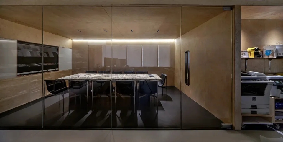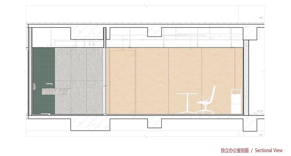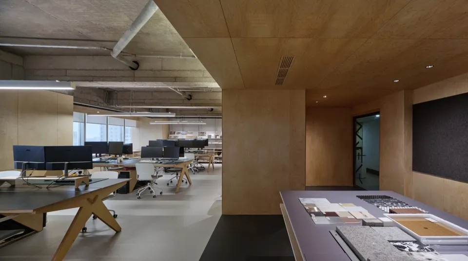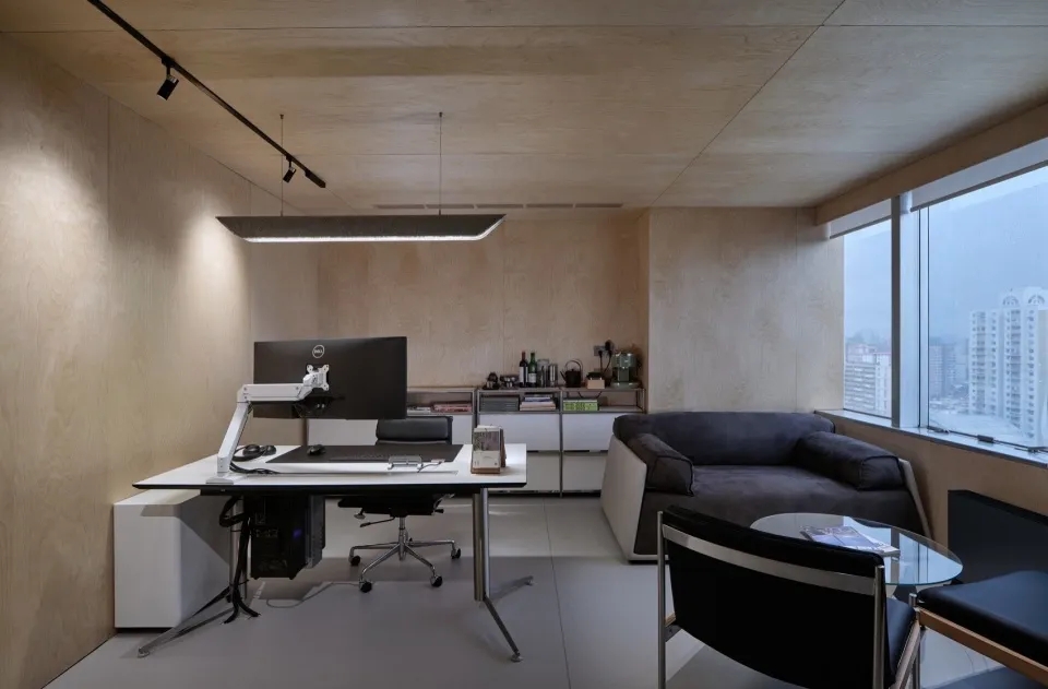 由于开放办公区一面为全景窗,另一面会议区和打印区也无法提供可用于挂图板的展示墙,实墙面显得尤为珍贵,因此决定将独立办公室由原来的玻璃隔断改为实墙隔断,靠窗一侧巨大的钢筋混凝土柱下半部分也用桦木多层板包裹,用作展墙功能。