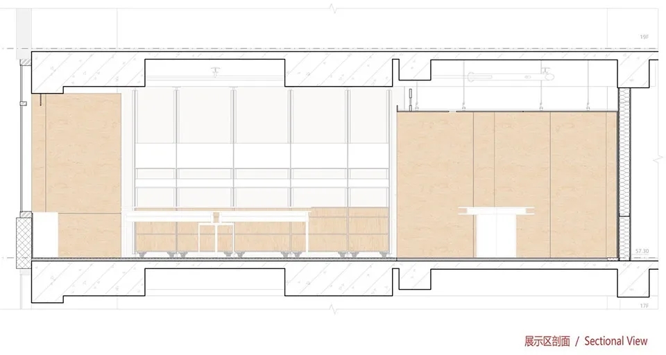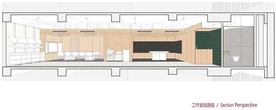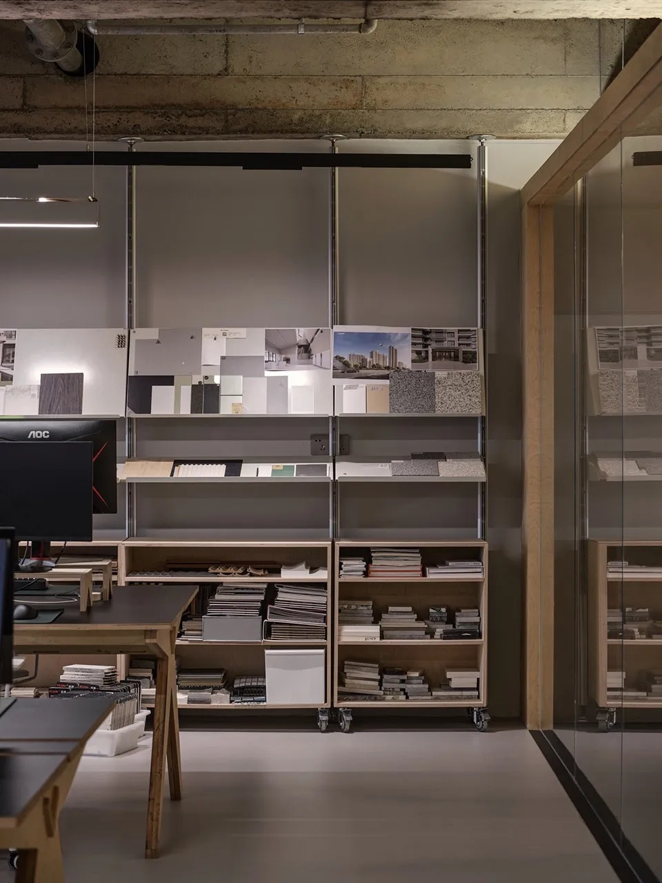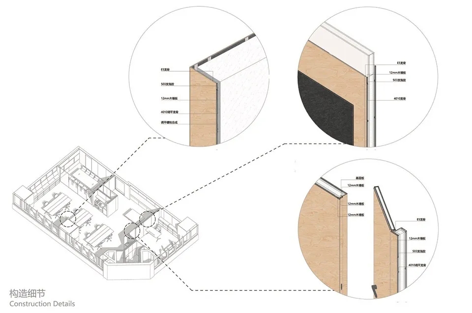 装配式的建造方式由来已久,在今天追求大规模工业化的背景下似乎更能体现某种时代精神。不同于常规室内装修的固定性和不可变性,我们选用了装配式的方式组建新系统,装配式的灵活性和模块化很好的契合了自适应设计理念,通过背后的装配式五金让新的墙板及天花与原始结构完全分离,我们希望传达的是一种临时性和可变性,新的系统应当具备足够的灵活性,以适应未来可能出现的使用需求调整。