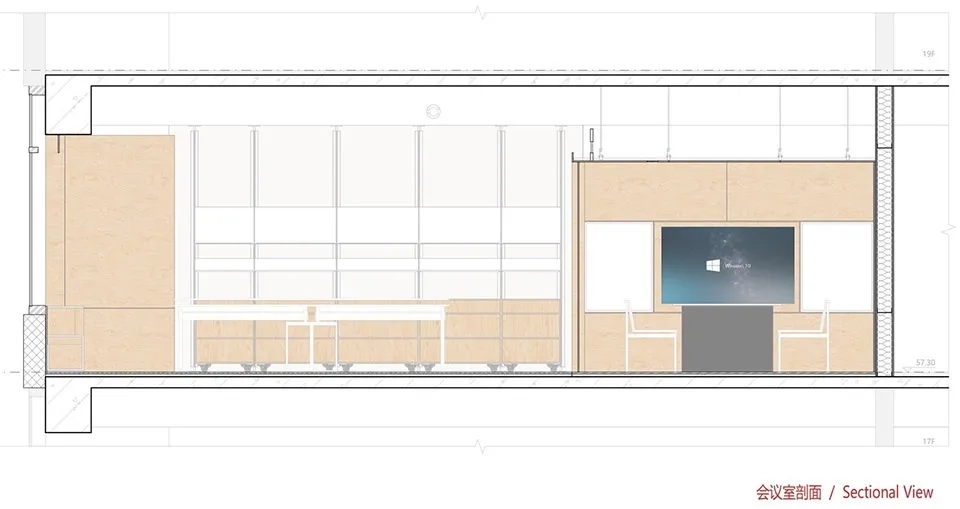 无论是门厅会议功能区的吊顶还是包柱子的墙板抑或是孤立悬于梁下的窗帘盒,似乎都以一种即兴表演的形式独立于原有的钢筋混凝土框架系统而存在,但组合在一起两者之间又隐约有某种新老对话。