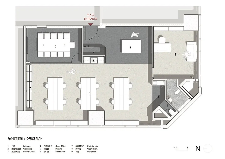 为此我们将原有建筑与改造部分视为两套相互独立的系统。拆除旧的天花隔墙后,意外的发现原本的混凝土框架系统依然保存完好,但老旧的空调系统及桥架路由妨碍了空间净高的最大化,也不适合未来设想的办公格局,将其拆除后归拢至走道一侧,原本2.2米的室内净高得到释放,空间豁然开朗。在管线的下方顺理成章的依次布置门厅-机房-会议室等对空间净高要求相对较低的功能。同时这一组功能块也起到了缓冲区的作用,不仅在视线上也在隔音方面减少了外部对办公区的干扰。