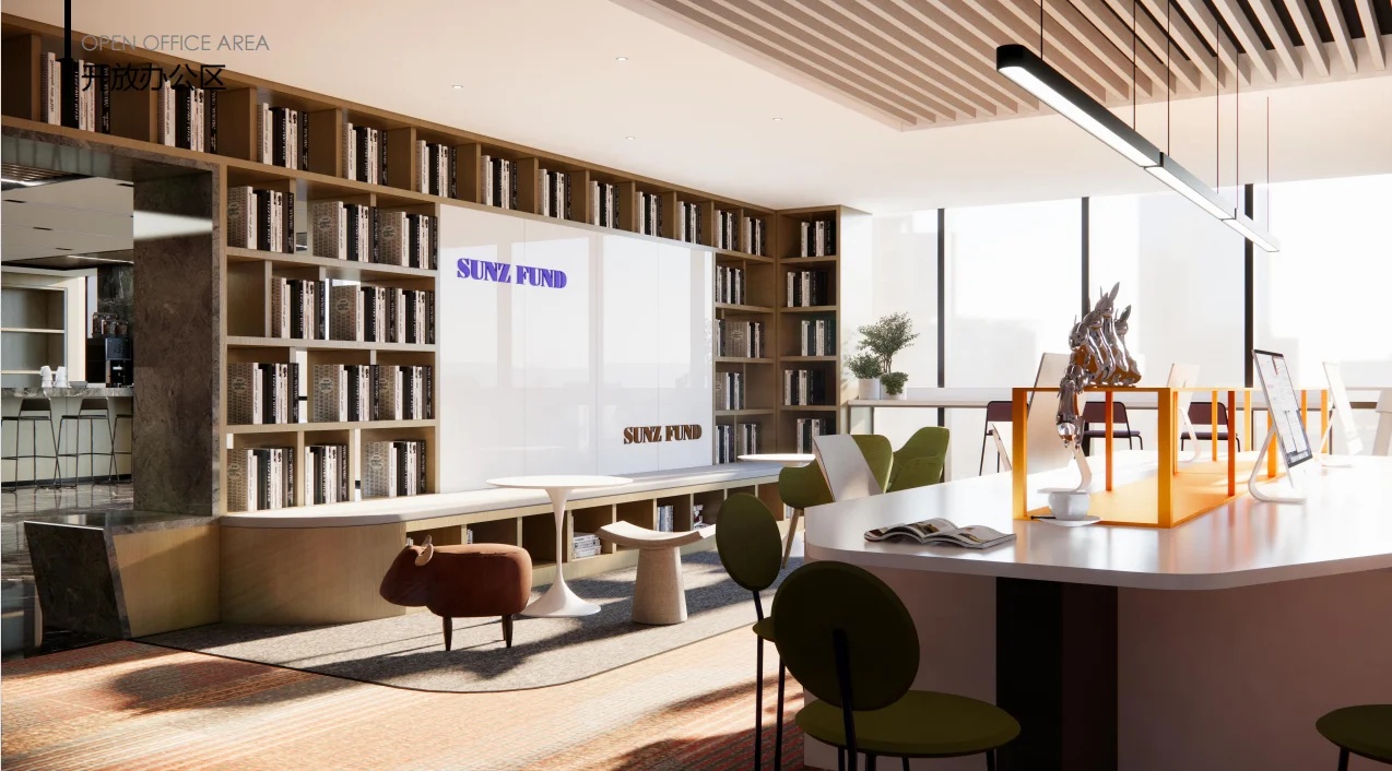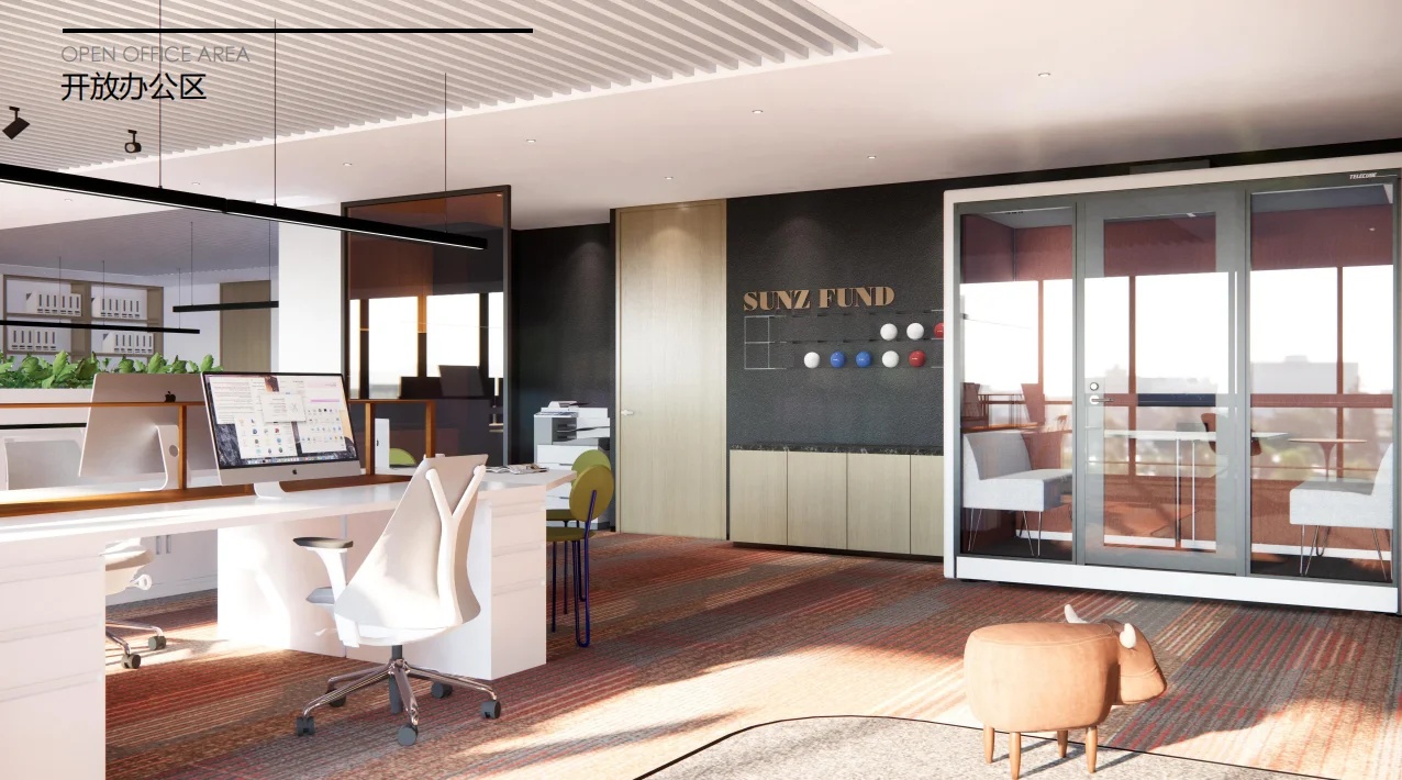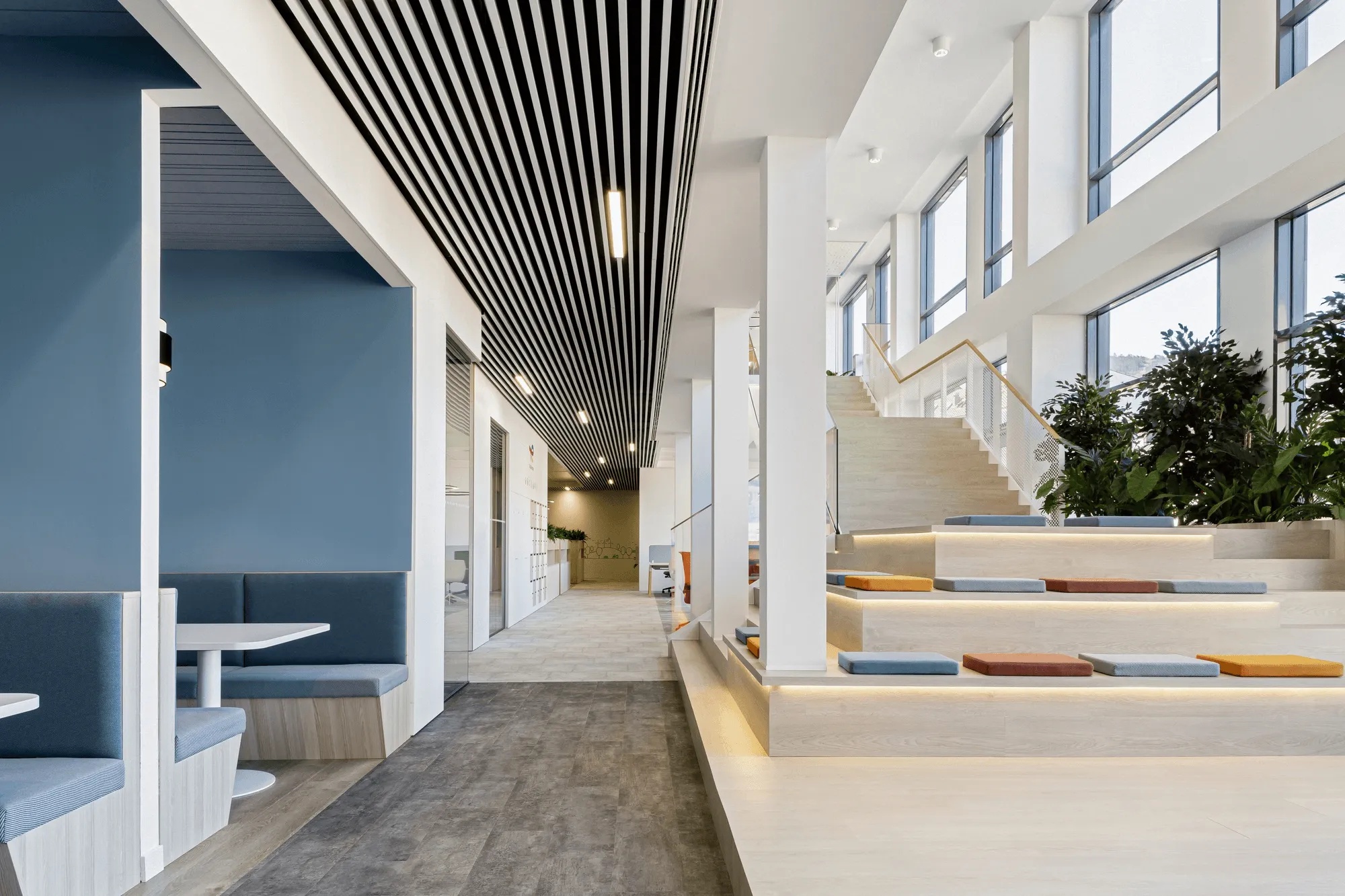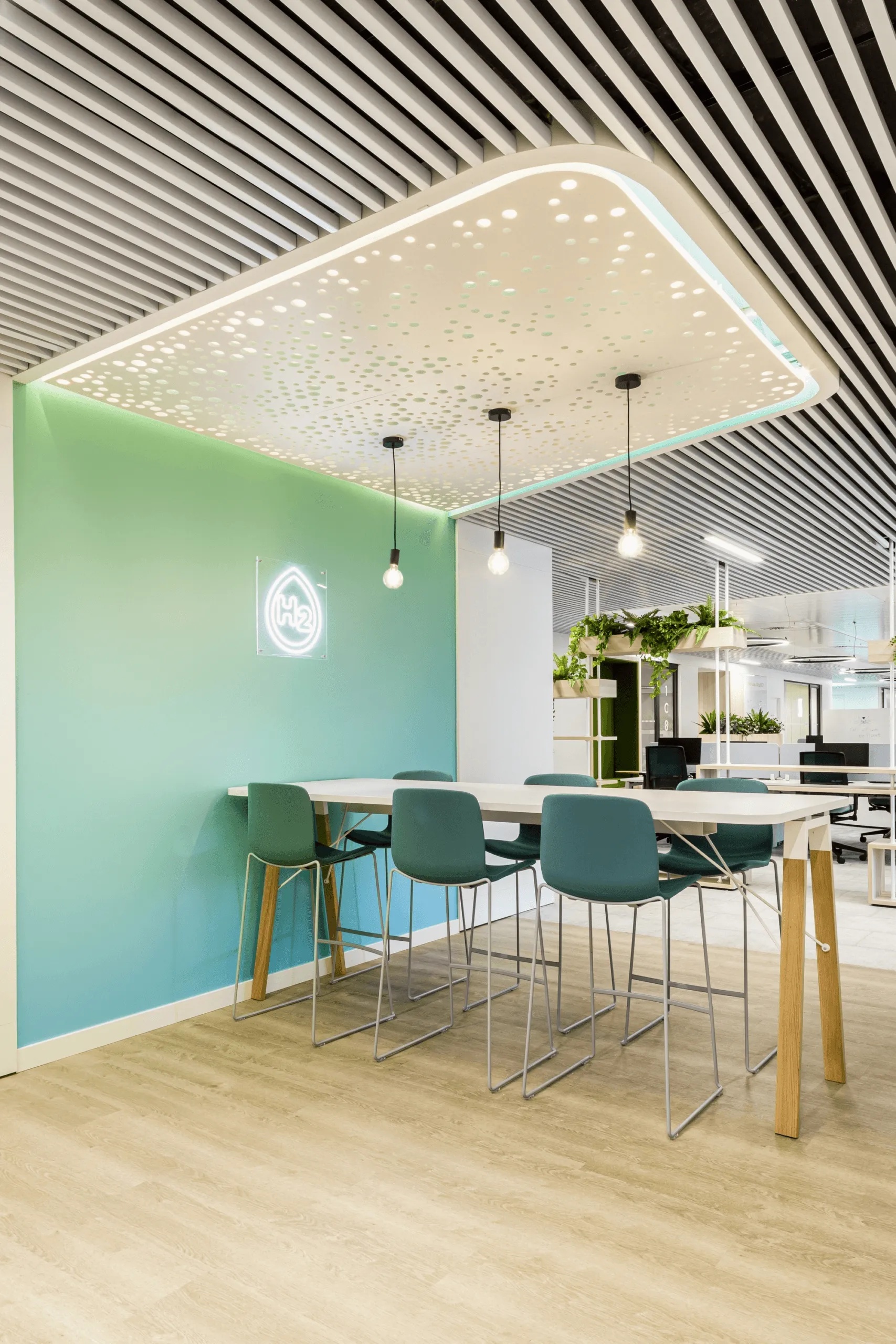 设计师打造了这个 "能源广场",10 个能源广场赋予了总部活动中心的生命和活力。每个广场都以能源类型为主题,以传达公司新的多能源定位,并使该能源公司的新发展道路具体化。这些广场经过精心设计,采用了背光纺织天花板,或通过穿孔隔音板的顶光,这些穿孔隔音板上根据每种能源类型都有相应的图案,还采用了鲜艳的色调和霓虹灯图标,与项目其他部分的灯光和发光颜色一起,激活了地板中心的绿色元素。