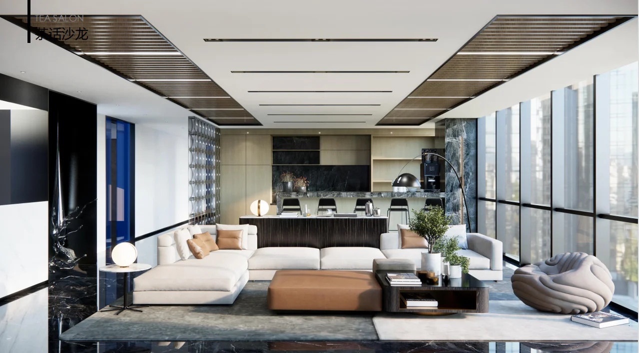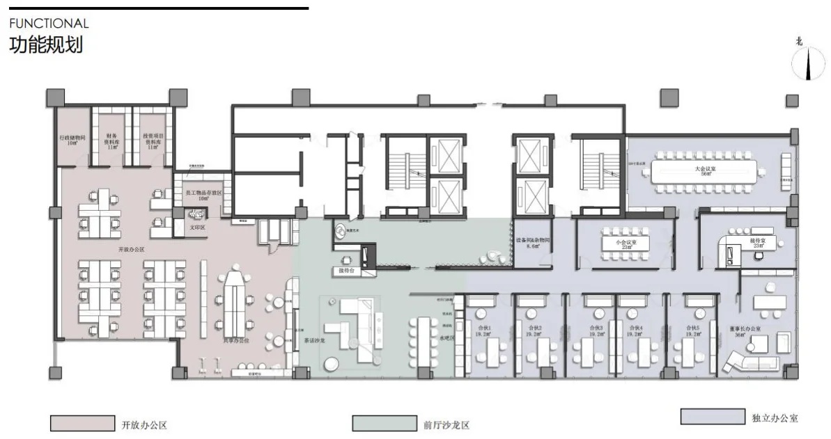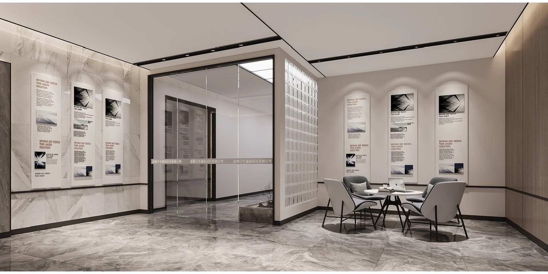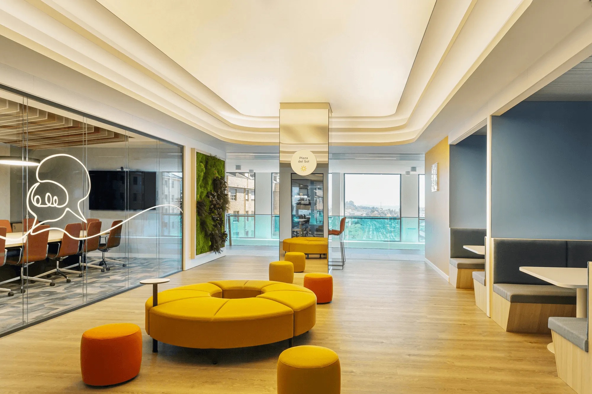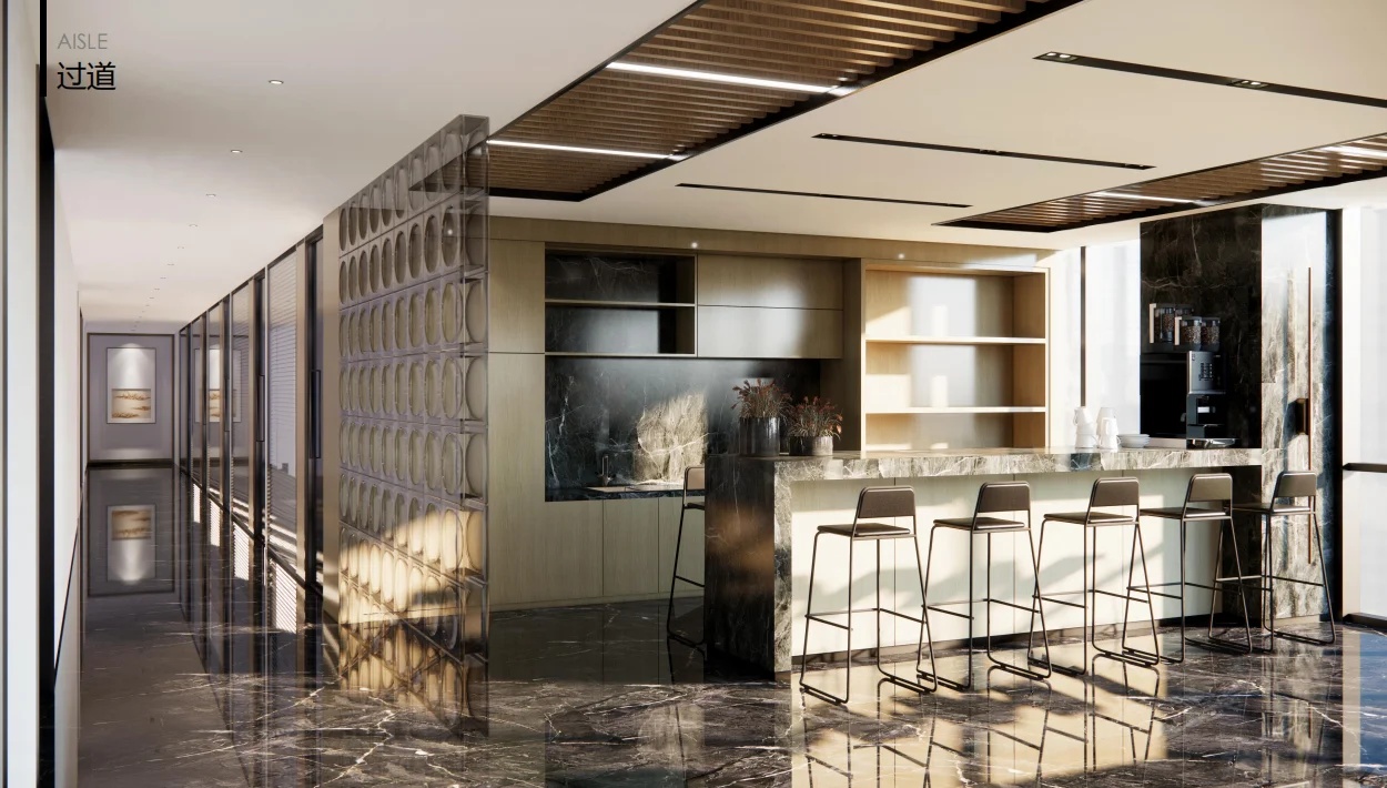 设计师打造了这个 "能源广场",10 个能源广场赋予了总部活动中心的生命和活力。每个广场都以能源类型为主题,以传达公司新的多能源定位,并使该能源公司的新发展道路具体化。这些广场经过精心设计,采用了背光纺织天花板,或通过穿孔隔音板的顶光,这些穿孔隔音板上根据每种能源类型都有相应的图案,还采用了鲜艳的色调和霓虹灯图标,与项目其他部分的灯光和发光颜色一起,激活了地板中心的绿色元素。