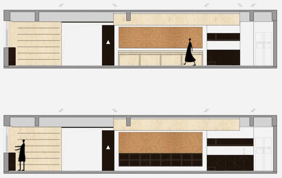 原木色的体块把材料展示区和卫生间分隔开来,既是隔断,也是展示架。木材的表面肌理与质感突显了不同材料的色彩本质,更强调了这个区域的独立性。