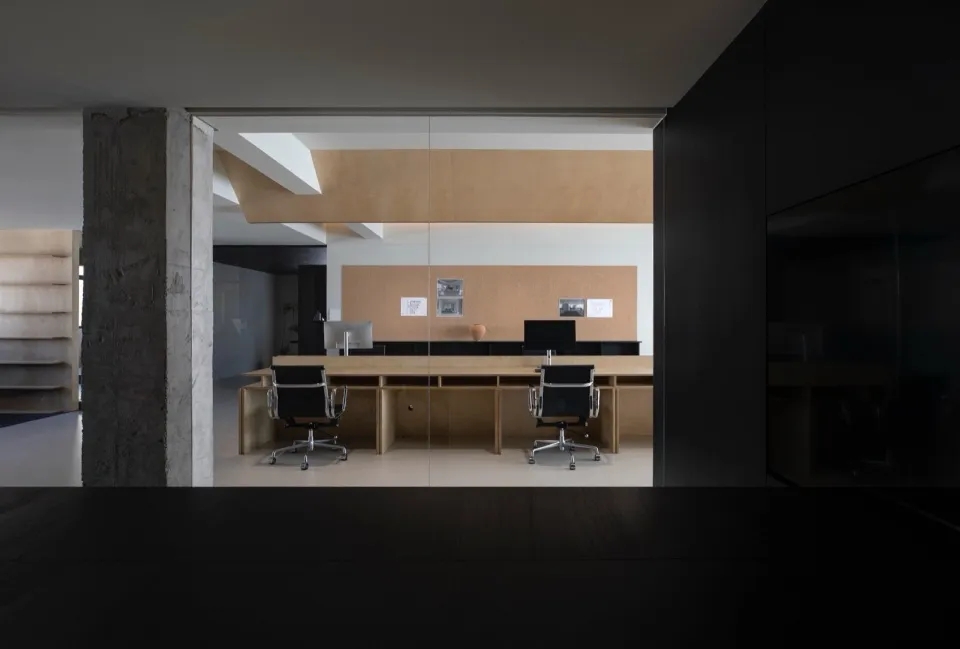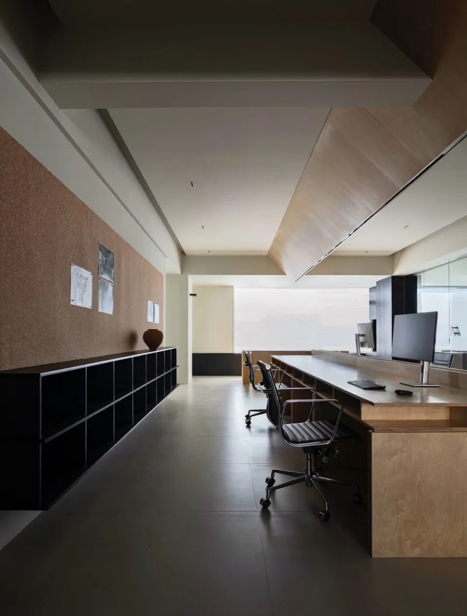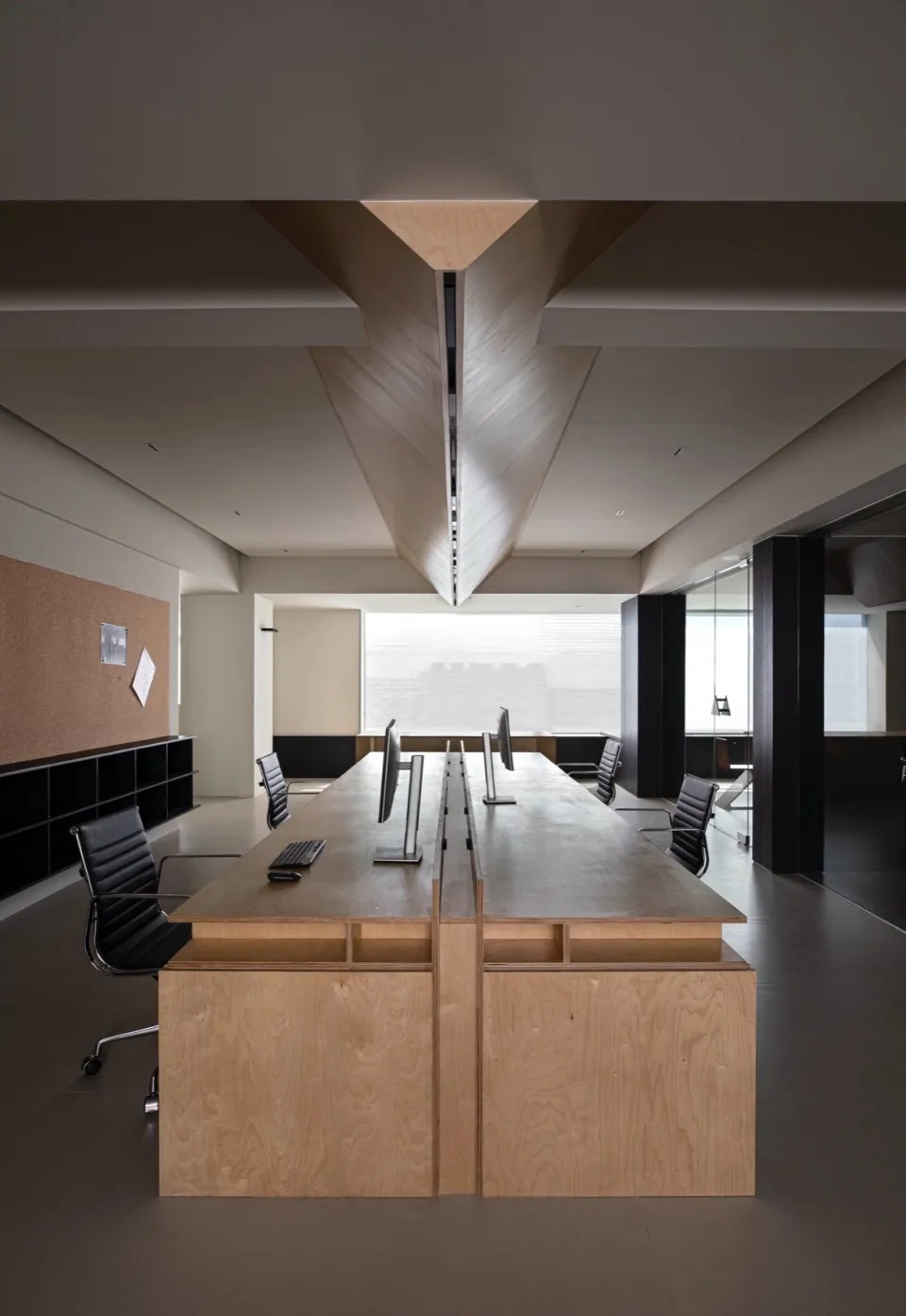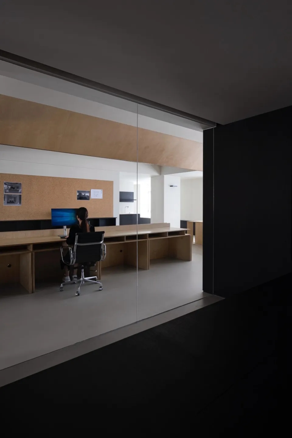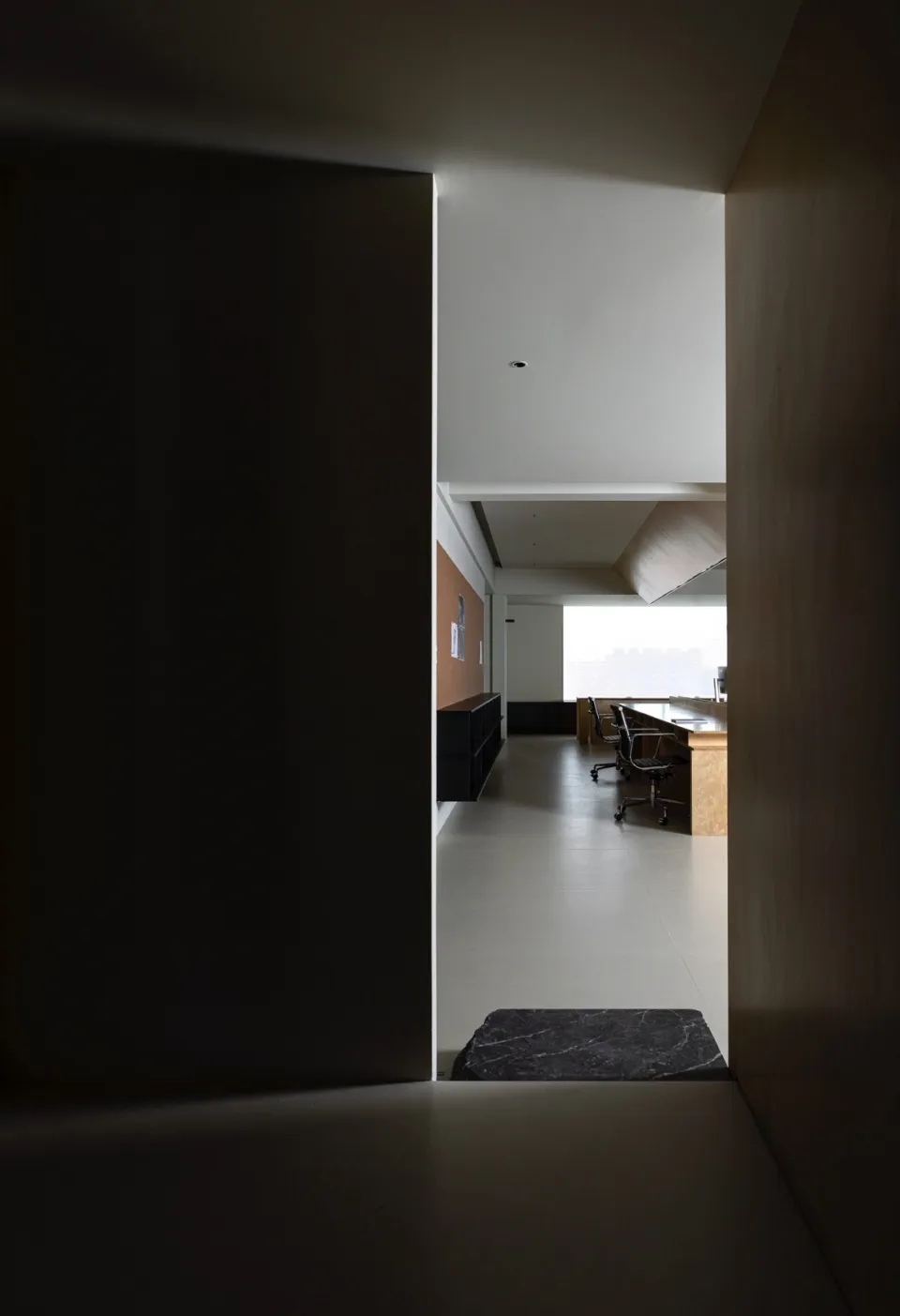 L型走道连接各个空间,并随着序列的递进而呈现出明显的层次和材质变化。走道延伸至总监办公室,结合另一侧的玻璃门形成一条环形回路,通过空间的互动达到使用效率的最大化。