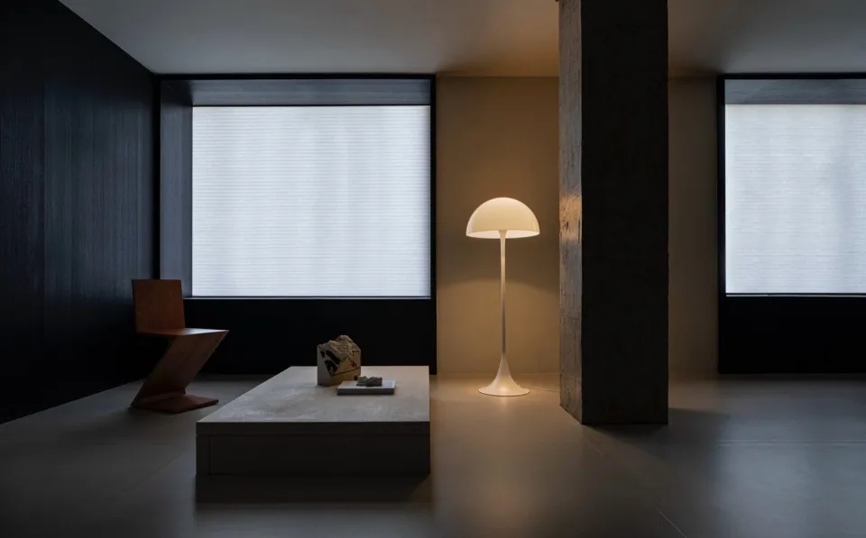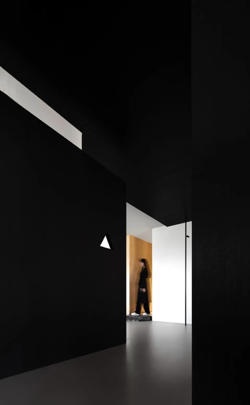 在门厅处,我们用大片面积的黑色木材营造出一种神秘的氛围。玄关上的三角形开口设计打破了空间界限,使原本分隔的空间于若隐若现的视线交流中建立联系,增添趣味性和设计感。