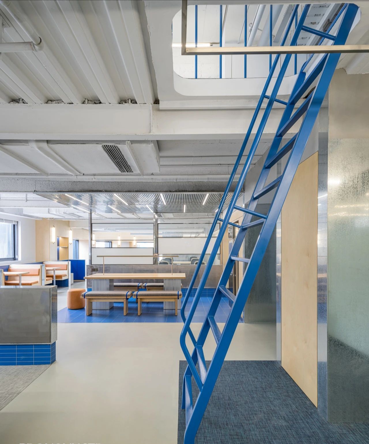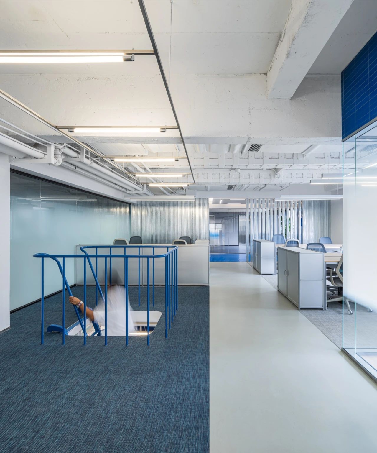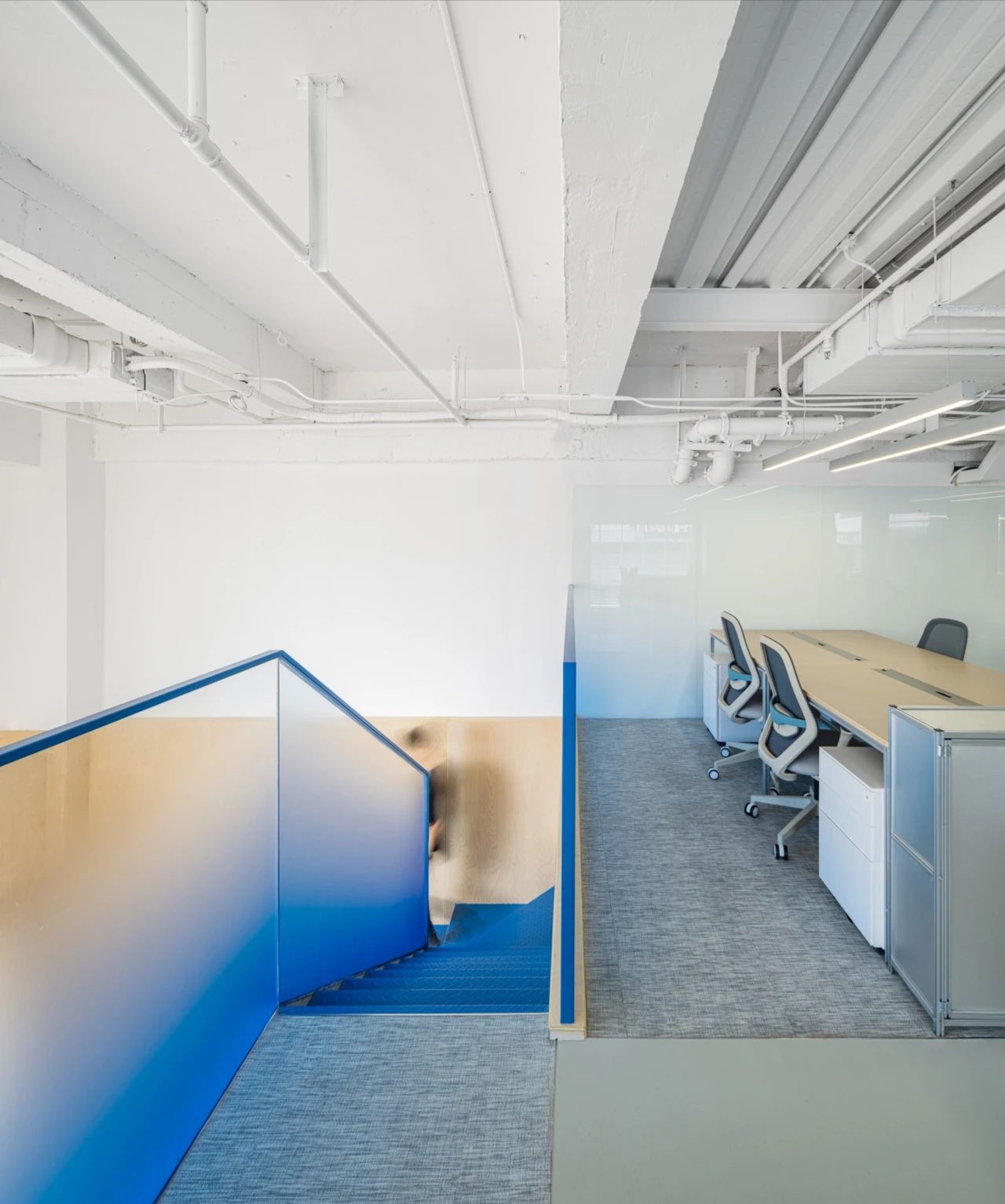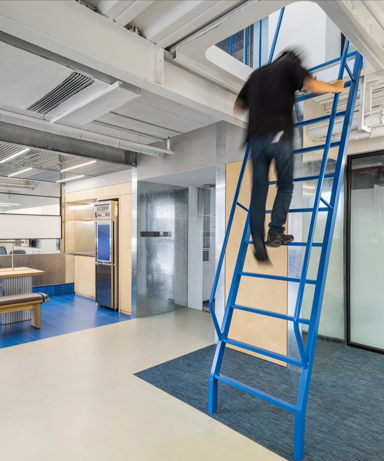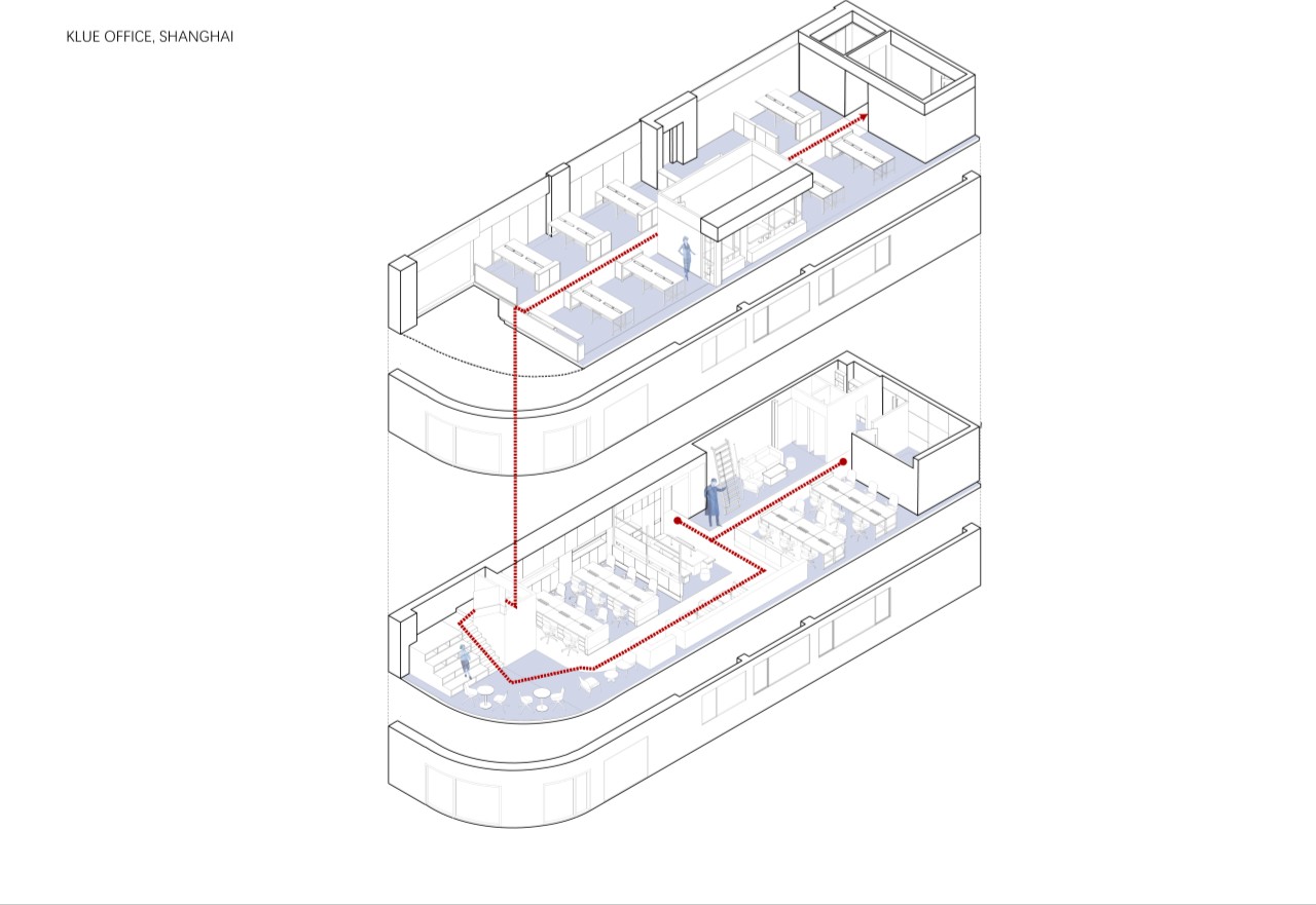 在节奏上,设计采用错位、收放、遮蔽等手法,不断将多样变幻的形式注入其内,在有效的工作秩序中增添趣味性与可读性,消解并破局狭长形态的固定感受。KLUE办公室中的纵向交通有两处,在尽头的步行梯结合了休闲的大台阶,满足同事间的非正式交流、阅读以及部分储物功能;而设在中间位置的消防爬梯则极富乐趣,使用者可以像在“超级马里奥”的游戏中一样,以最快速度穿行于上下两层,这对创意工作者而言极为便捷:当脑海中灵感闪现,身影也能随心而动,最大限度地节约交通时间。