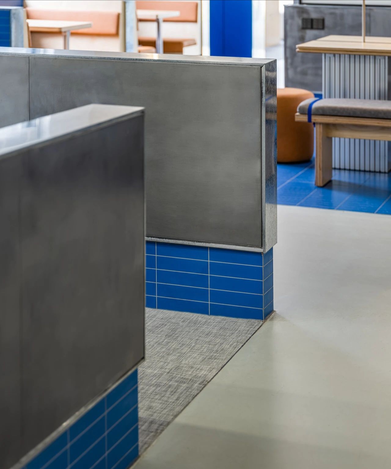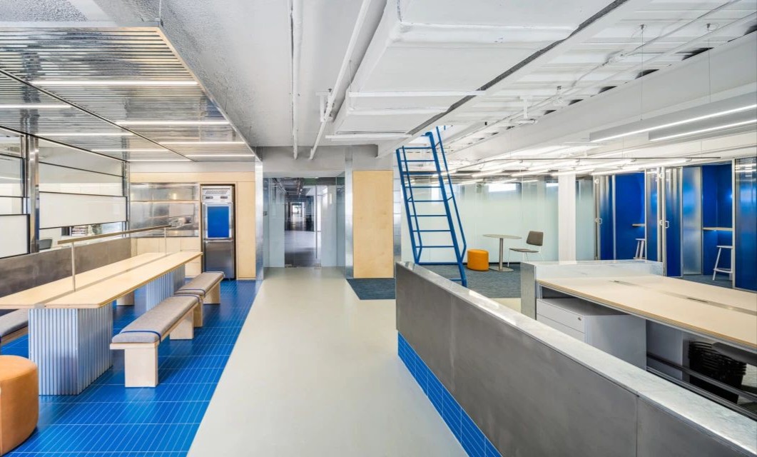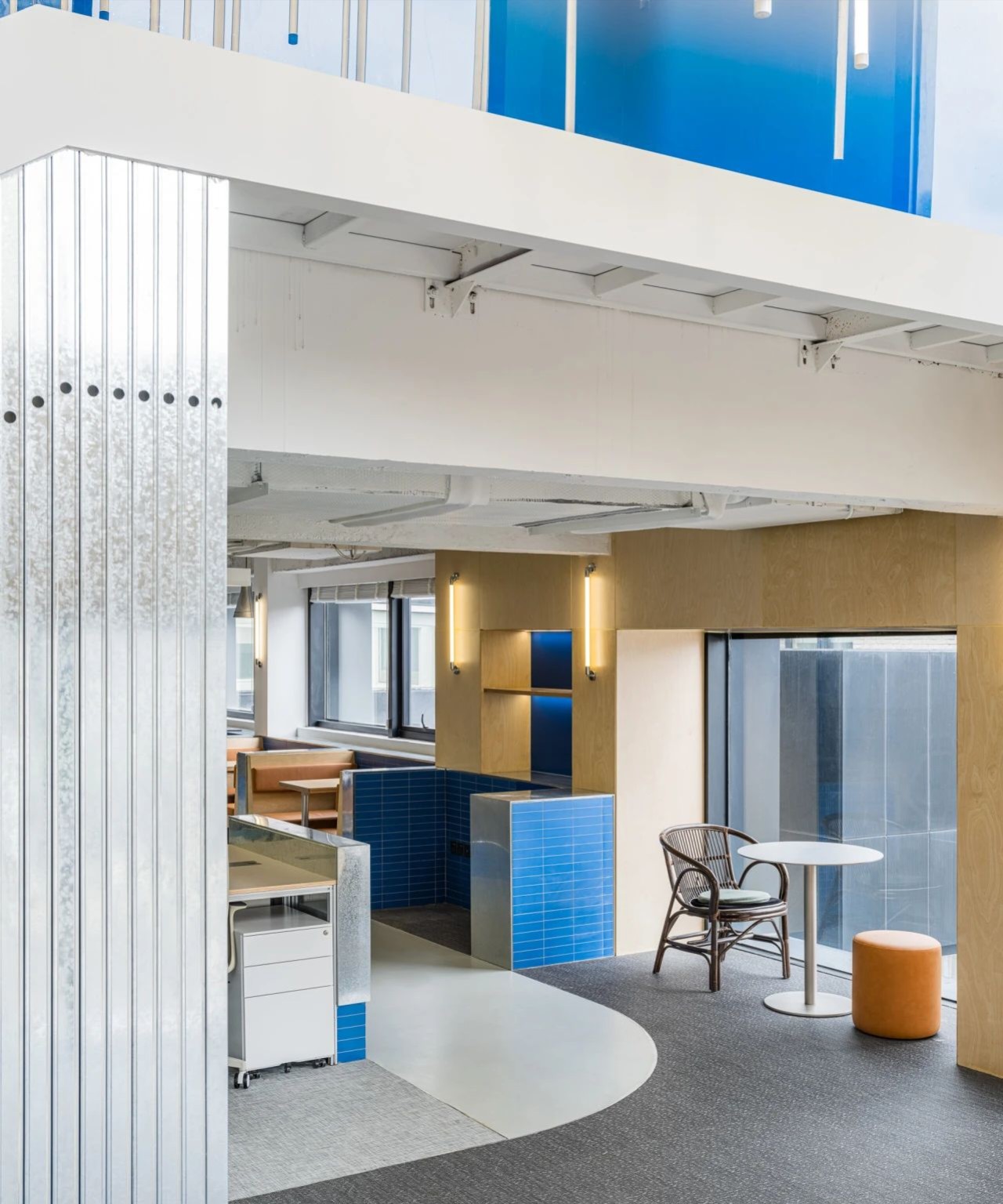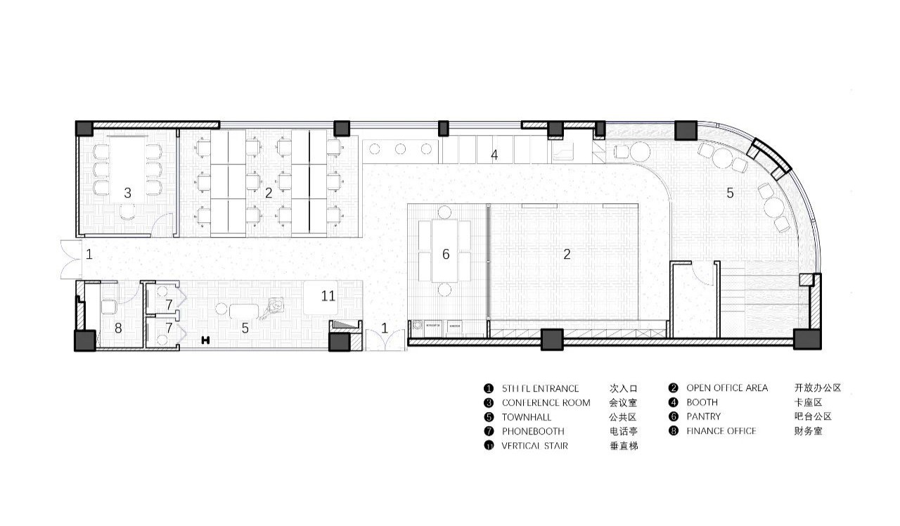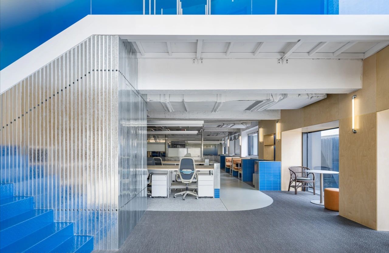 在节奏上,设计采用错位、收放、遮蔽等手法,不断将多样变幻的形式注入其内,在有效的工作秩序中增添趣味性与可读性,消解并破局狭长形态的固定感受。KLUE办公室中的纵向交通有两处,在尽头的步行梯结合了休闲的大台阶,满足同事间的非正式交流、阅读以及部分储物功能;而设在中间位置的消防爬梯则极富乐趣,使用者可以像在“超级马里奥”的游戏中一样,以最快速度穿行于上下两层,这对创意工作者而言极为便捷:当脑海中灵感闪现,身影也能随心而动,最大限度地节约交通时间。