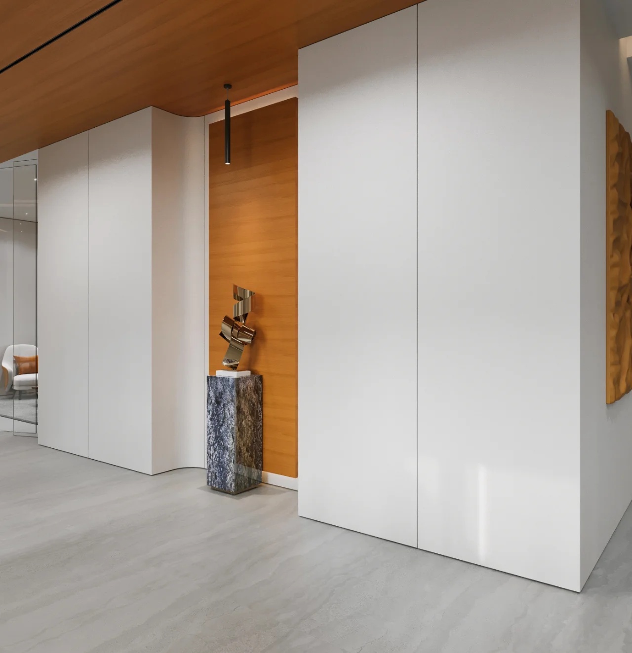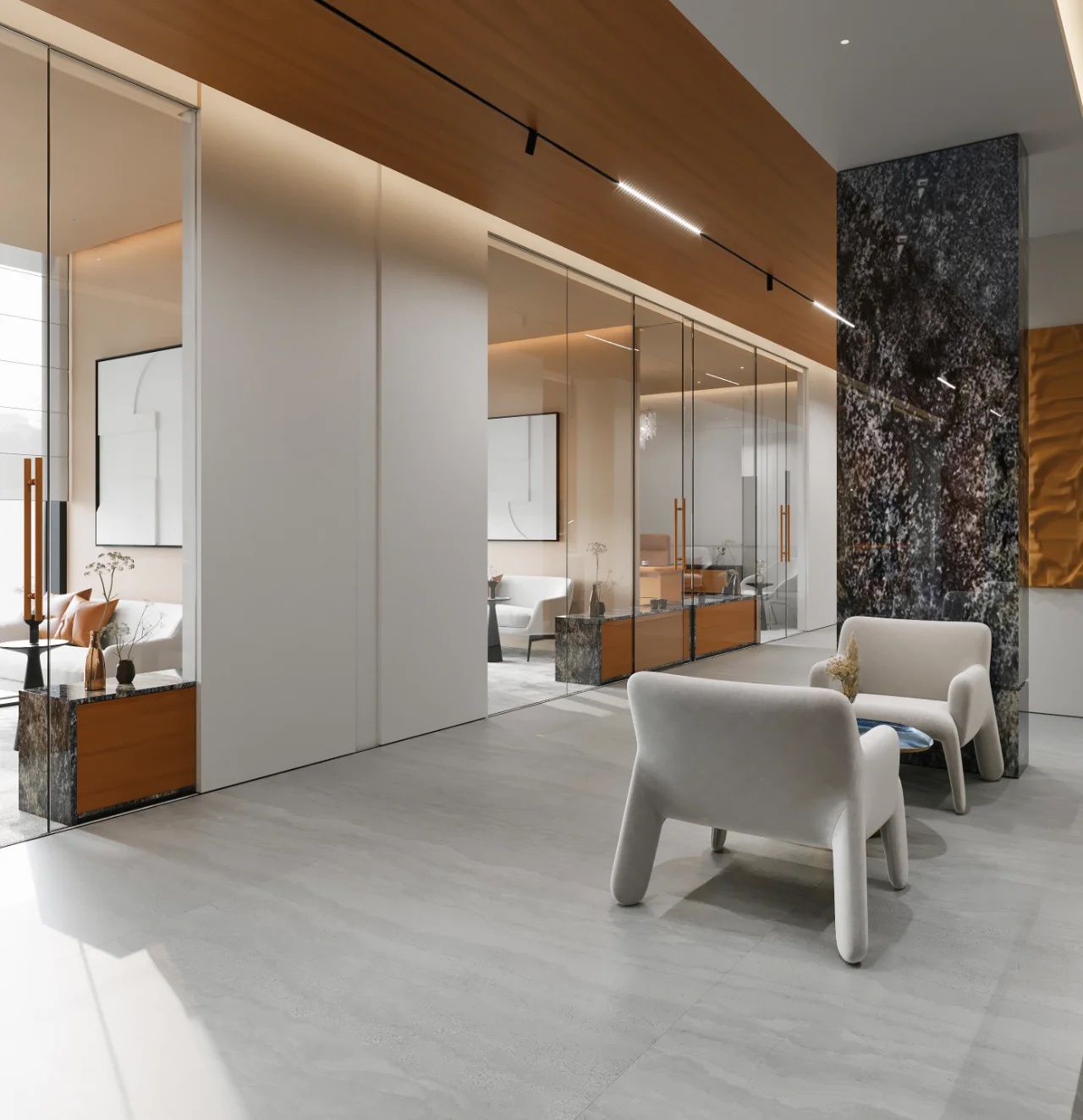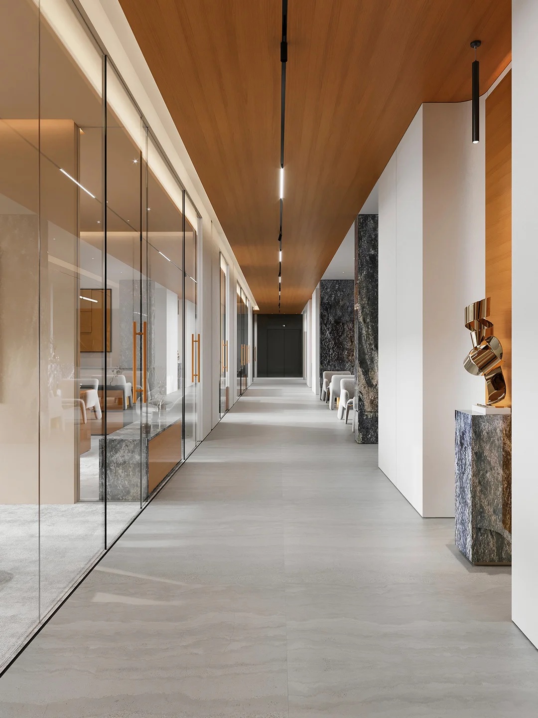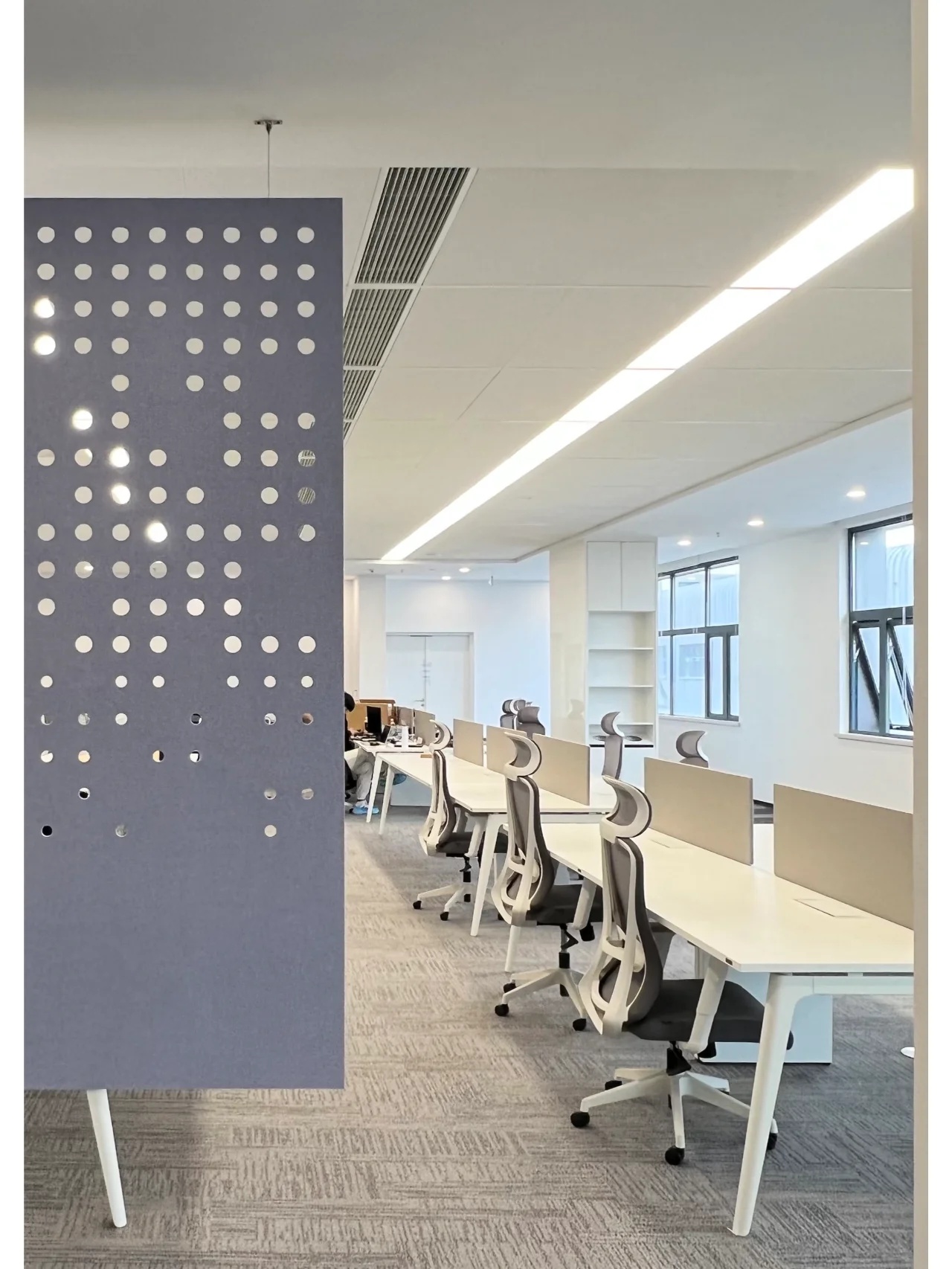 比如,我们将长形的空间想象成真实的“街道”,以具有半穿透效果的中空板,制造部份隔断,在保有隐私的同时,更展现开阔、流动的感受。