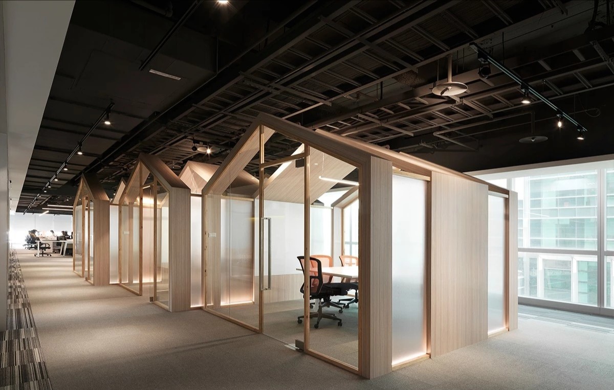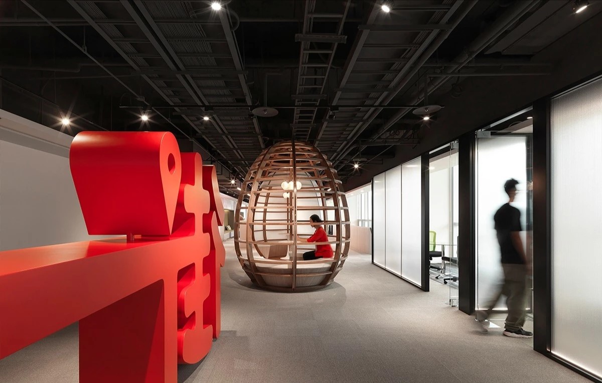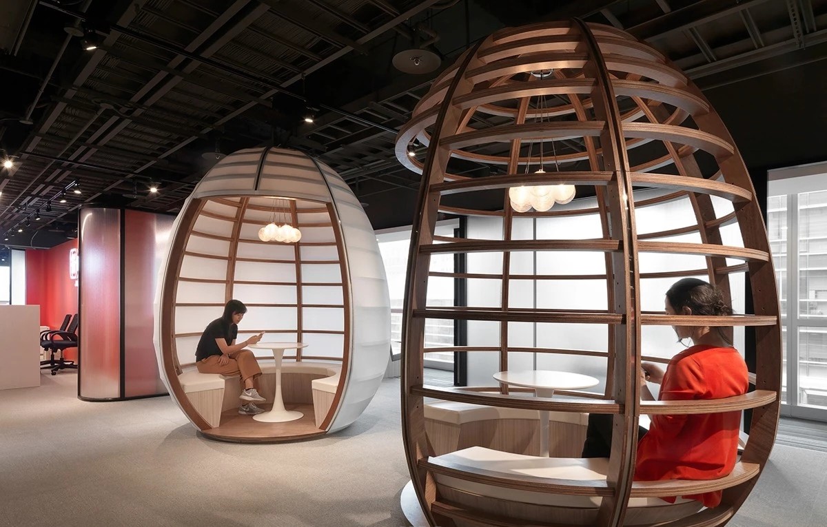小木屋、蛋椅在空间中让人不期而遇,童趣、安全感的氛围,促使团队讨论的氛围更加愉快,让工作流程更加顺畅。
